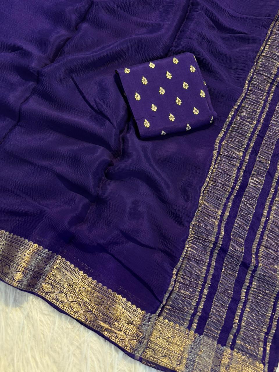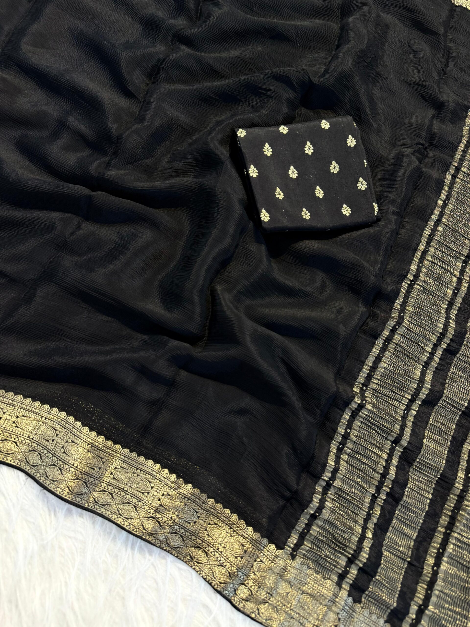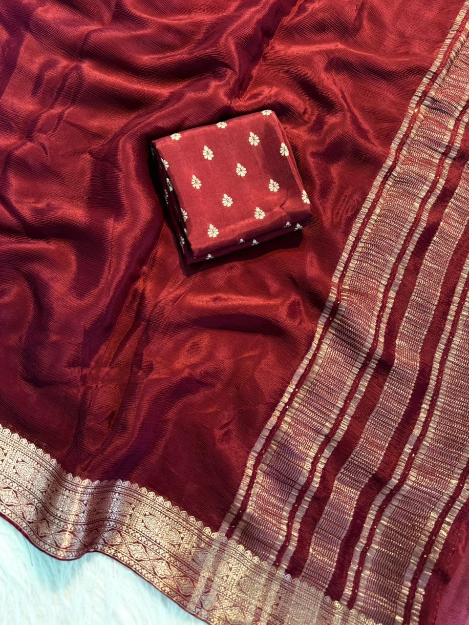 Crafted from pure viscose soft Chinon, this graceful saree features a beautifully designed chit pallu with intricate all-over weaving. Enhanced with rich zari borders on both sides and a subtle sequin line detailing on the pallu, it offers a perfect blend of tradition and elegance.