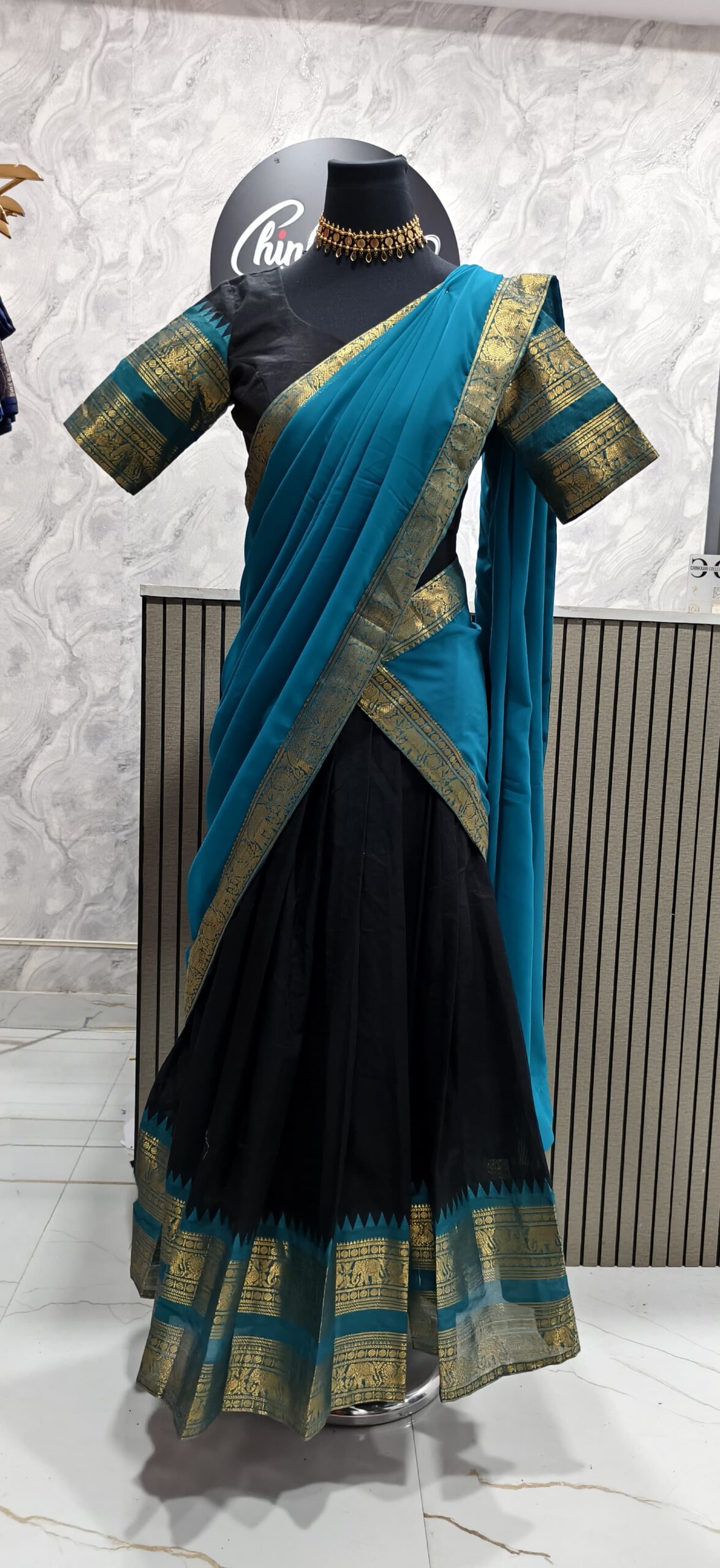 Step into timeless elegance with this beautifully curated Dhavani Set, crafted using premium Kanchi Cotton and soft Georgette for a perfect blend of heritage and comfort. Ideal for traditional functions, poojas, or festive wear, this unstitched set allows you to tailor your own graceful Langa Voni (Half Saree) ensemble.