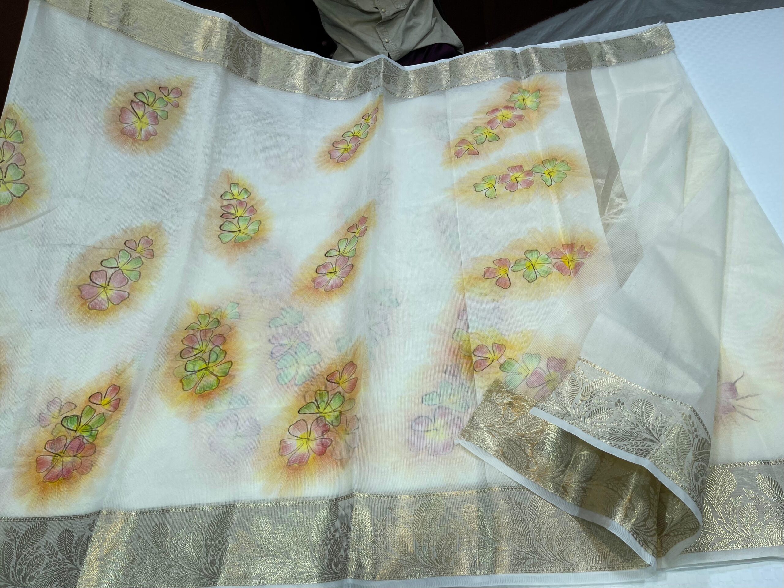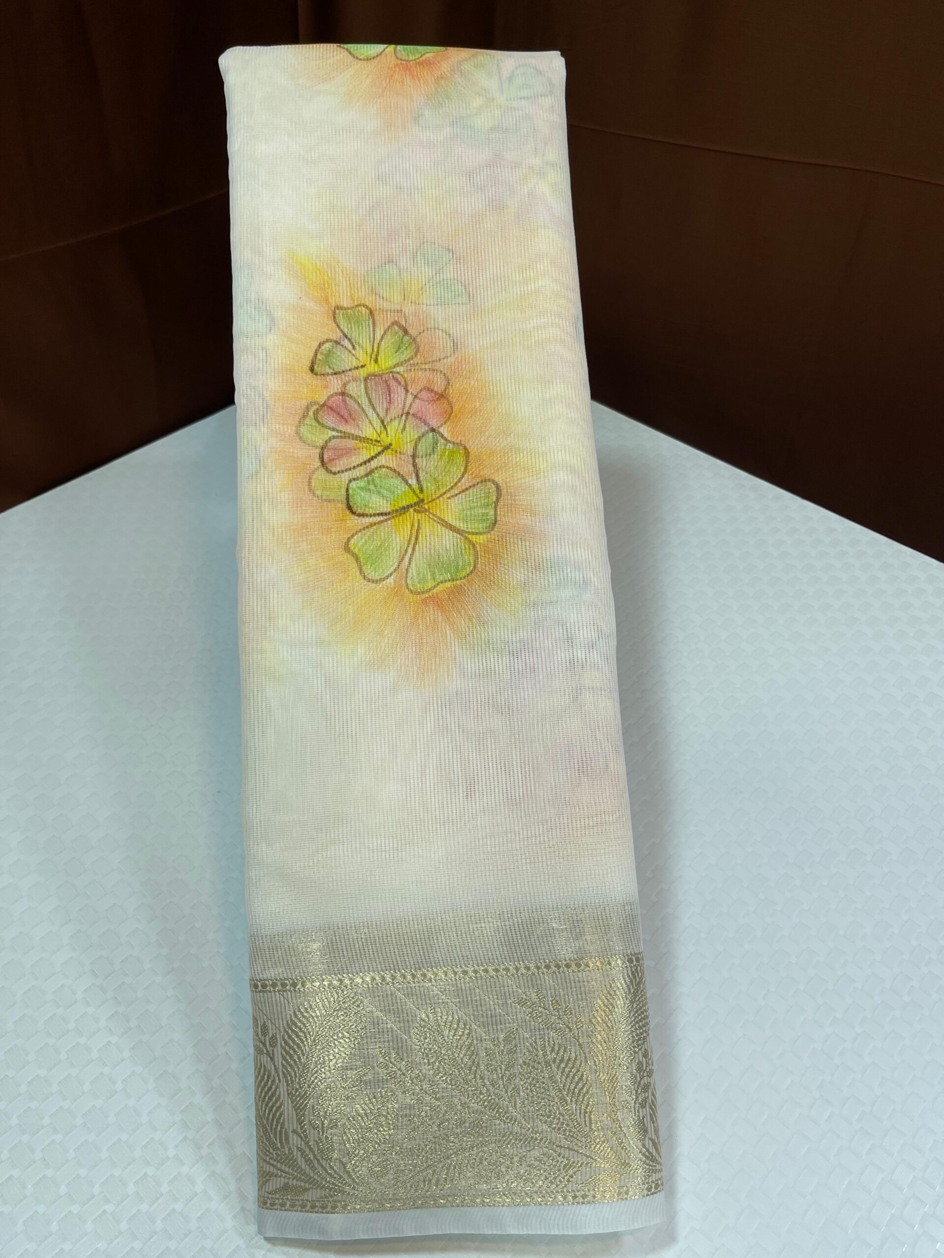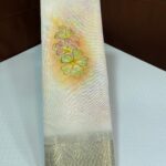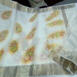Classic semi banarasi kota silk with one of its kind fully Tassar shades with almond net borders combined with the newest hand painted butas on the inside in elegant floral colors that covers pallu as well