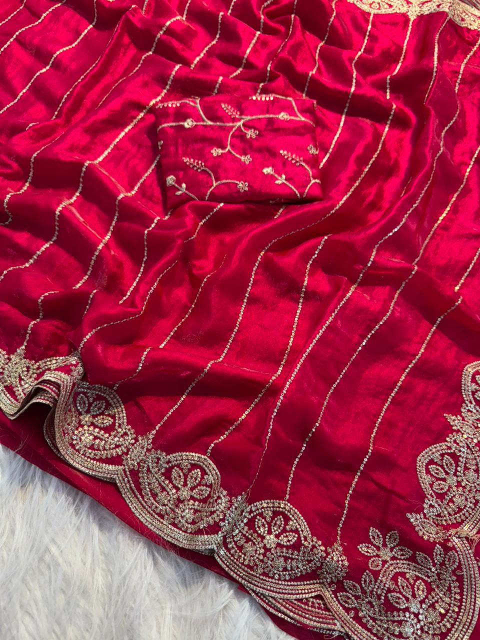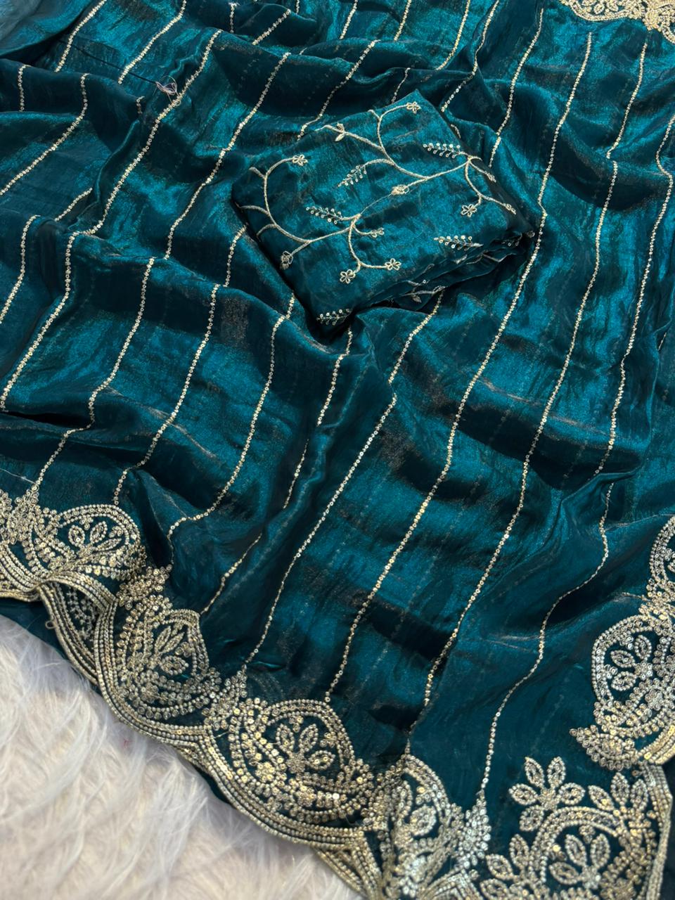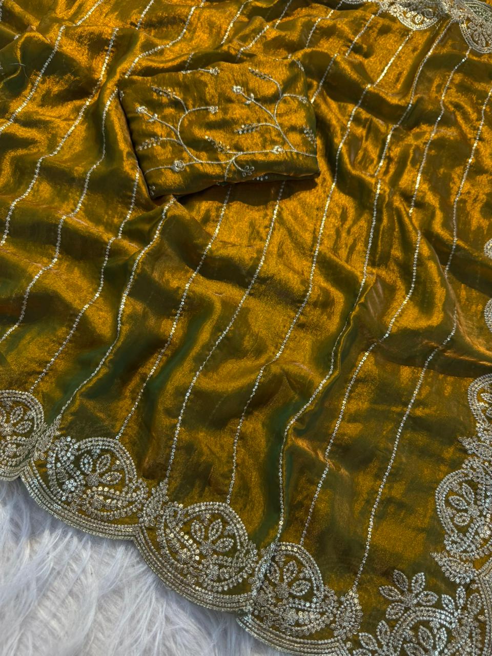 Experience elegance in every drape with our Fendy Satin Saree, featuring premium multi-sequence embroidery work that adds a rich and sparkling finish. Crafted on smooth Fendy satin, this saree offers a luxurious fall and festive shine.