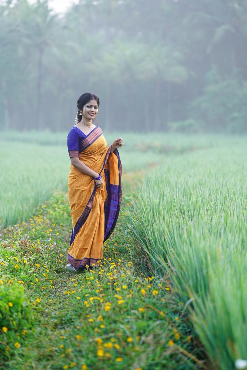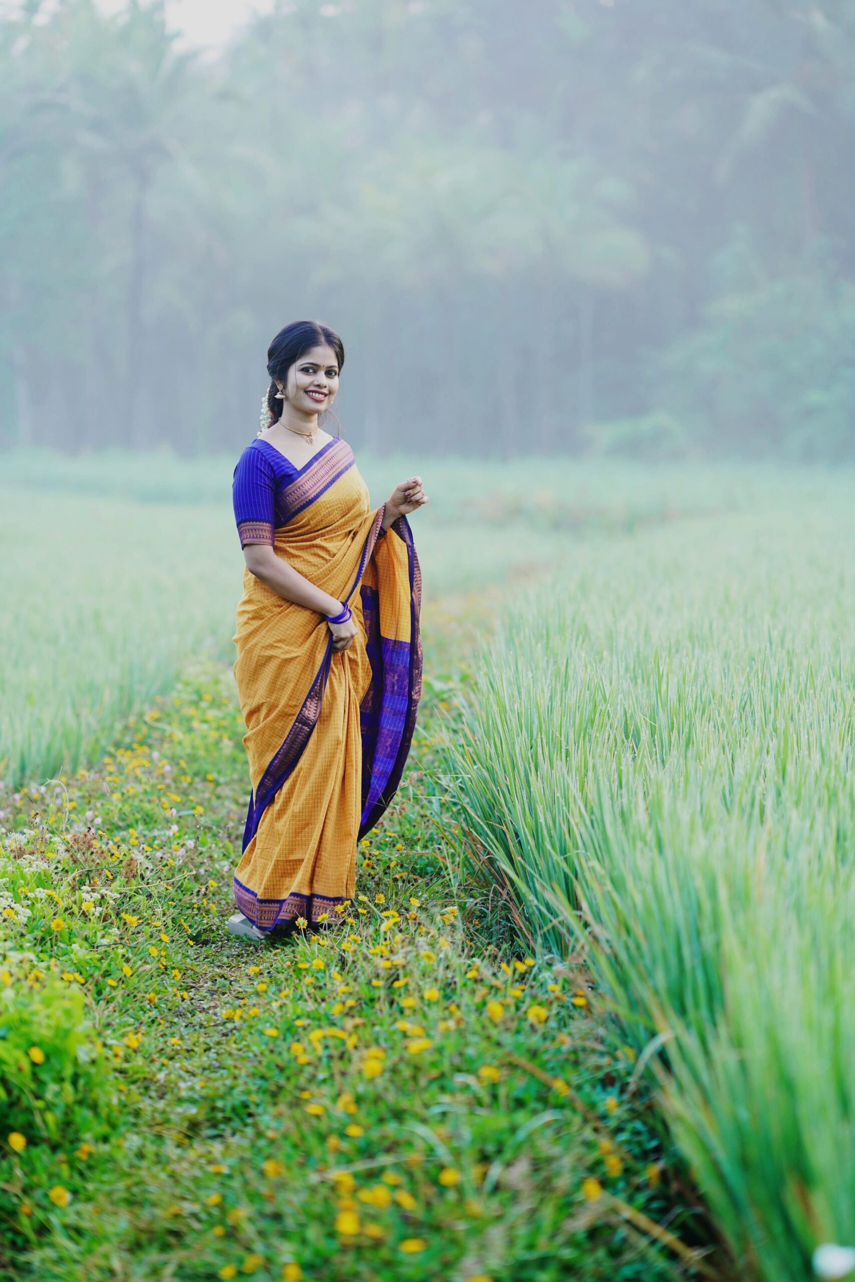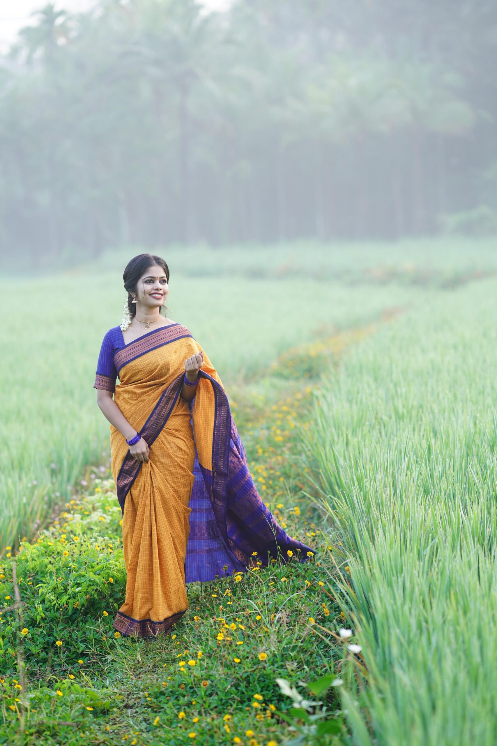 Elegant Kalyani cotton saree crafted in soft, breathable fabric with a graceful drape. Featuring a simple body with a contrast woven border and classic pallu, this saree is perfect for daily wear, office, and traditional outings. Comes with a matching blouse piece.