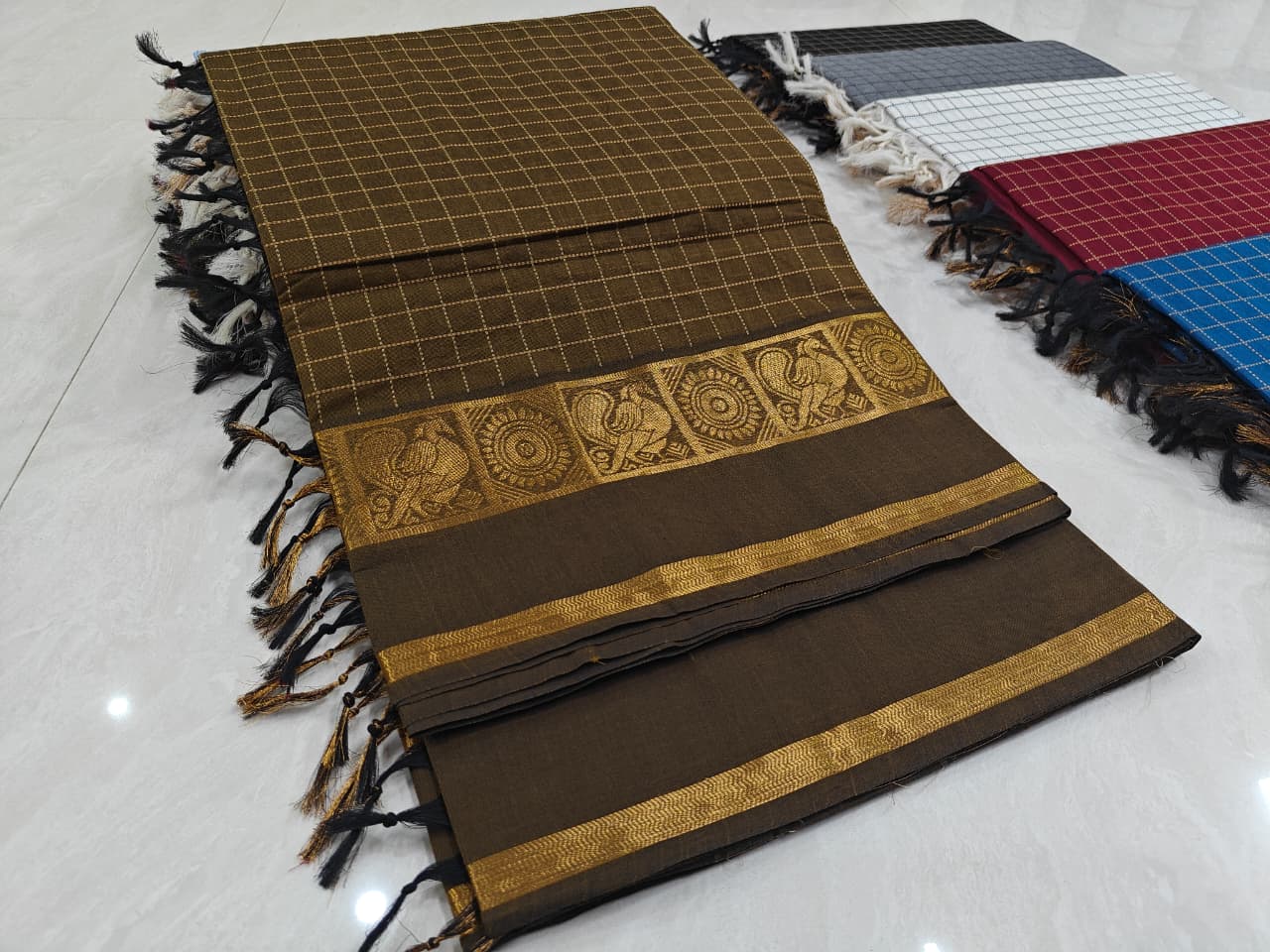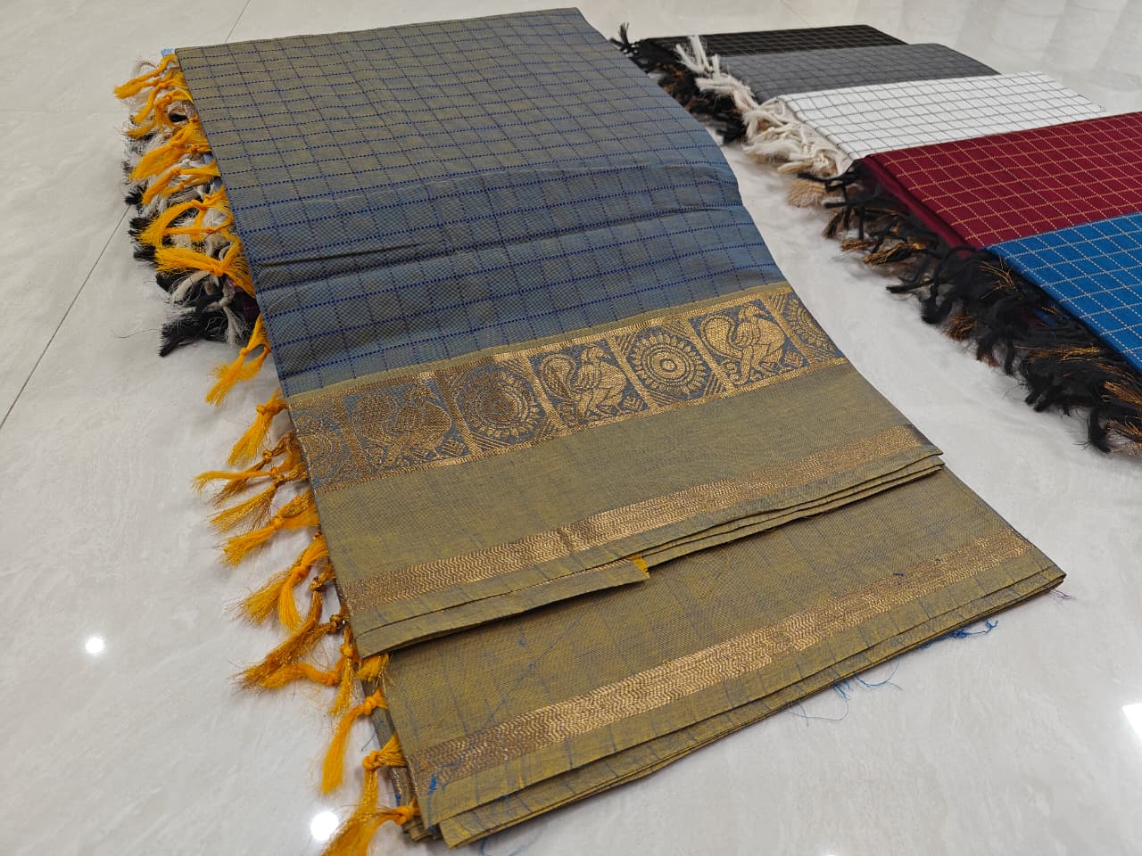 Experience the richness of traditional craftsmanship with our exquisite Korvai Kanchi Cotton Sarees. Featuring classic handwoven contrast borders and a soft, breathable texture, these sarees bring unmatched elegance and comfort to your wardrobe. Perfect for festive wear, functions, and graceful everyday styling.
