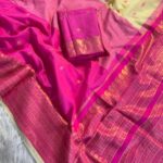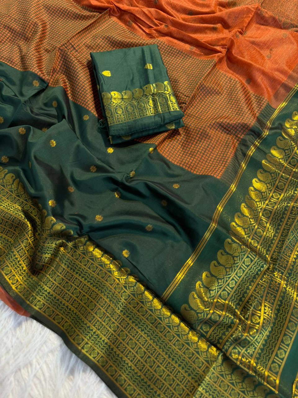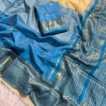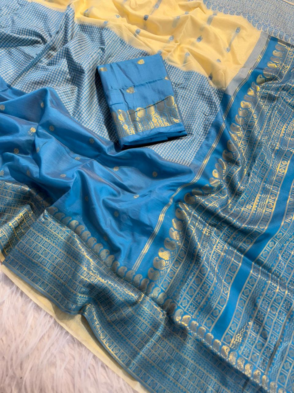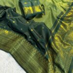 Experience elegance with this beautifully crafted Kalyani cotton saree, enriched with gold zari work for a subtle festive shine. The saree features delicate butti motifs all over, adding charm and grace to the overall look.