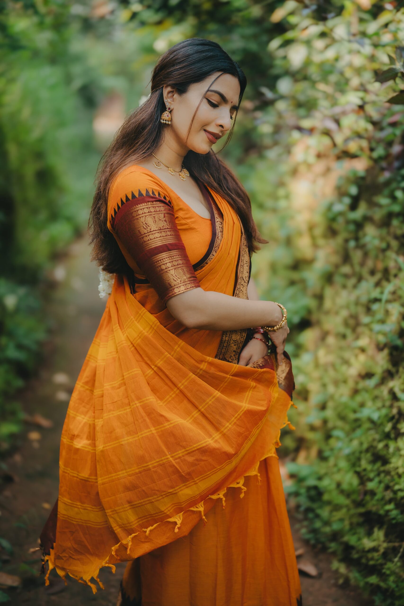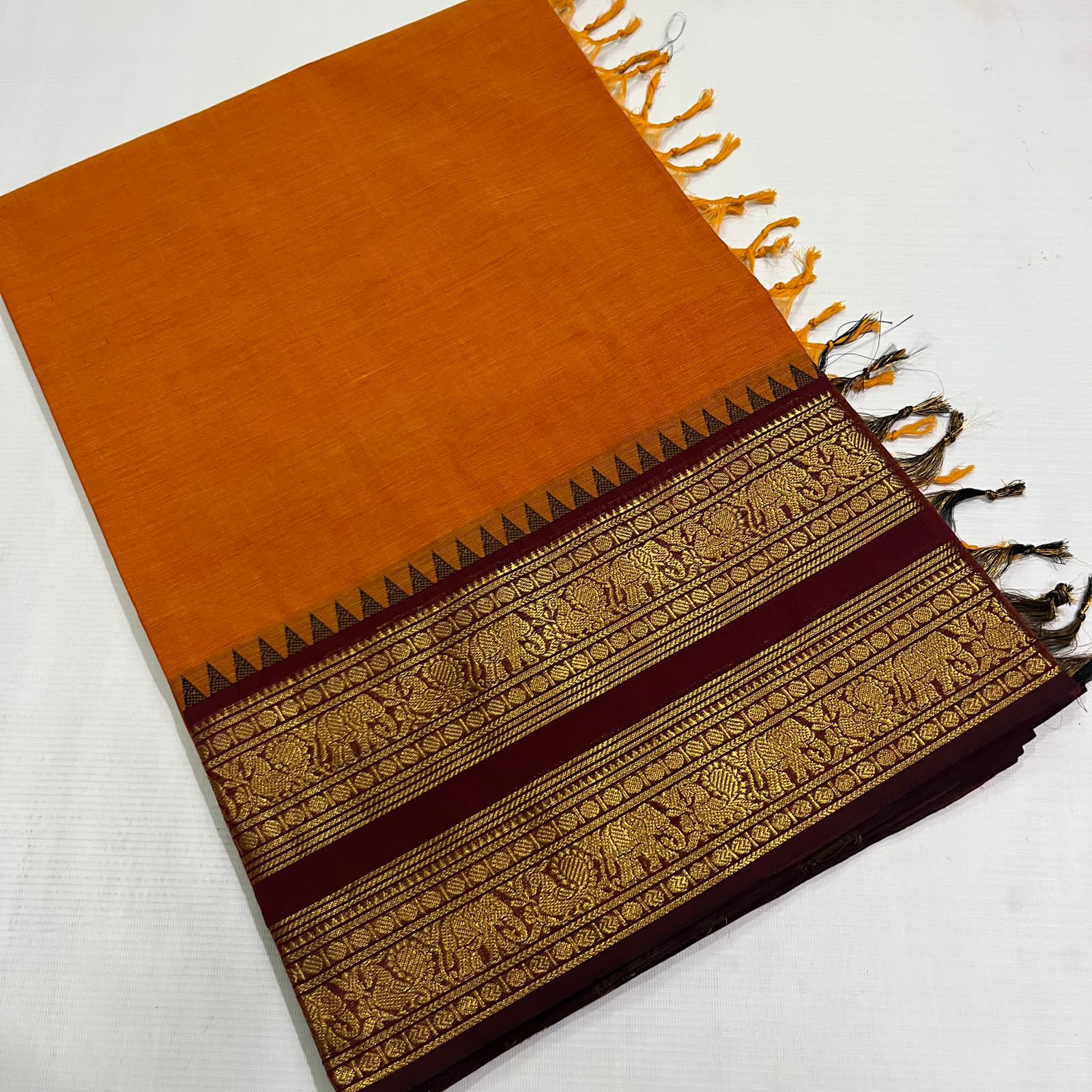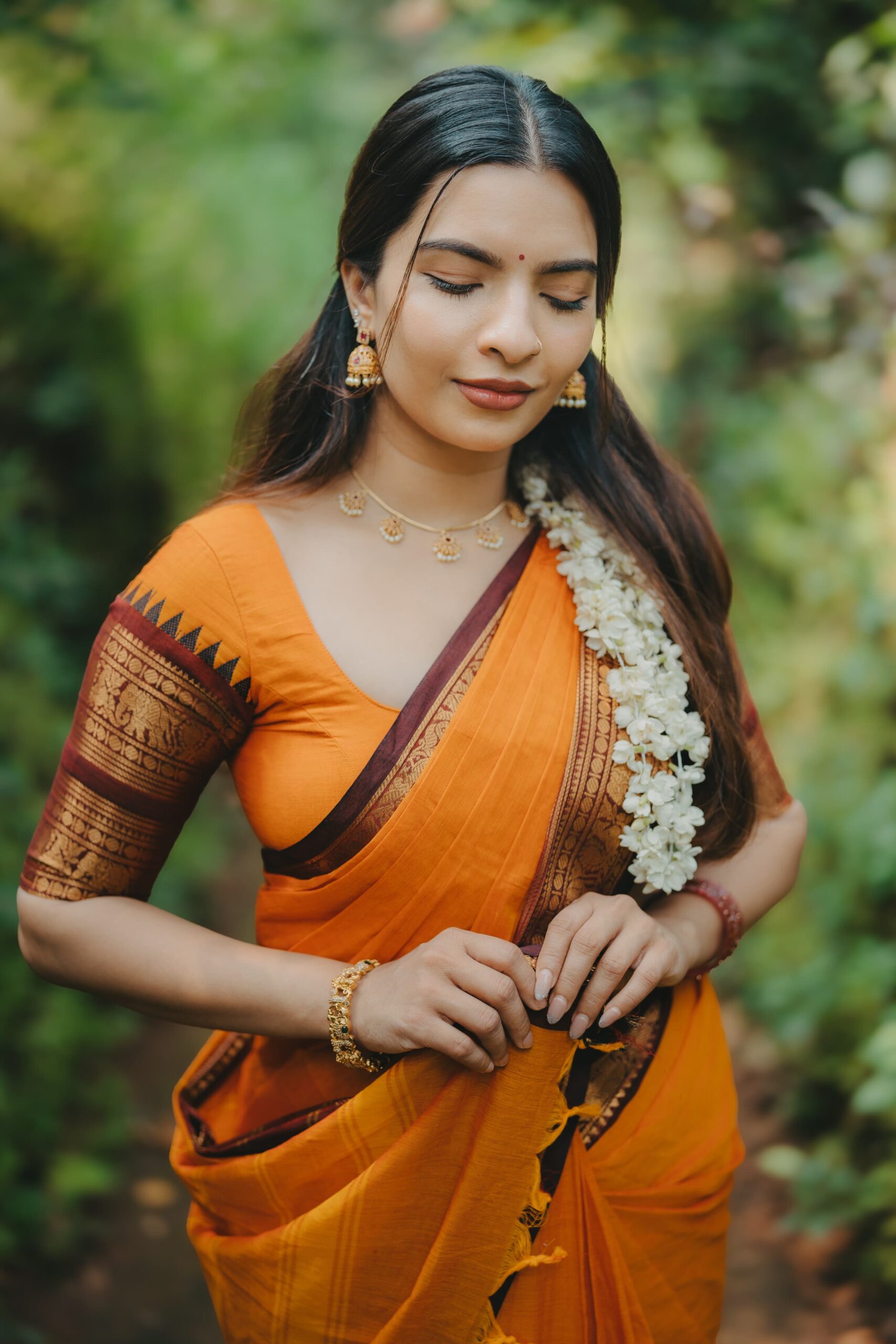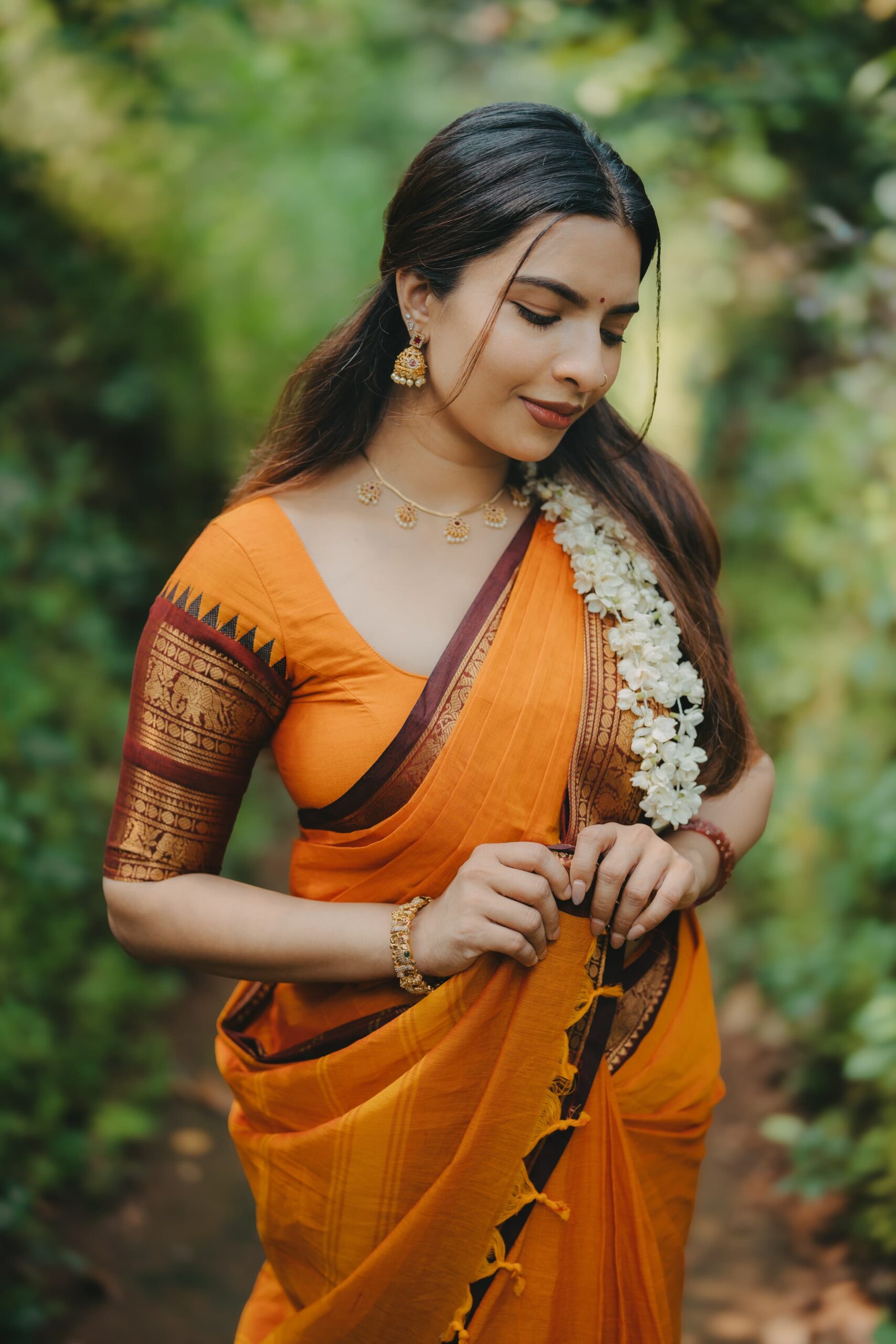 Celebrate the essence of South Indian heritage with this Premium Kanchi Cotton Saree, known for its fine weave, durability, and timeless elegance. Crafted with care, this saree combines the rich tradition of Kanchipuram-style weaving with the softness and breathability of pure cotton — perfect for all-day comfort in any season.