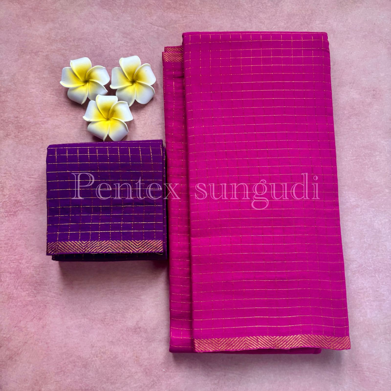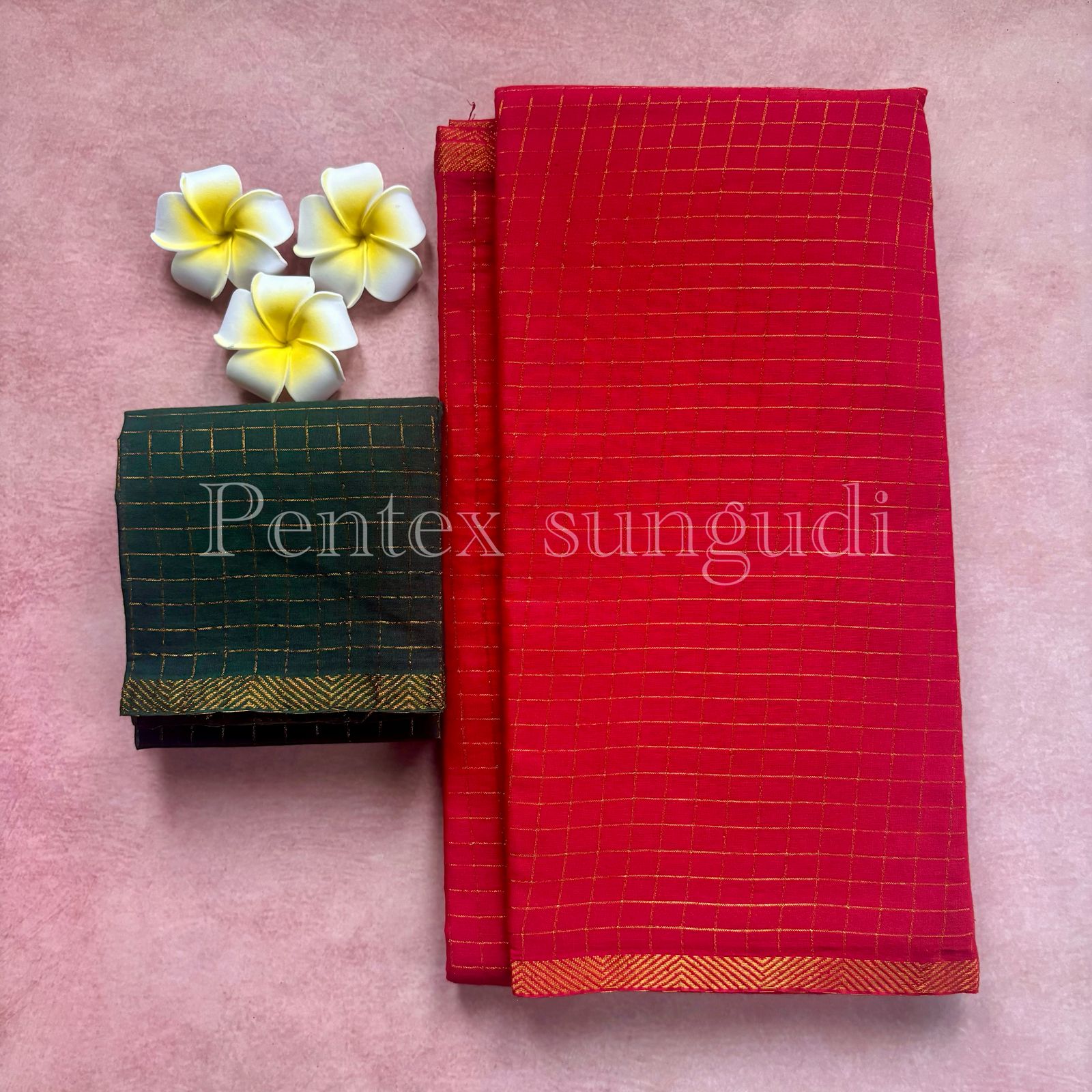 Features a beautiful checked (kattam) pattern enhanced with rich golden zari and paired with a contrast Sungudi blouse for a complete classic look.
