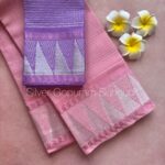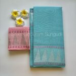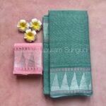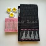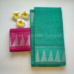 A beautiful blend of tradition and elegance, this saree features gopuram-style silver zari kattam weaving across the body, paired with a contrast sungudi blouse to enhance its charm and classic look.