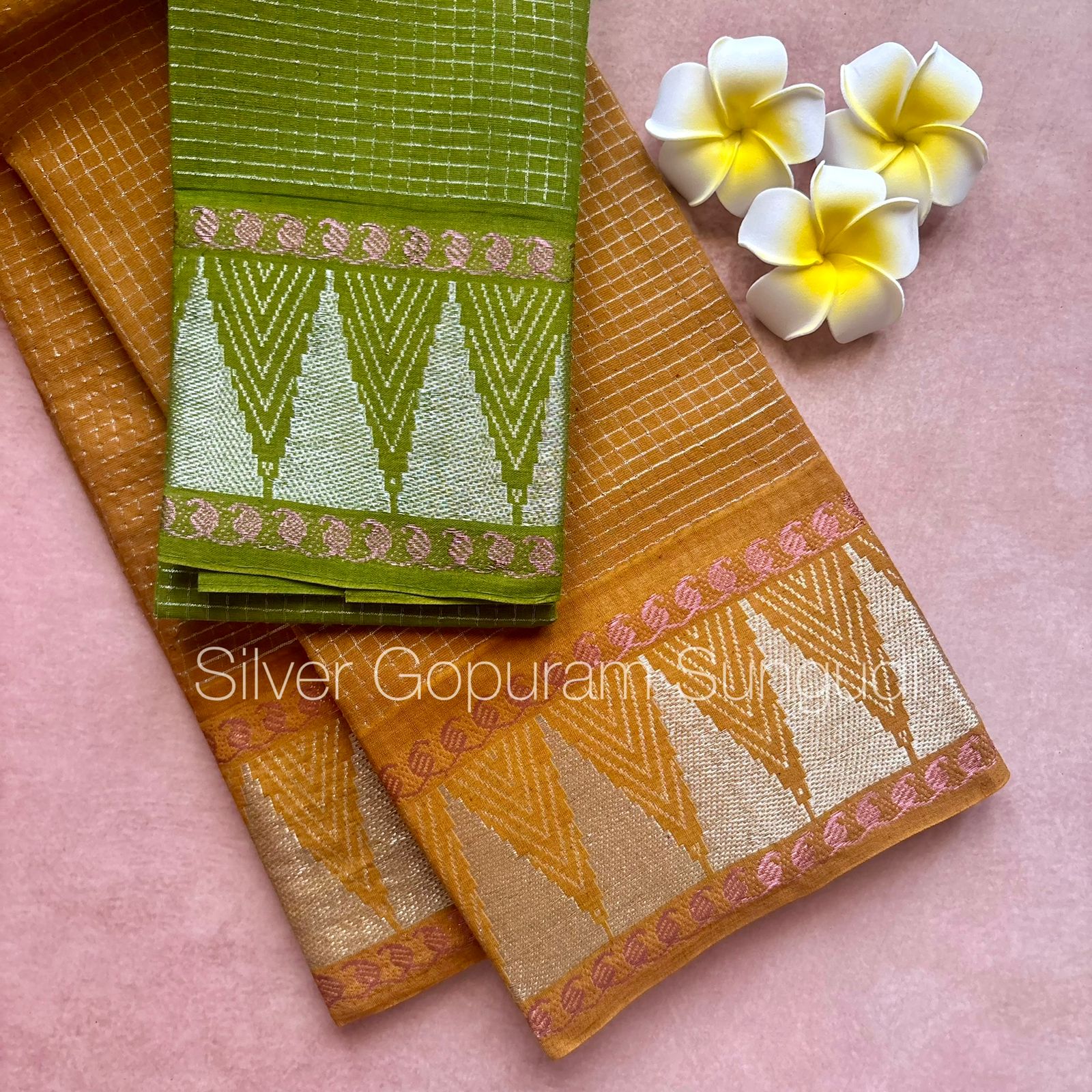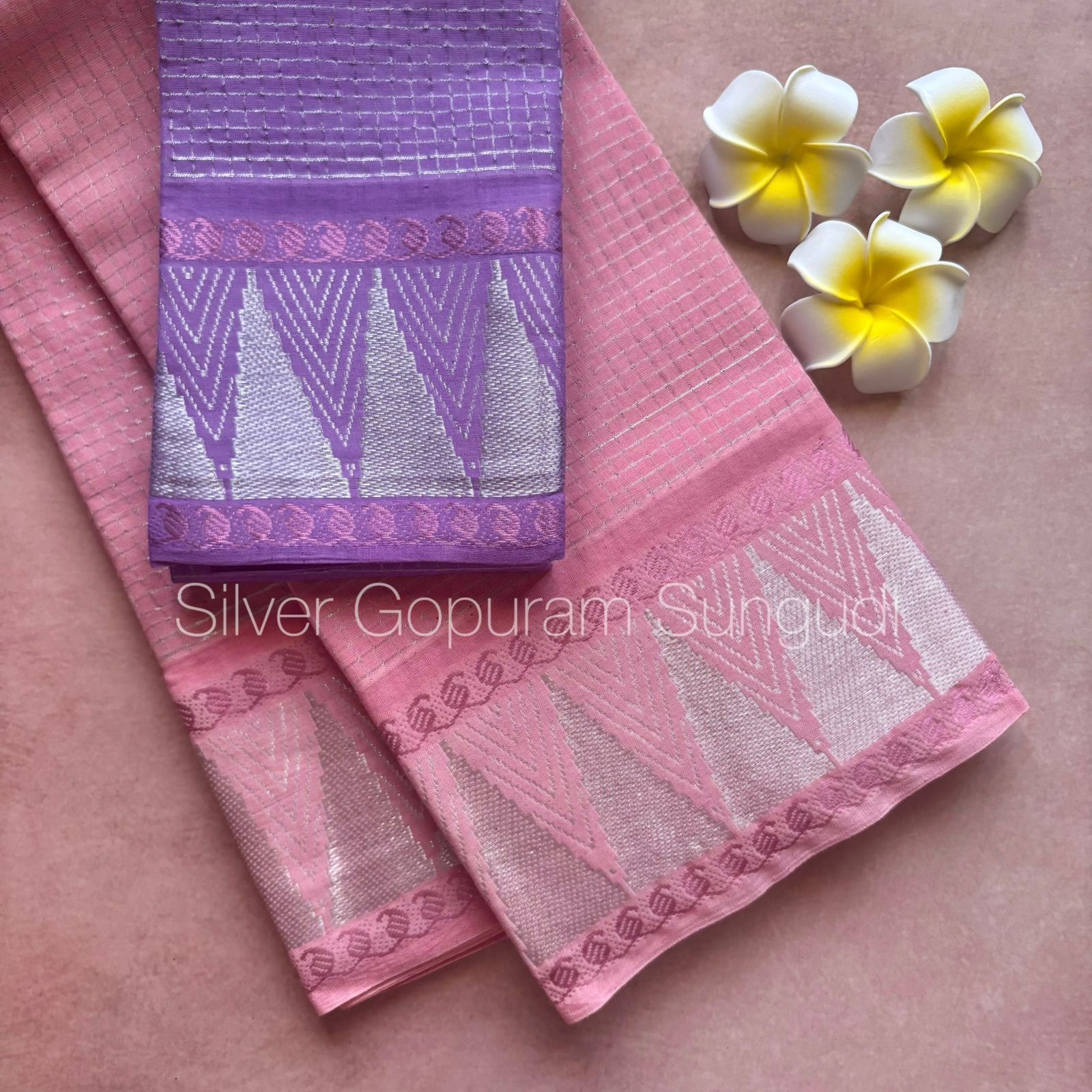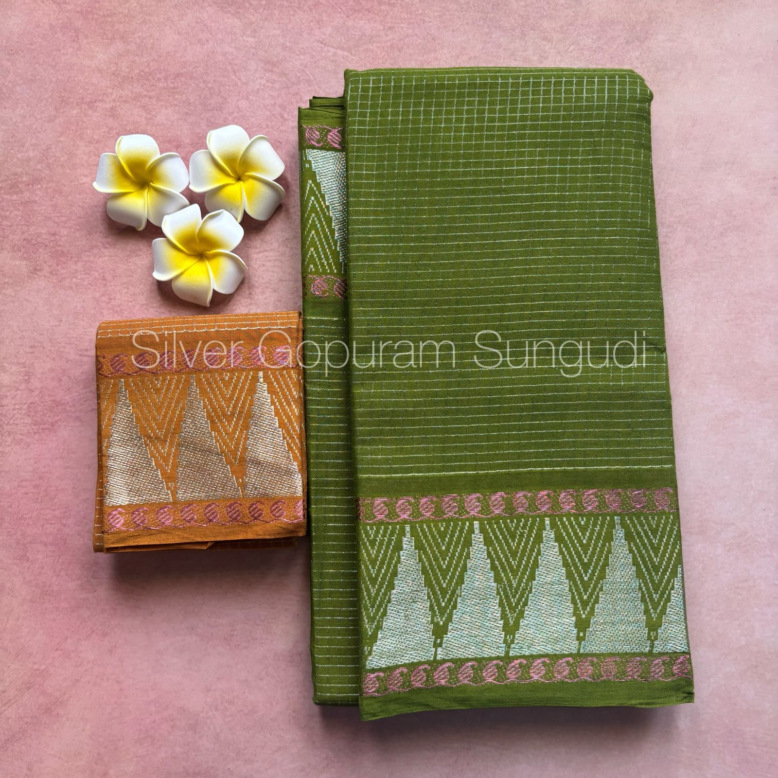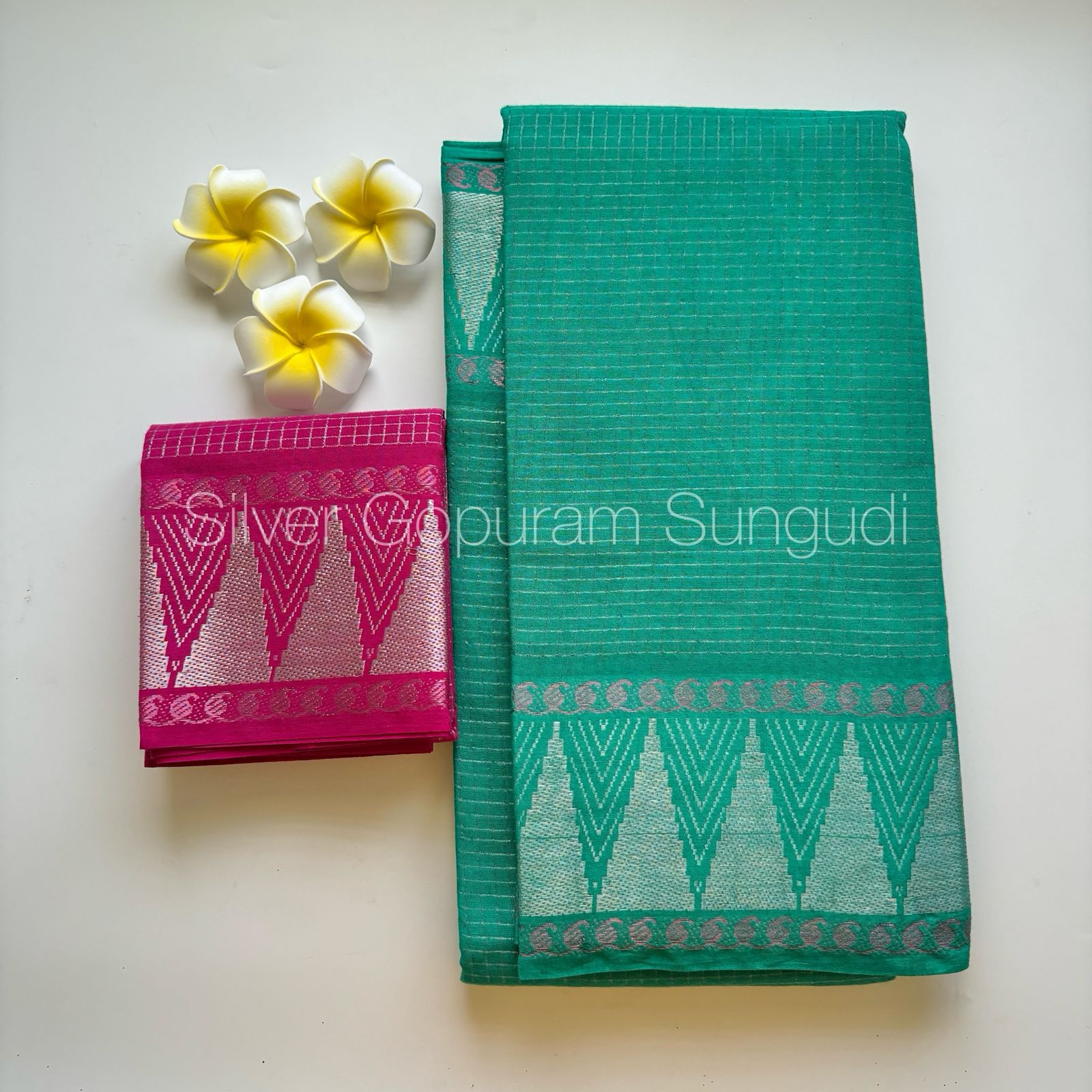 🌷 Premium Quality Gopuram Silver Zari Kattam Sungudi Cotton Saree