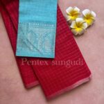 Experience the elegance of traditional craftsmanship with this premium silver Pentex Sungudi cotton saree, beautifully finished with a contrast Sungudi blouse. Perfect for daily wear or special occasions, this saree blends comfort with classic style.