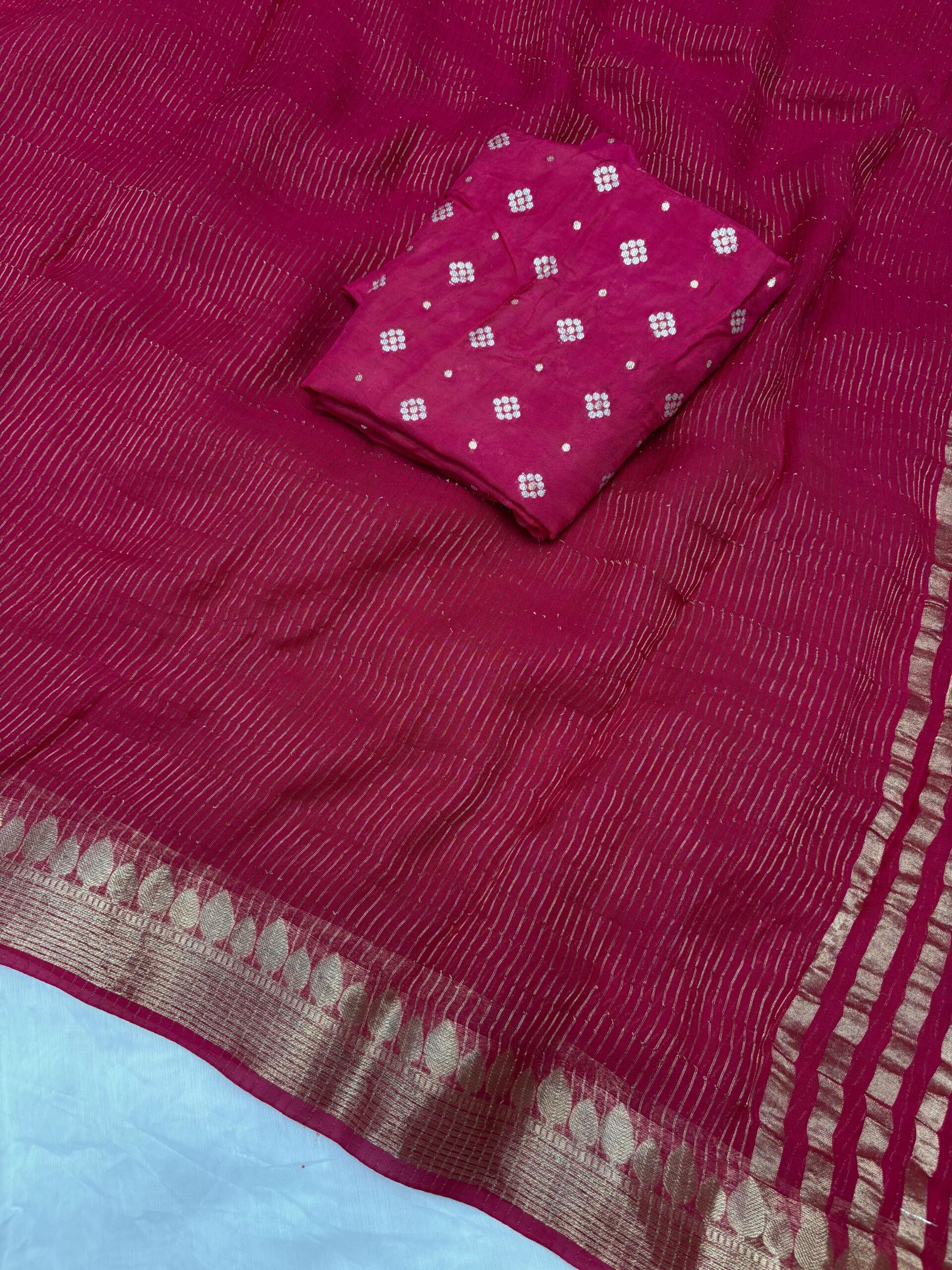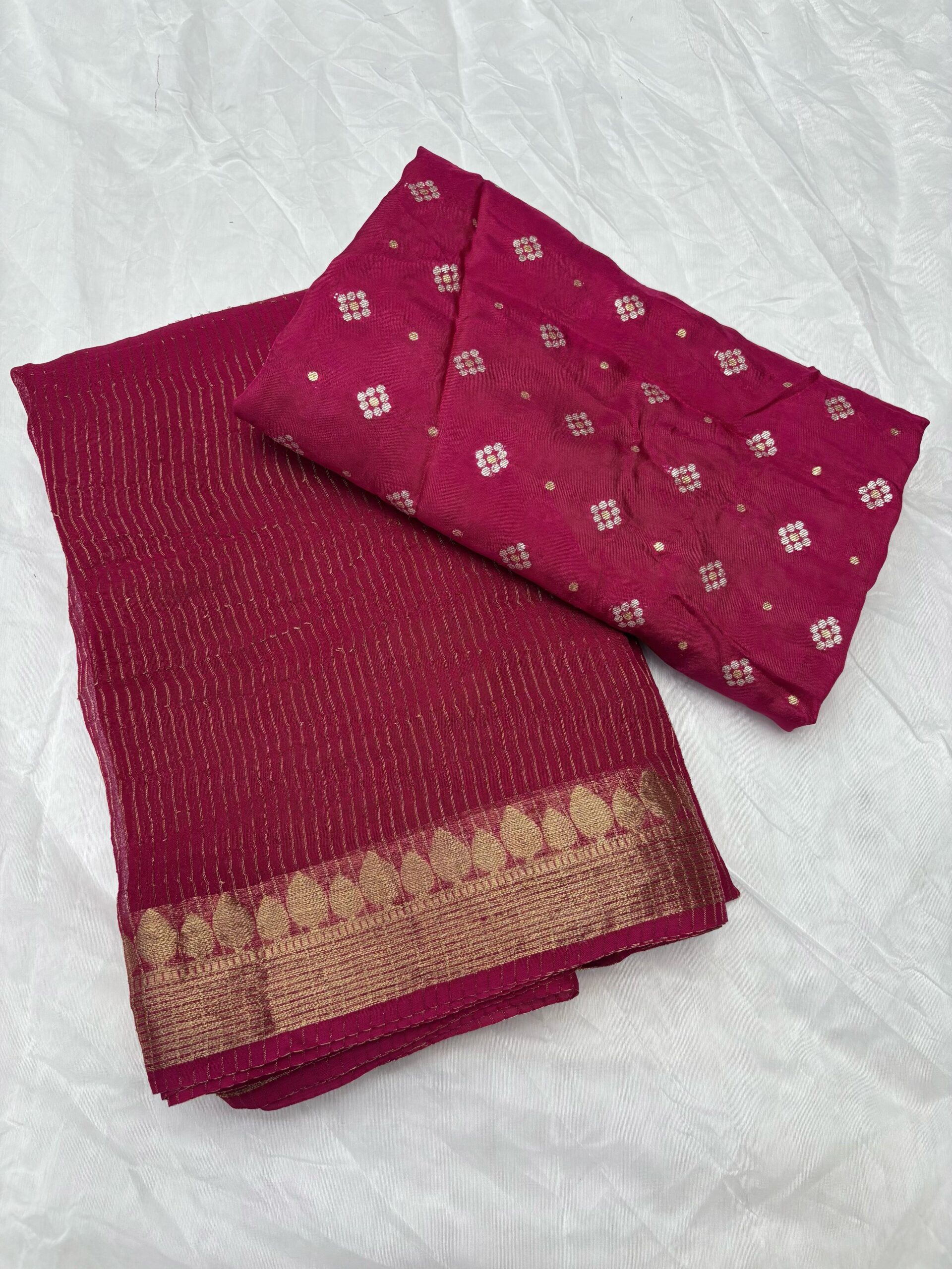 The lightweight pure viscose georgette fabric offers a delicate, flowing silhouette that flatters every body type, while providing unmatched comfort and grace. The saree is intricately designed with a pure zari lurex pattern, adding a gentle shimmer and festive glow that catches the light beautifully with every step.