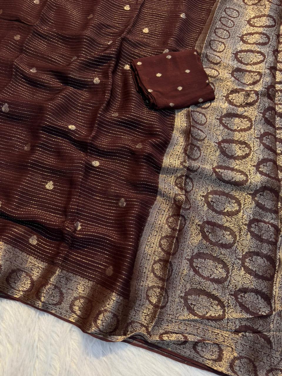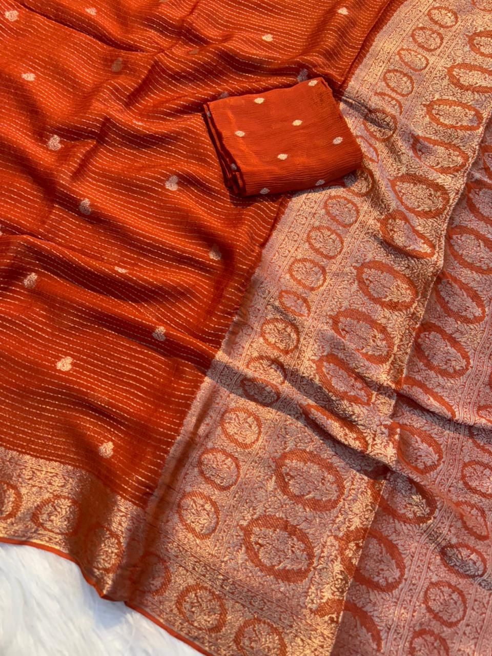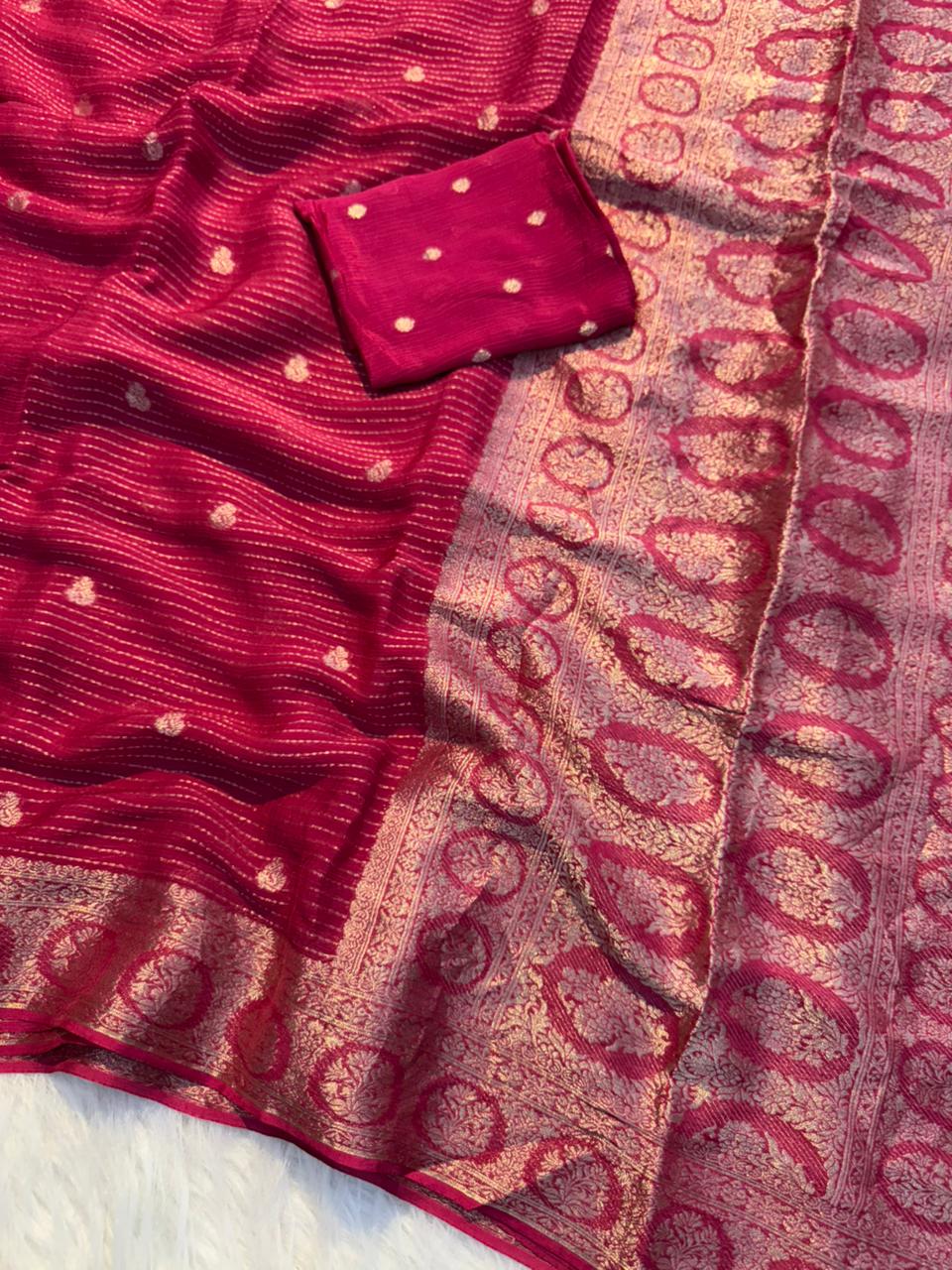 Fabric :- pure viscose soft Chinon rich pallu with all over lining with small butti with jari border both side