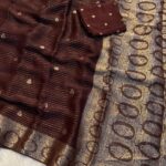 The saree features an all-over lining pattern adorned with delicate small butti motifs, creating a subtle yet captivating design across the drape. The intricate weaving adds depth and refinement, while the rich pallu elevates the overall look with a graceful charm.