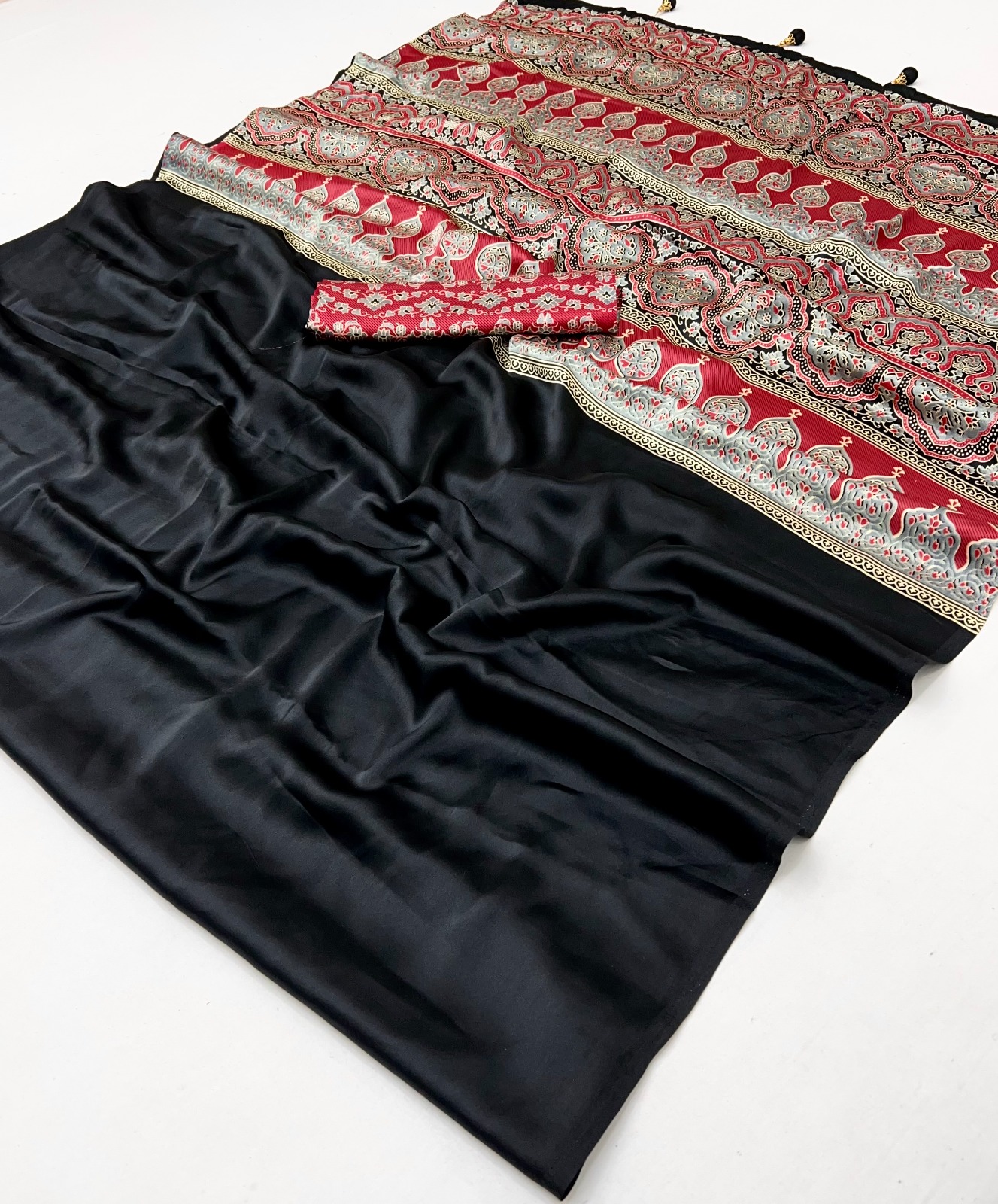 Design: Elegant plain body paired with a beautifully crafted Ajrakh pallu