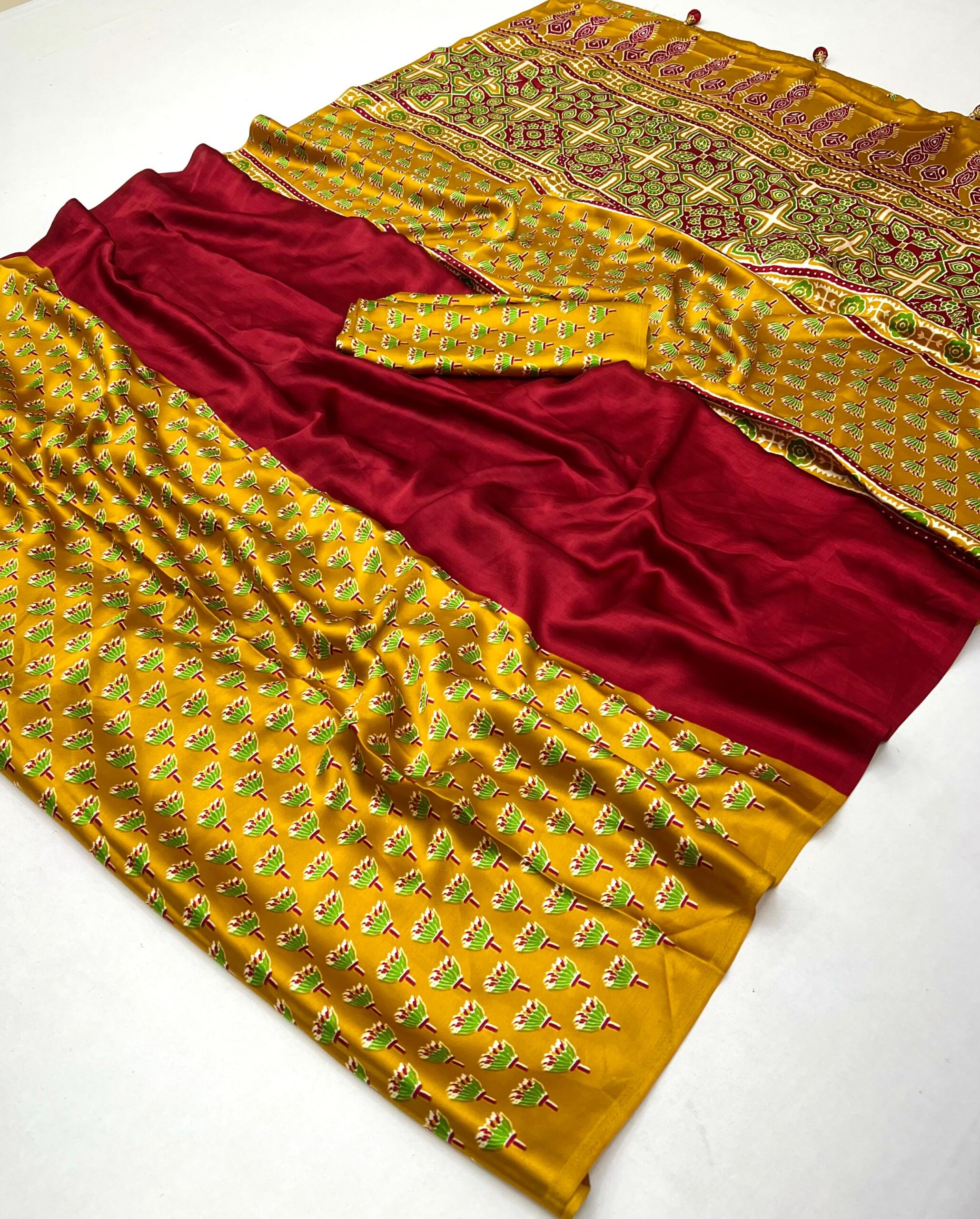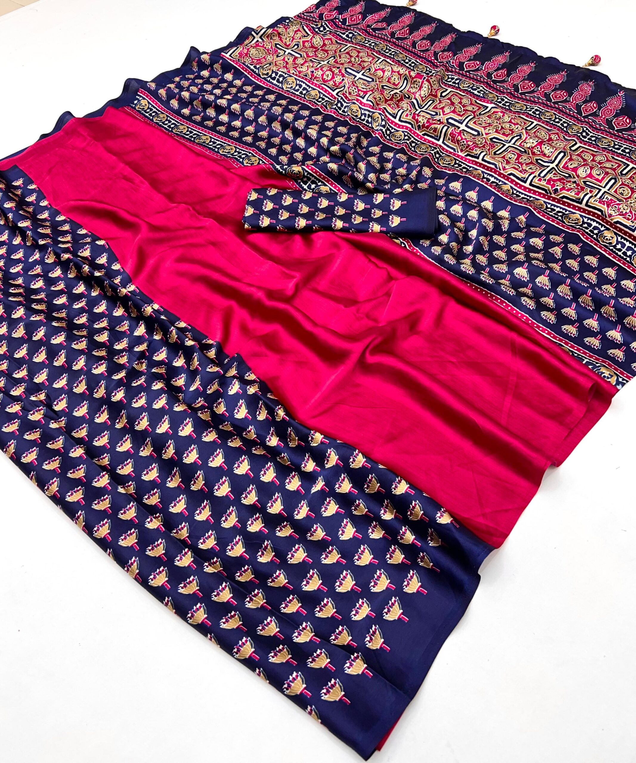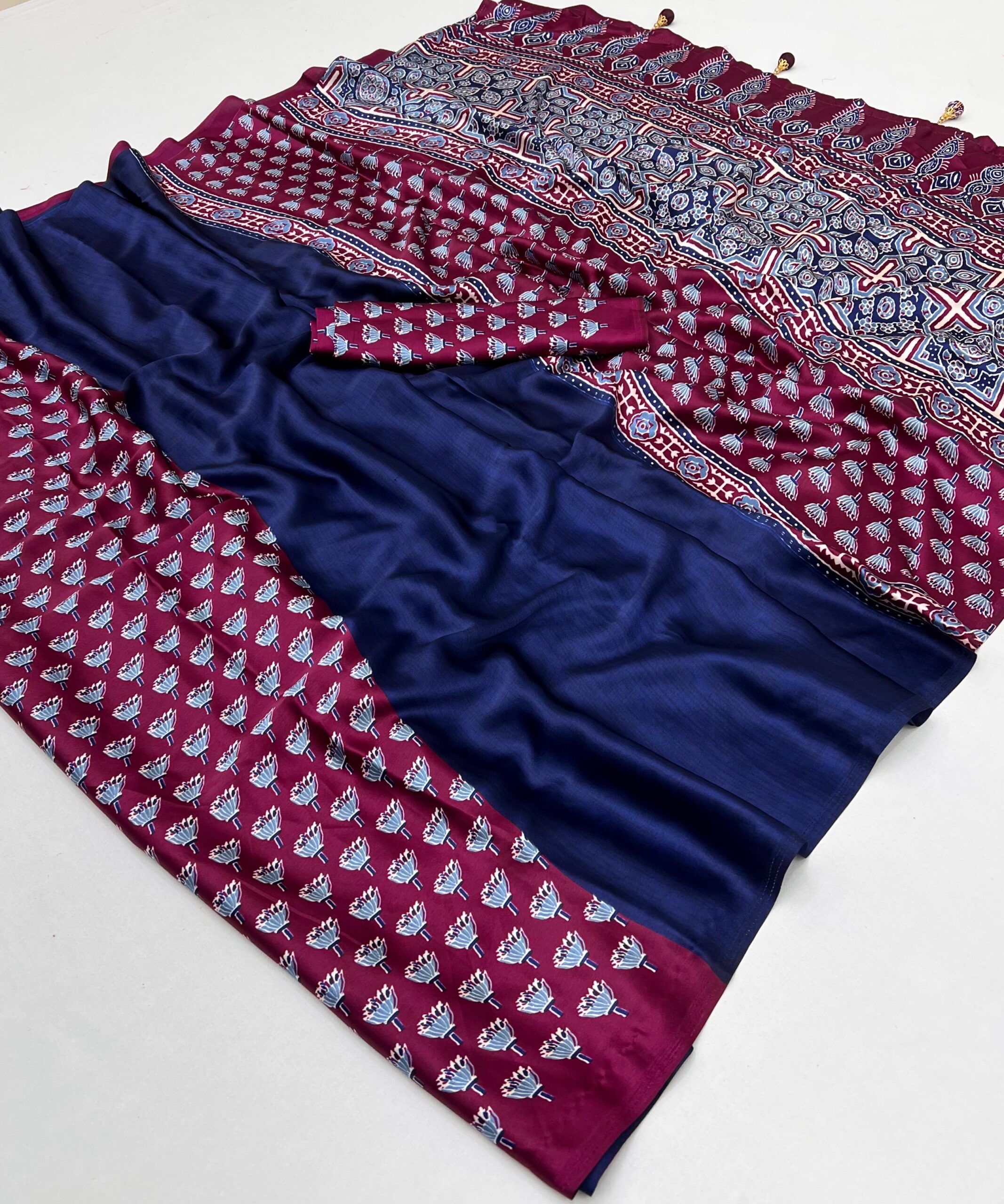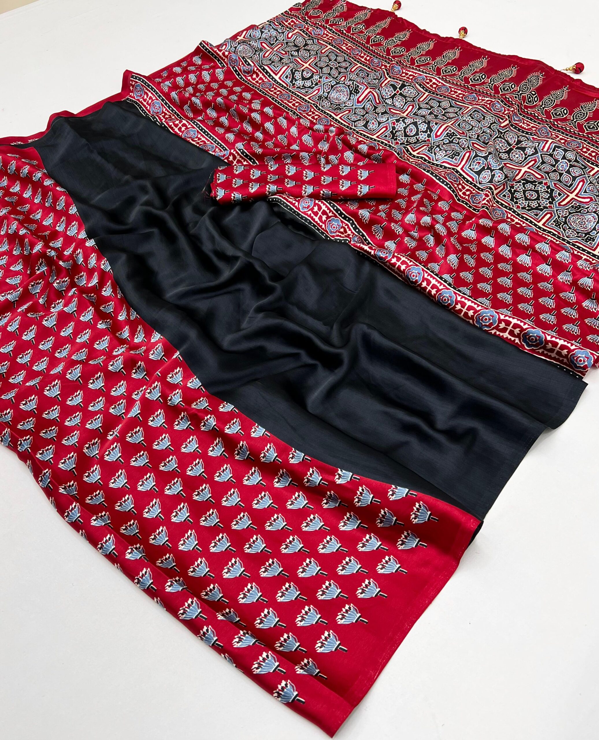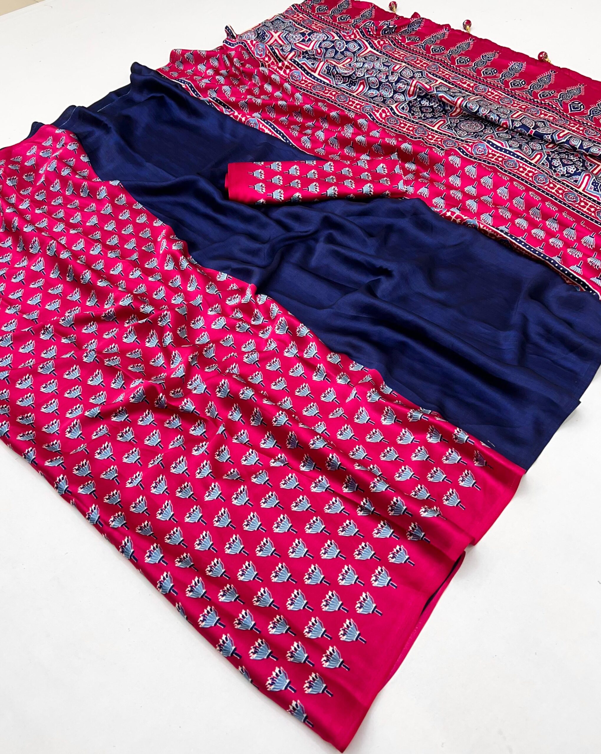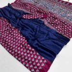 Design: Features a stunning Ajrakh pallu, Ajrakh pleats, and Ajrakh blouse