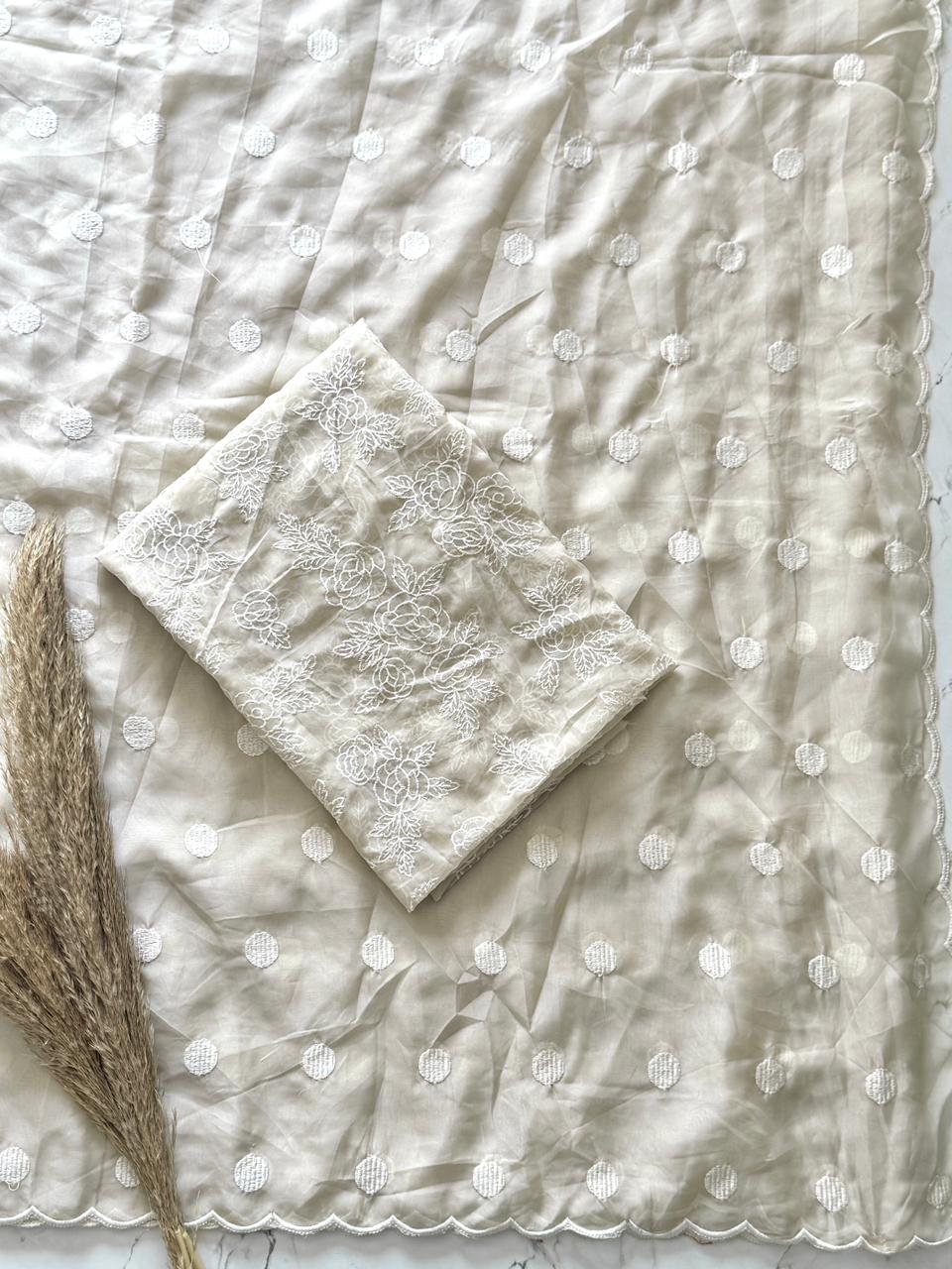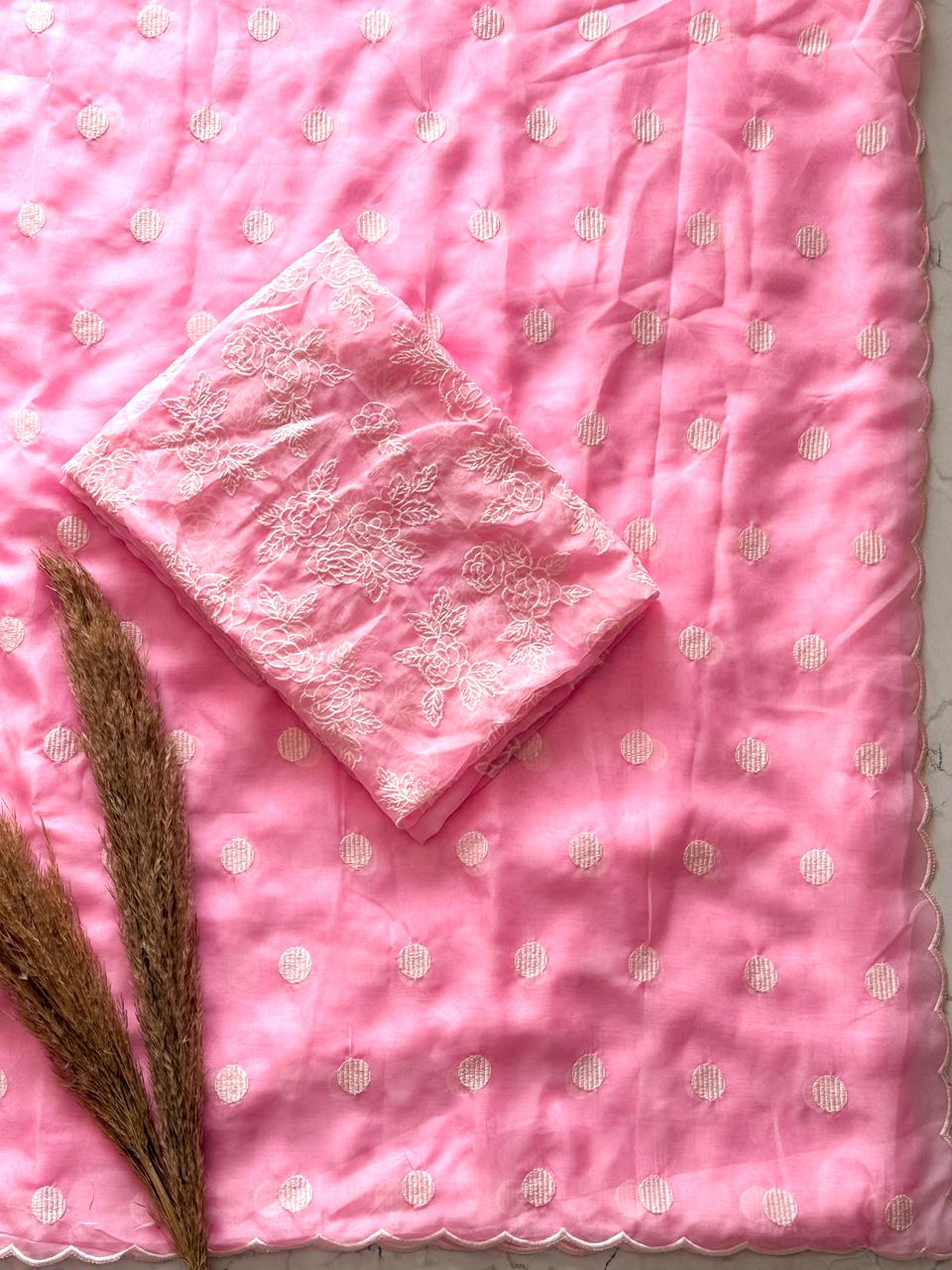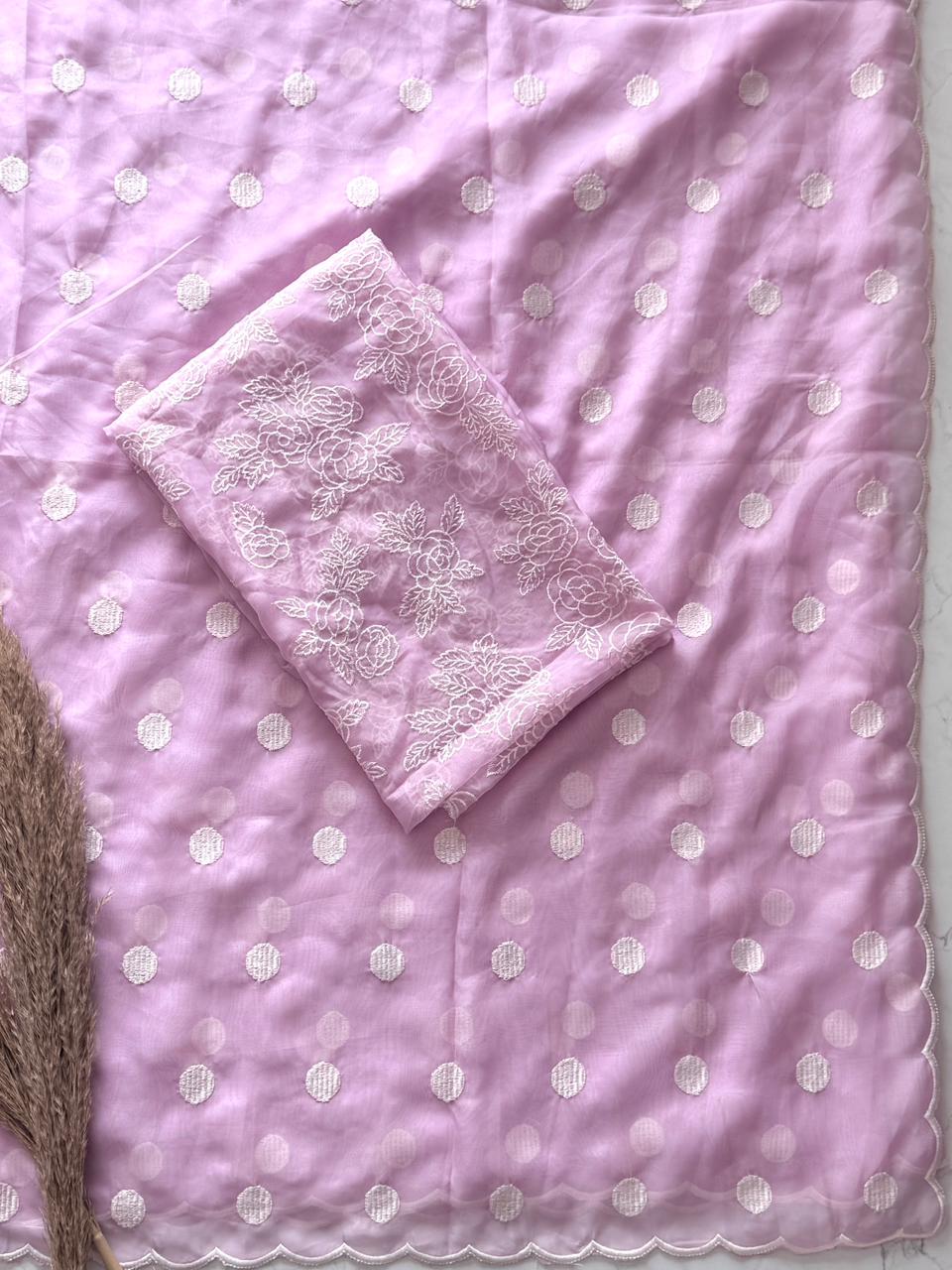 Elegantly crafted in premium soft organza, this saree features delicate polka dot thread work all over, complemented by a beautifully detailed scallop border that adds a graceful finish.