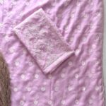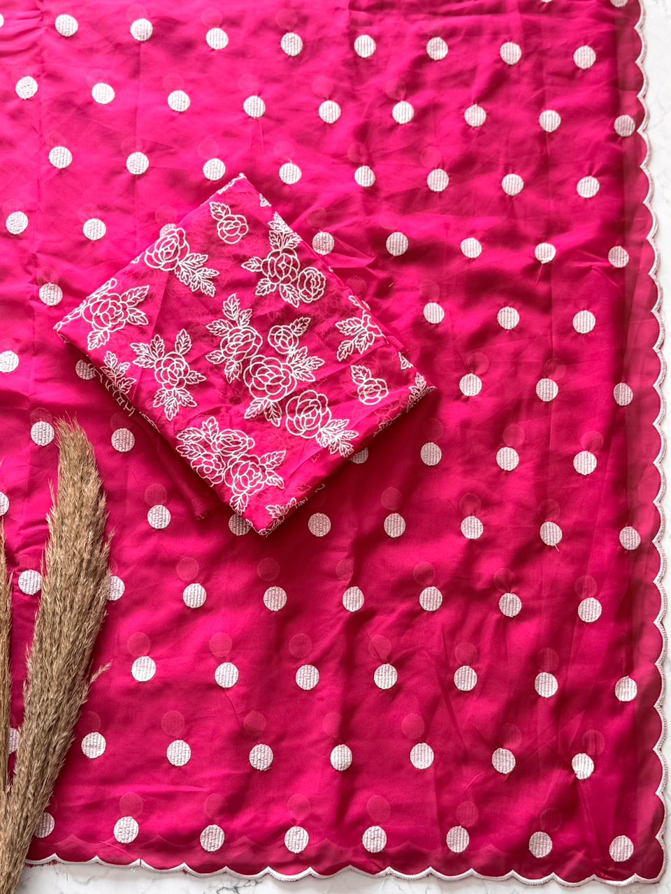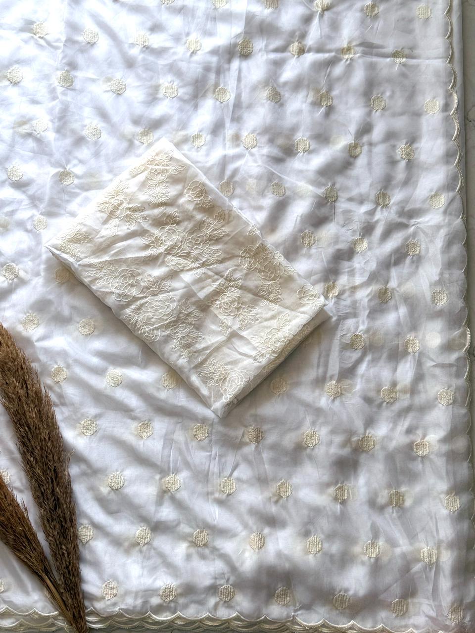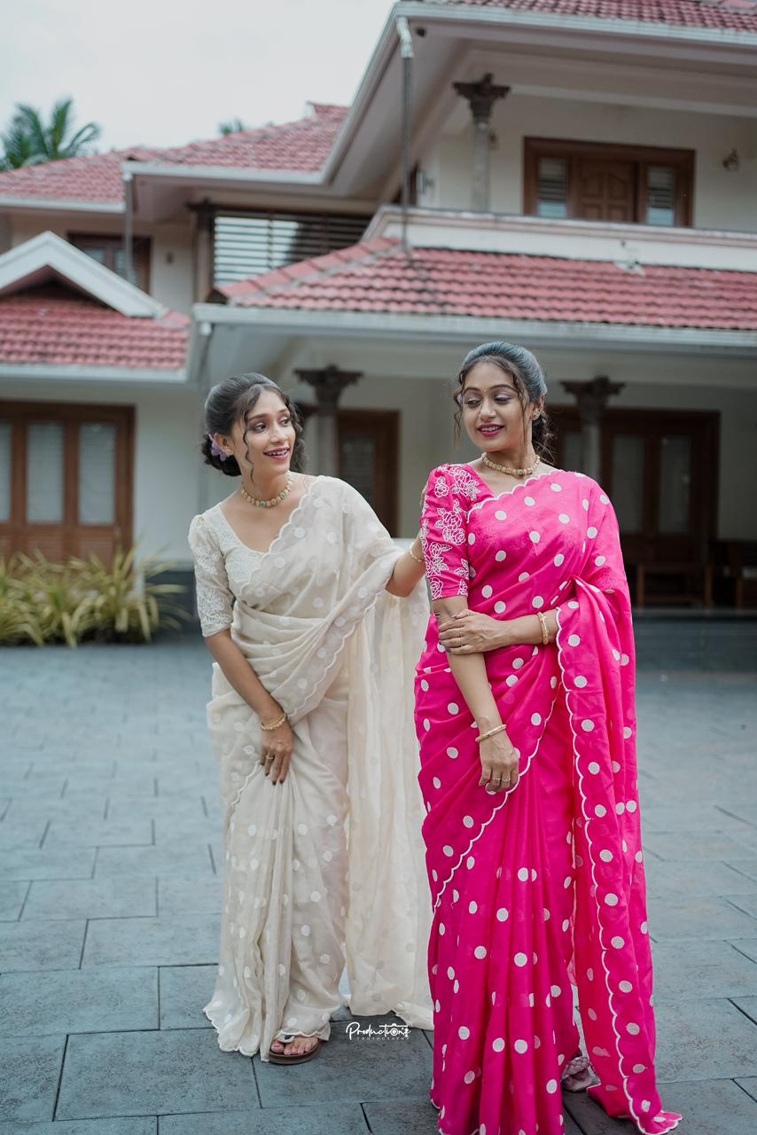 Elegantly crafted in premium soft organza, this saree features delicate polka dot thread work all over, complemented by a beautifully detailed scallop border that adds a graceful finish.