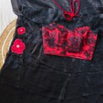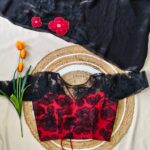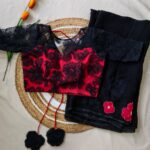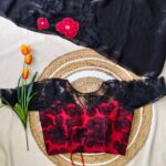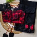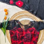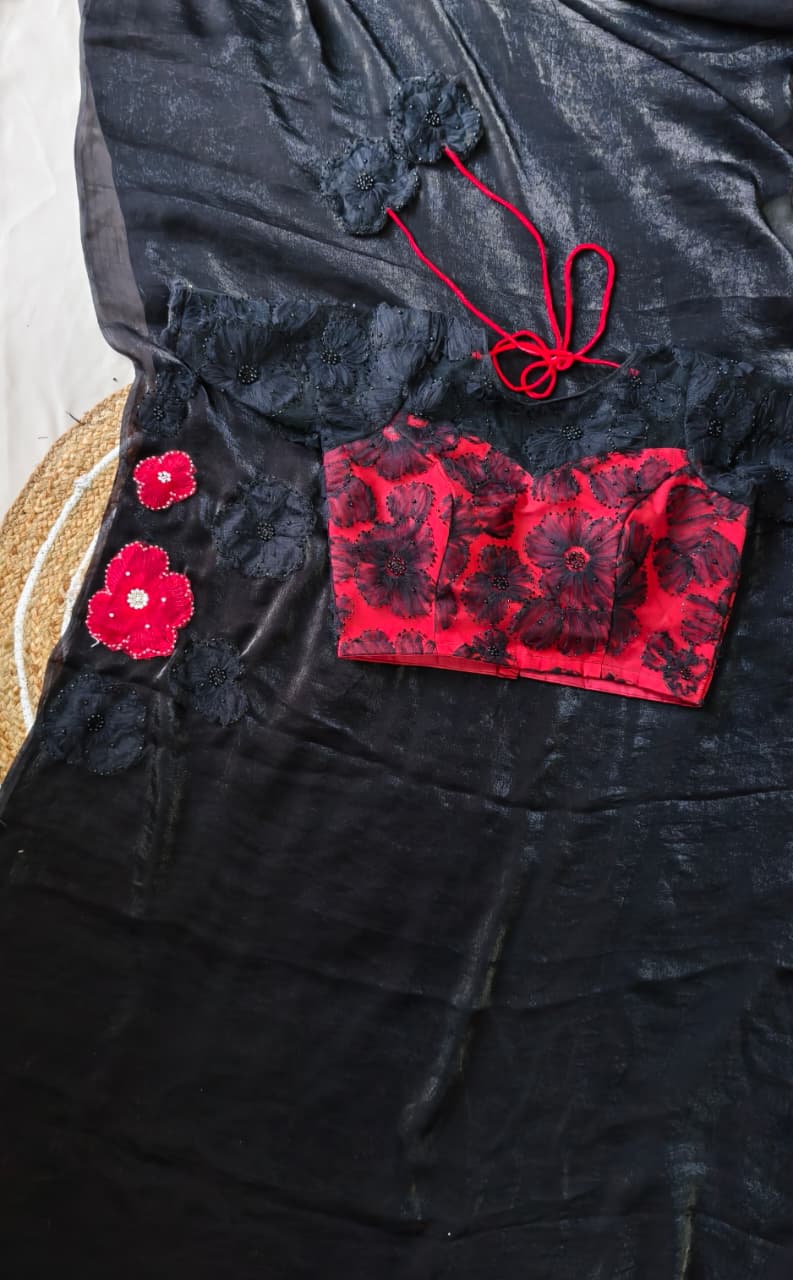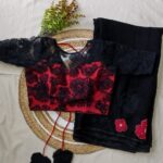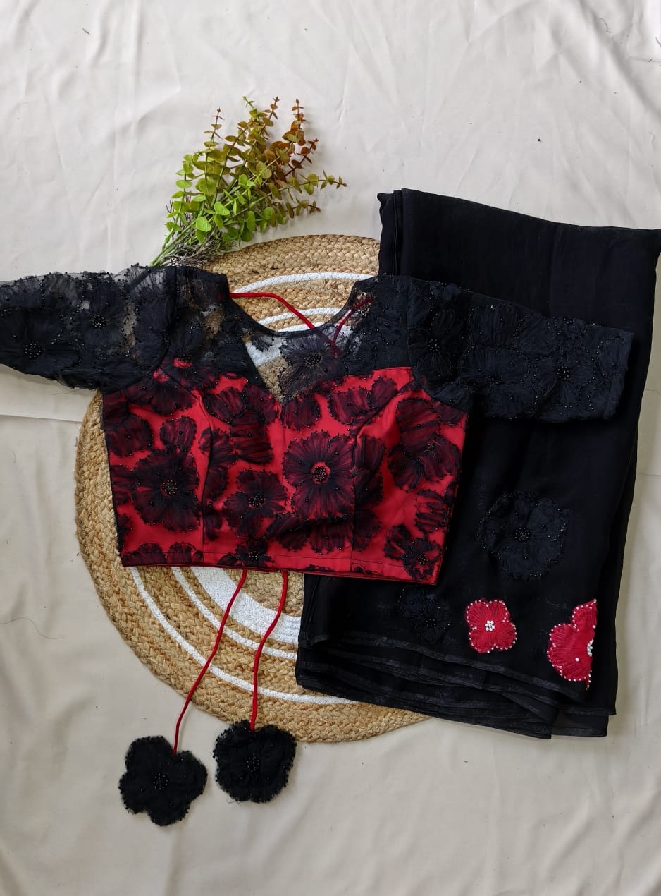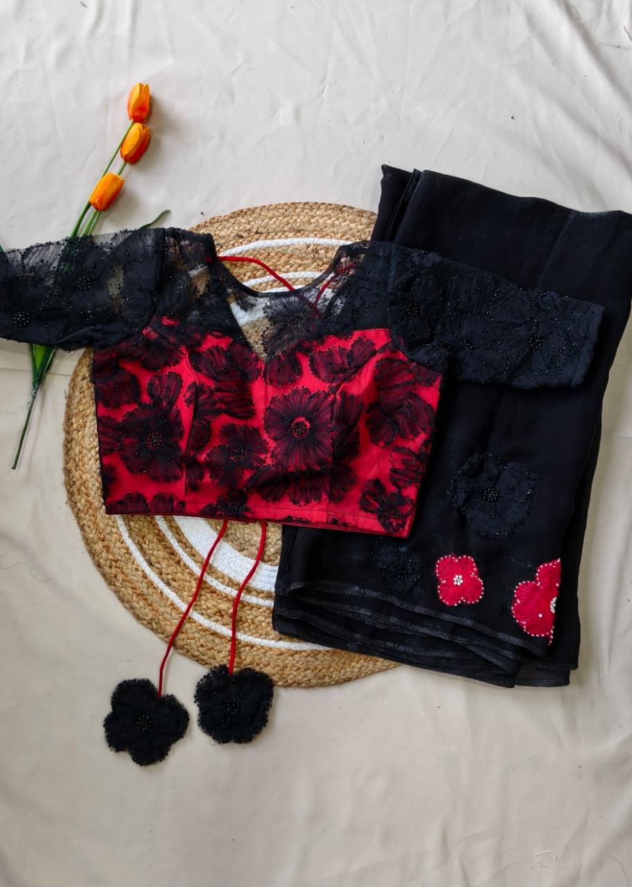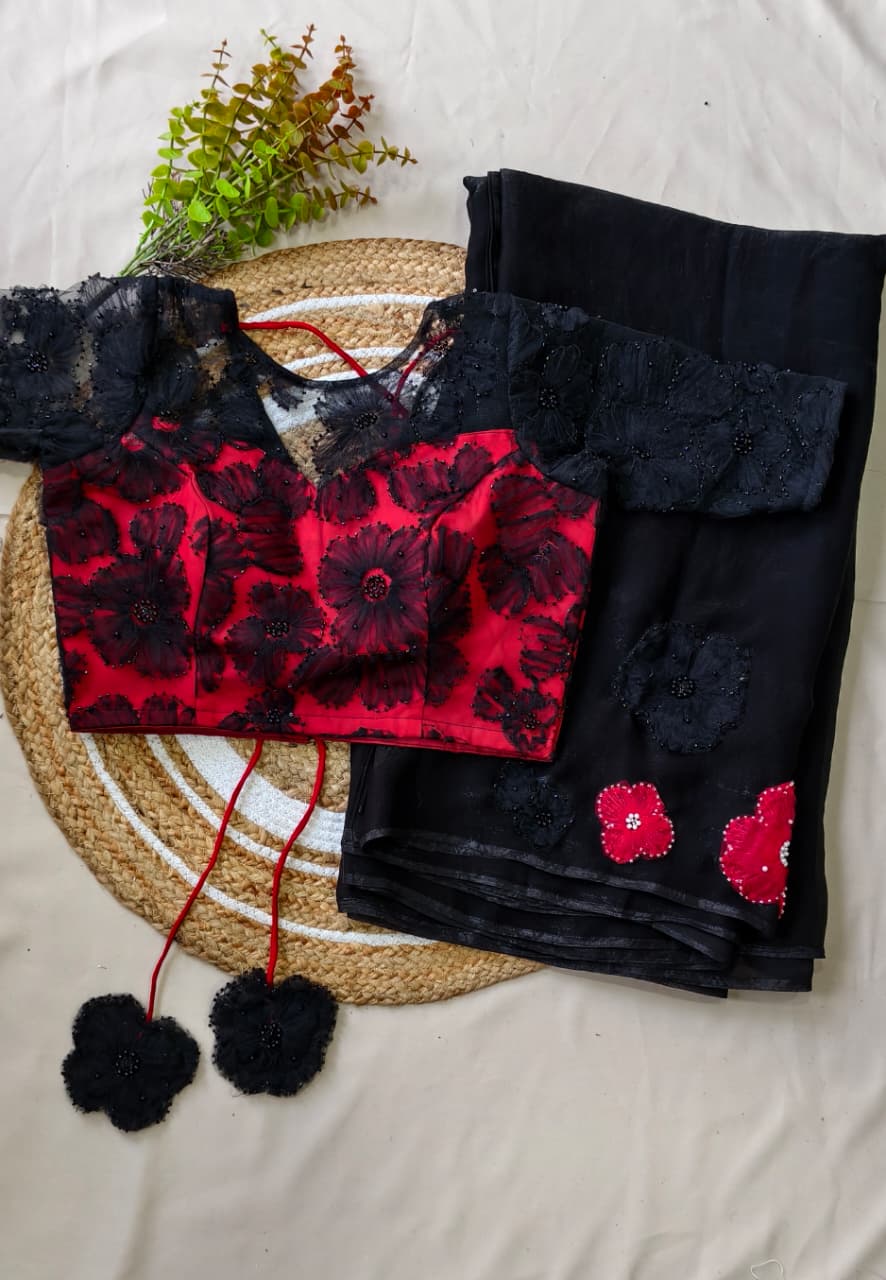 The saree features delicate applique work on the chest portion, adorned with beautifully crafted same-shade and contrast colour floral motifs, adding a graceful and sophisticated touch.