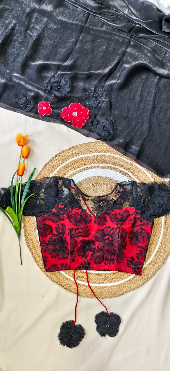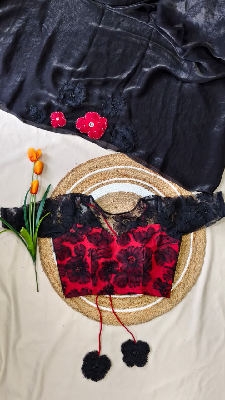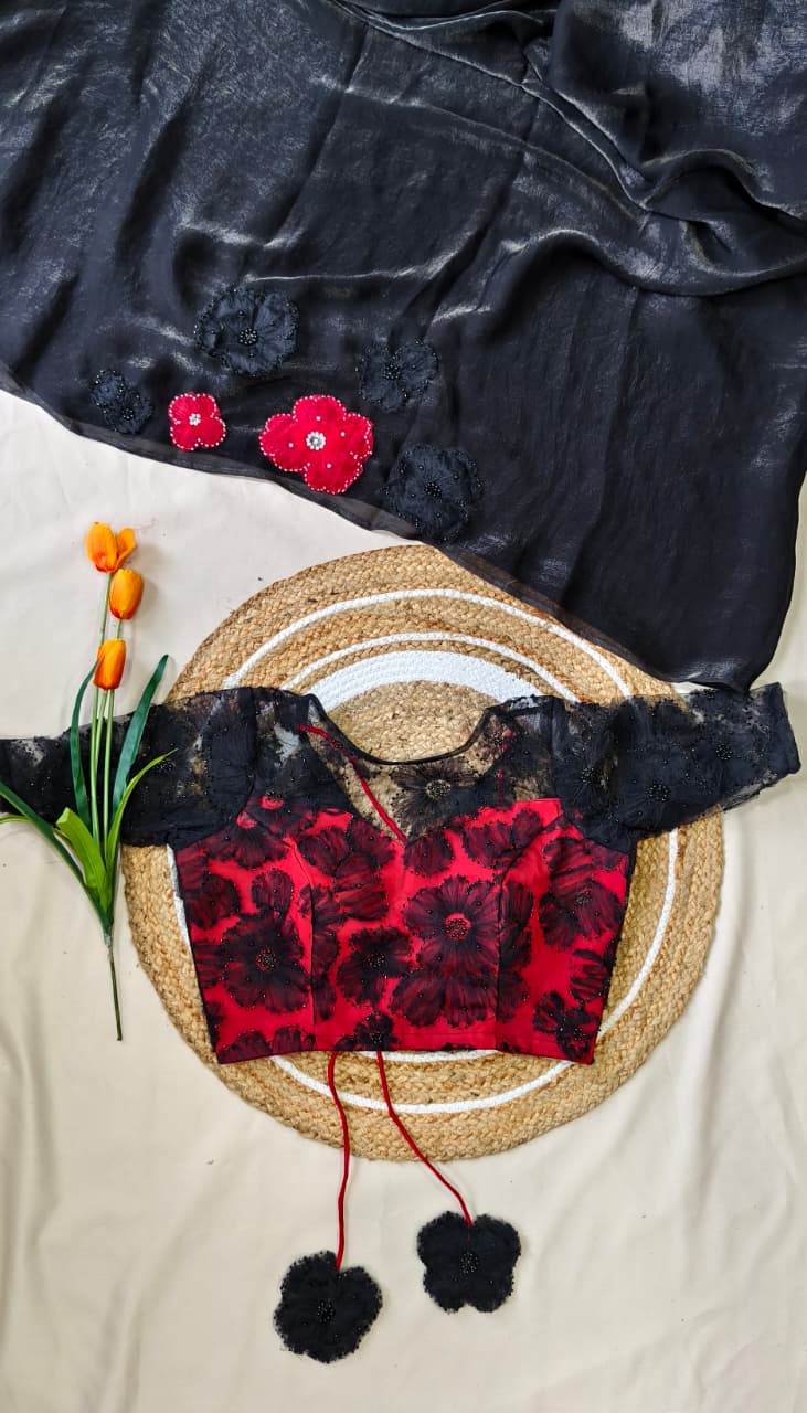 A stunning premium saree crafted from a blend of soft space silk, velvet organza, and fendy satin silk, giving it a luxurious fall and elegant shine.