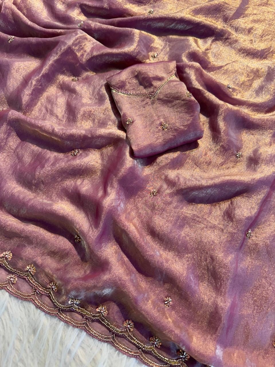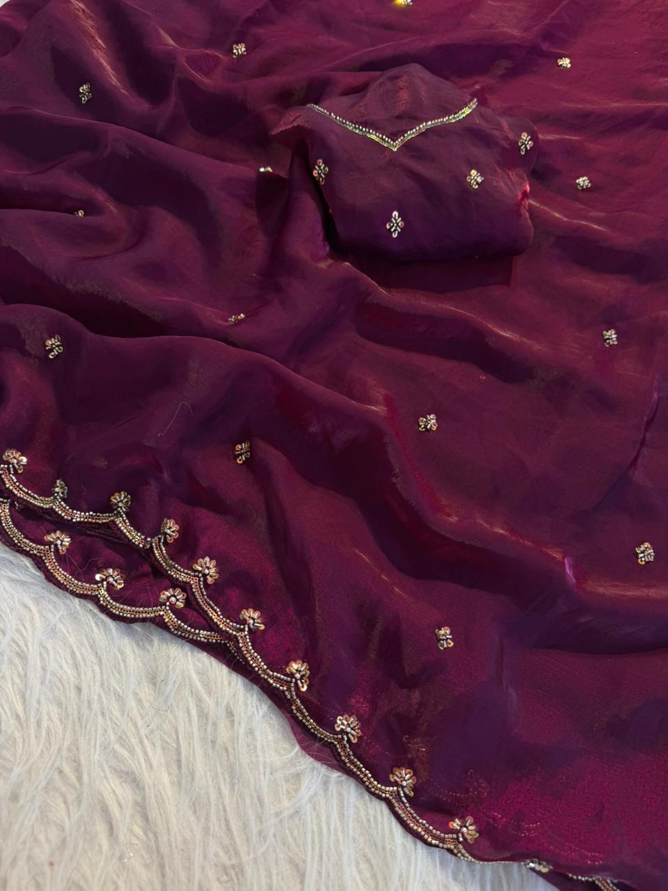Step into timeless elegance with this luxurious Space Silk Saree, beautifully crafted to make every occasion special. The saree features exquisite beads, thread, and sequence work intricately designed across the fabric, adding a rich and graceful charm.