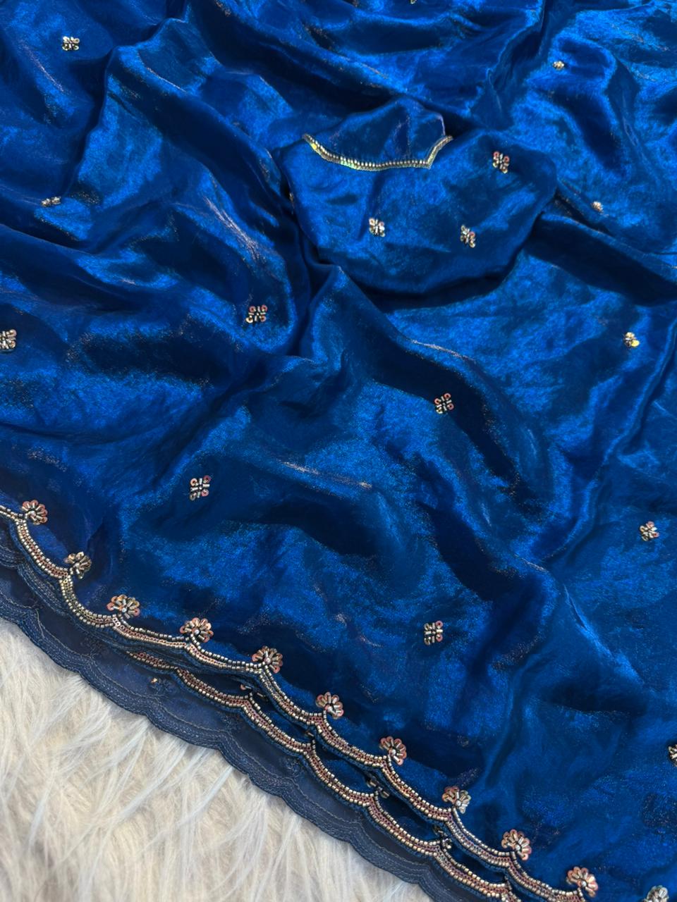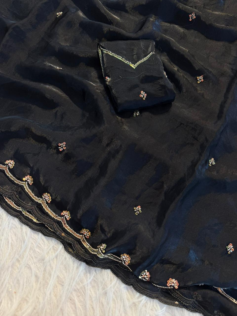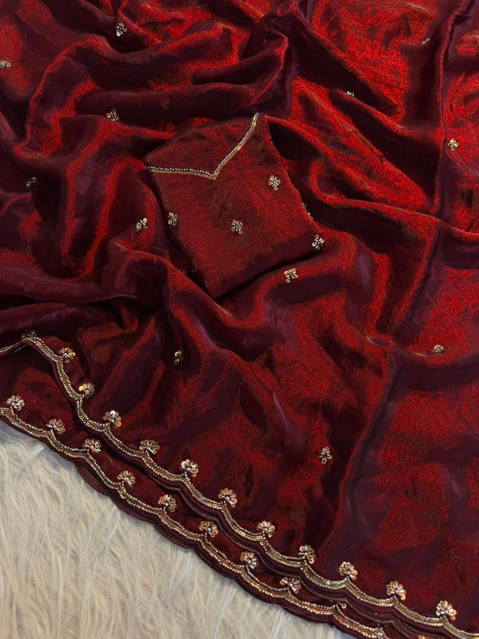 Paired with a stunning sequence blouse, enhanced with fancy bead detailing, this ensemble brings together tradition and modern glamour effortlessly. The fine craftsmanship and shimmering accents make it a perfect pick for festive wear, parties, and special gatherings.