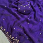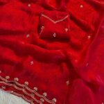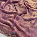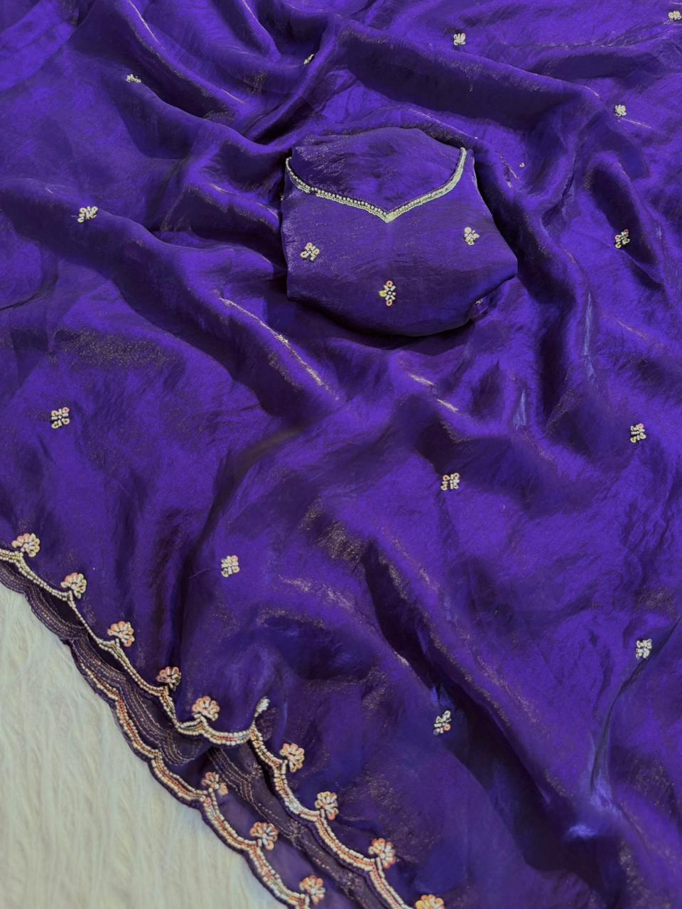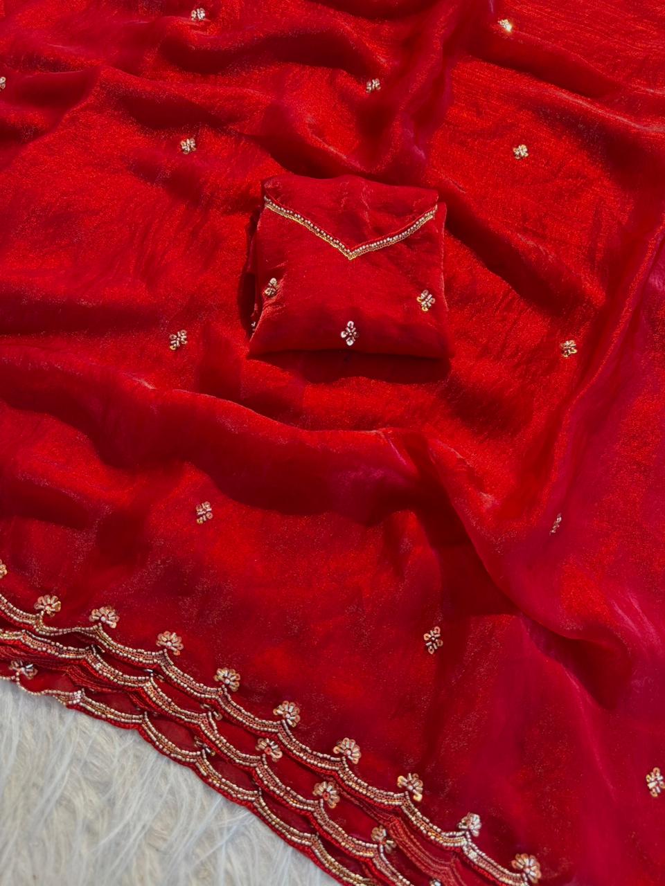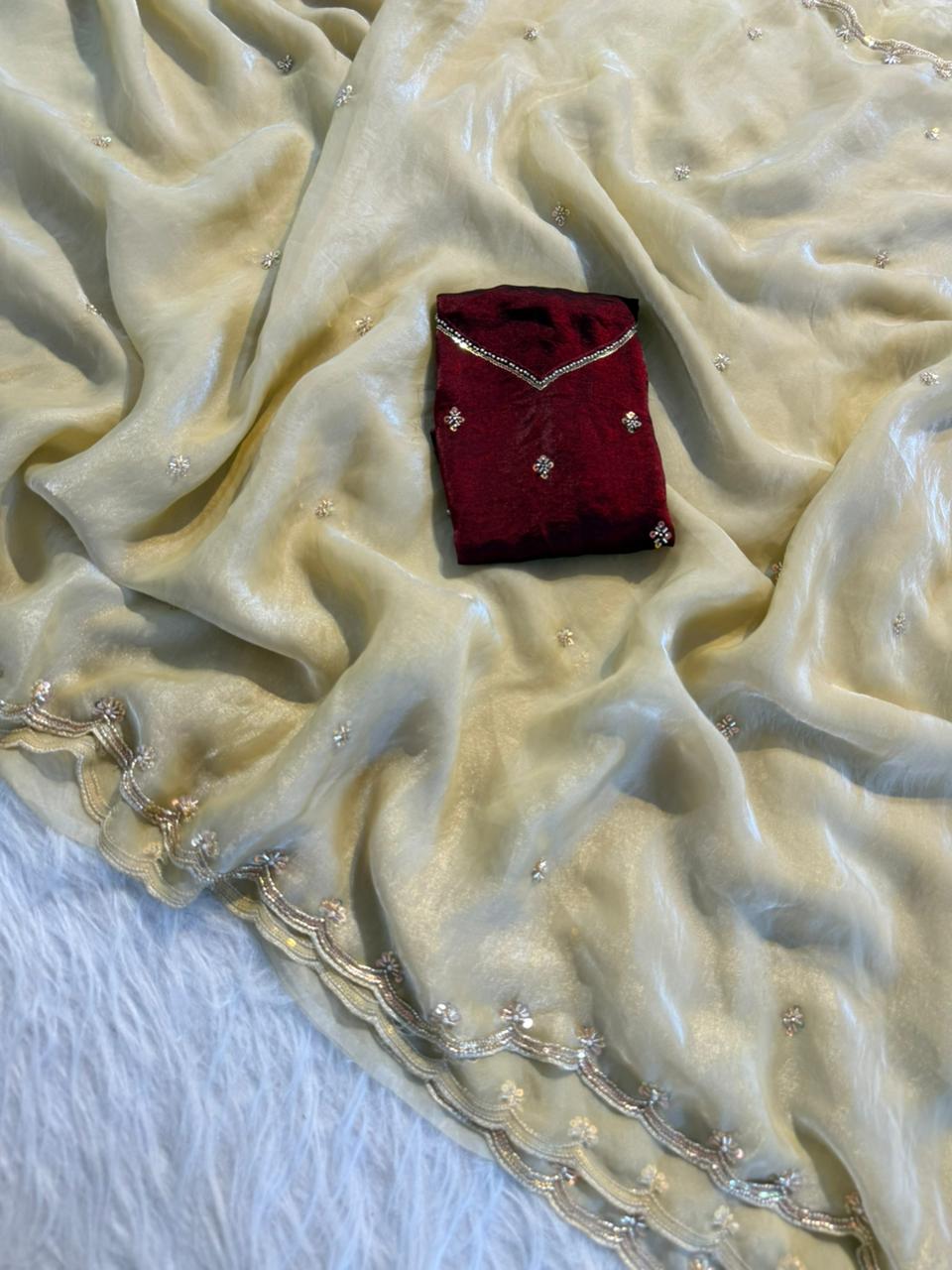 Paired with a stunning sequence blouse, enhanced with fancy bead detailing, this ensemble brings together tradition and modern glamour effortlessly. The fine craftsmanship and shimmering accents make it a perfect pick for festive wear, parties, and special gatherings.