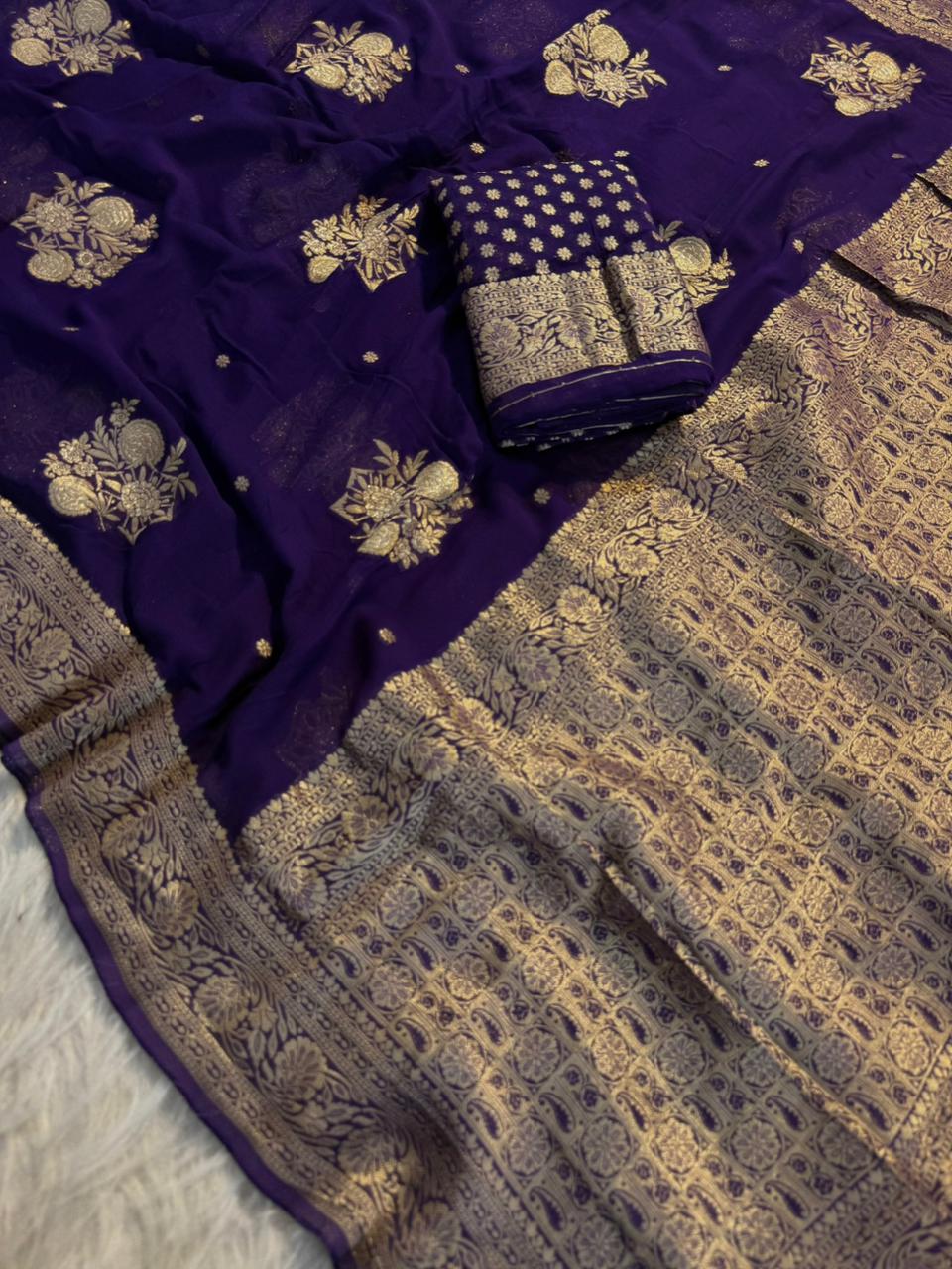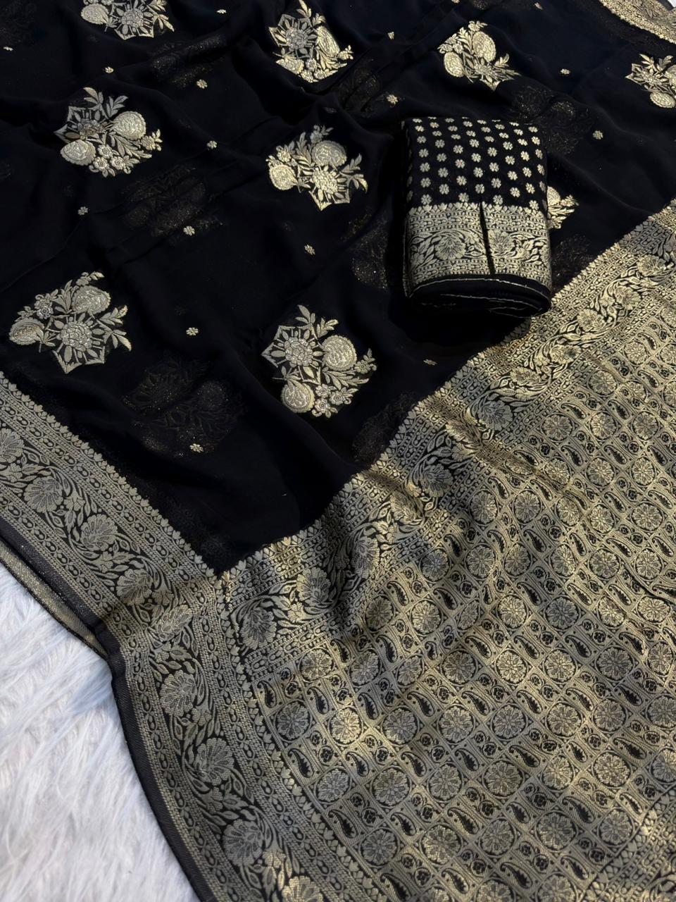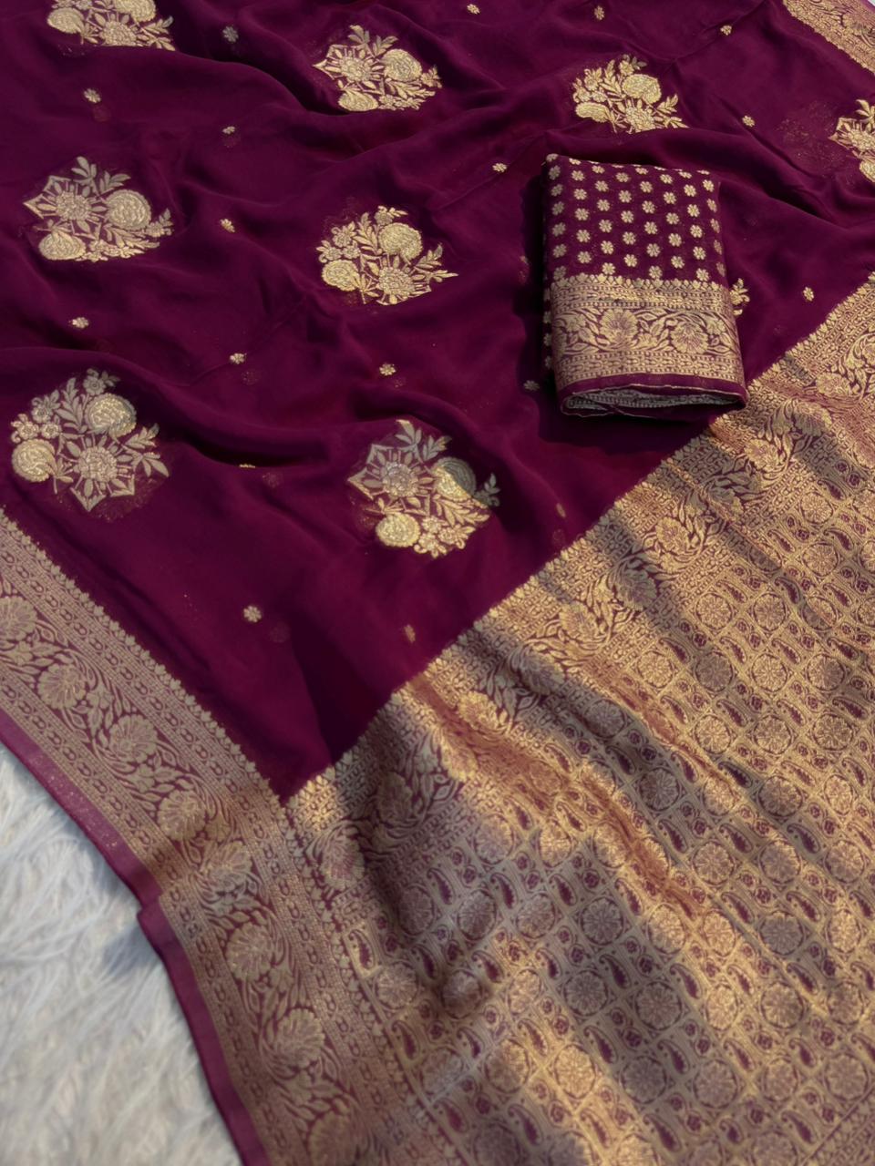 Elevate your ethnic wardrobe with this graceful and flowy saree crafted in pure viscose soft georgette, designed for a rich and elegant look.