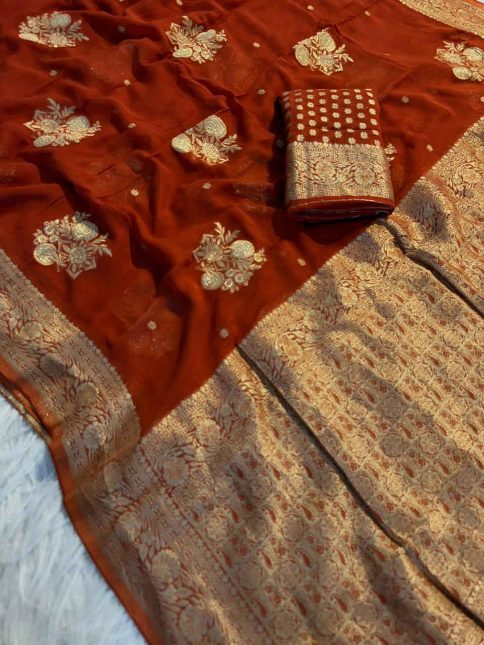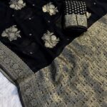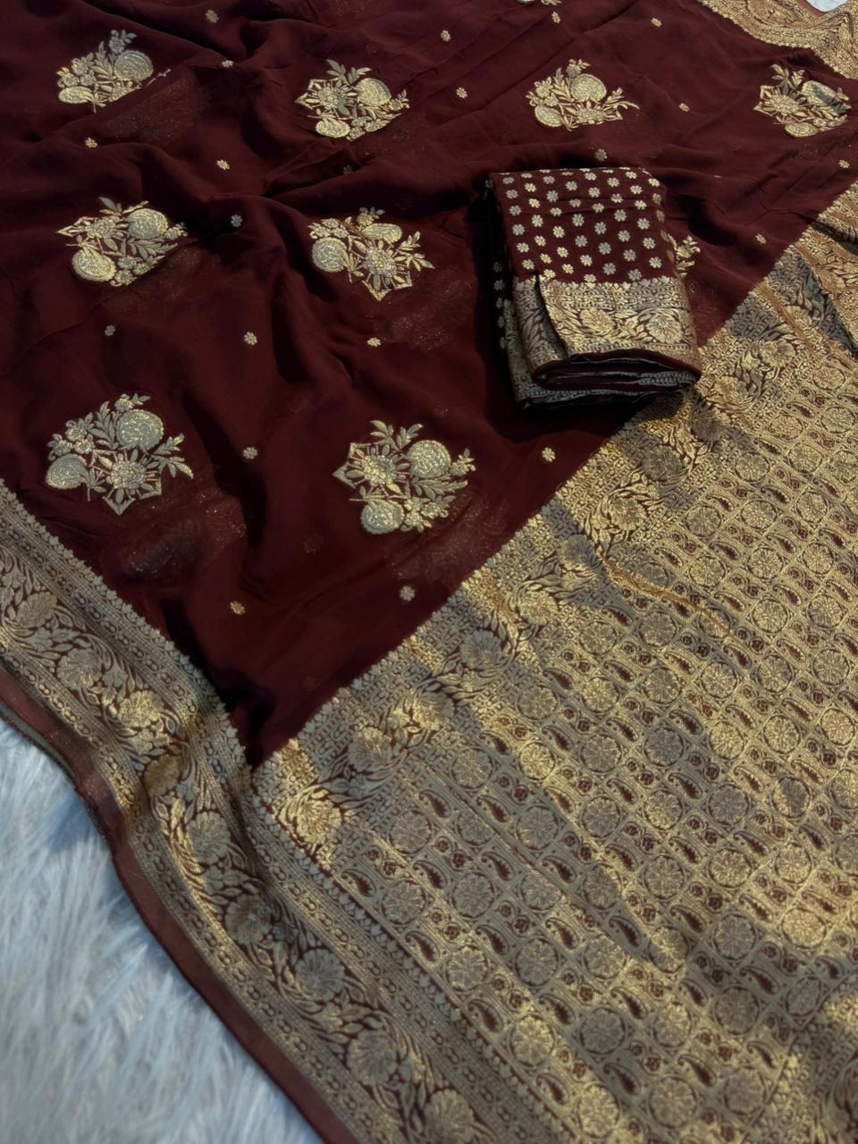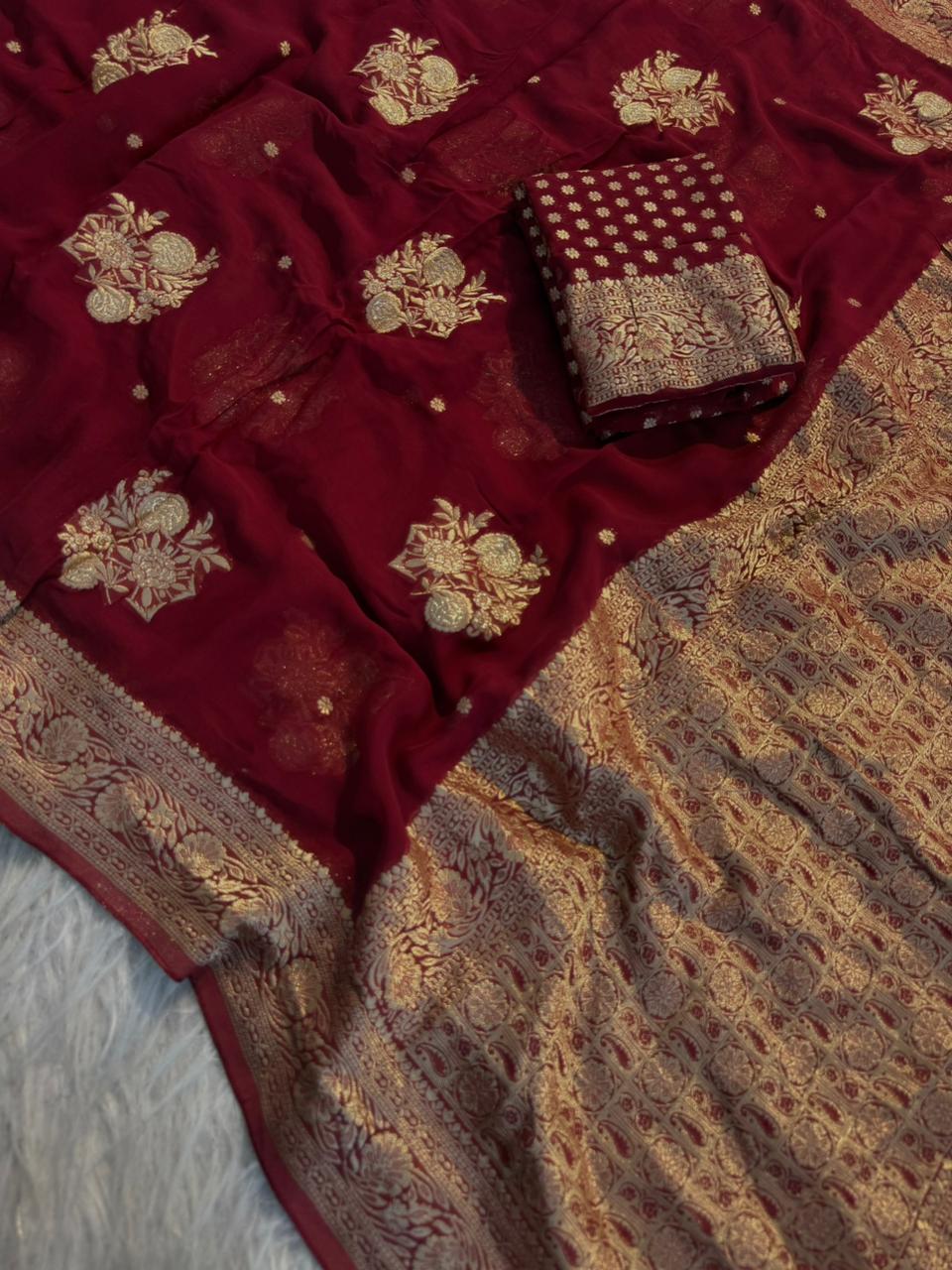 Elevate your ethnic wardrobe with this graceful and flowy saree crafted in pure viscose soft georgette, designed for a rich and elegant look.