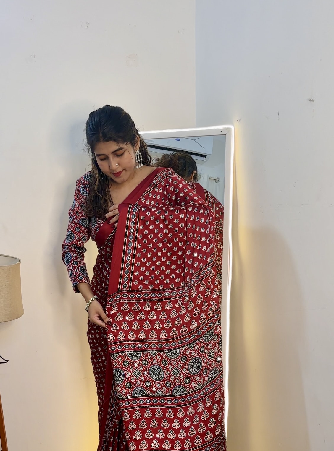 Elevate your ethnic style with this stunning semi modal saree, beautifully adorned with elegant mirror work that adds a touch of sparkle and charm. The soft and lightweight fabric ensures all-day comfort while giving a graceful drape.