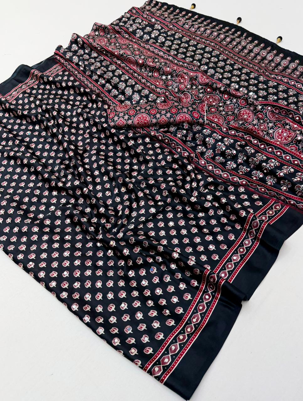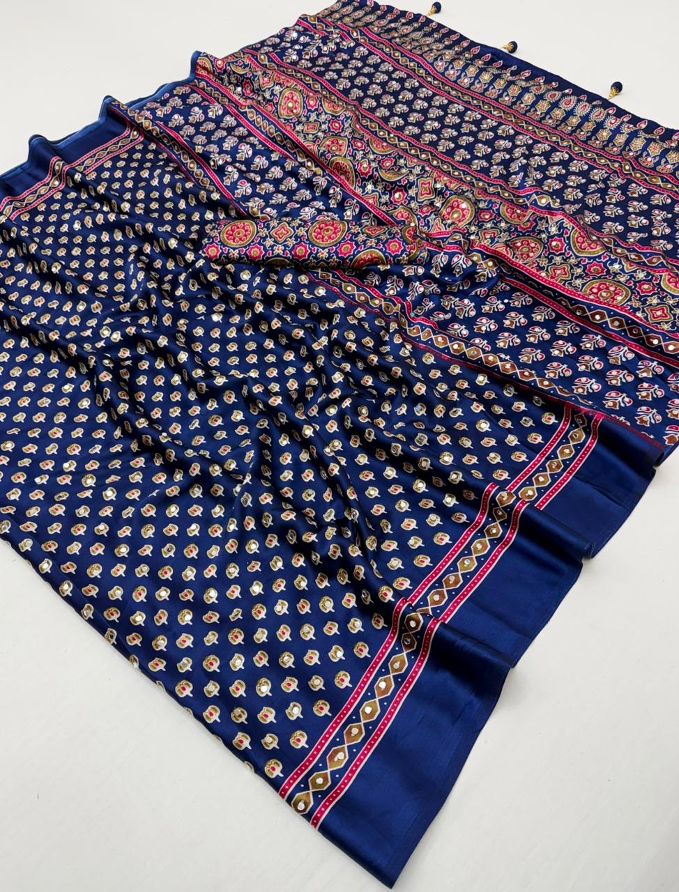 Perfect for festive occasions, casual gatherings, and party wear, this saree blends tradition with modern elegance effortlessly.