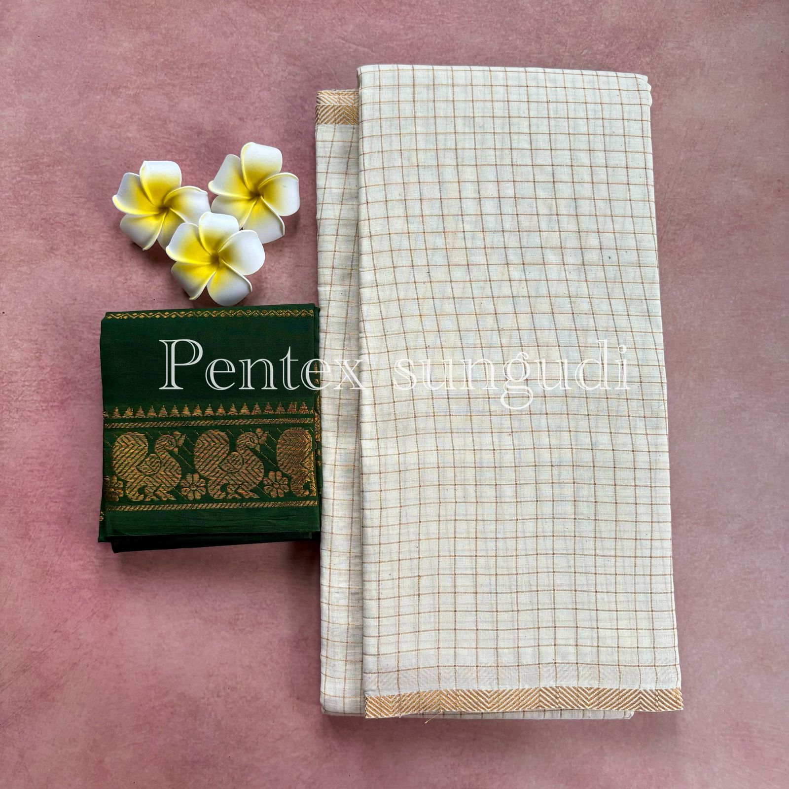 🌷 Premium Quality Pentex Golden Zari Kattam Sungudi Cotton Saree 🌷