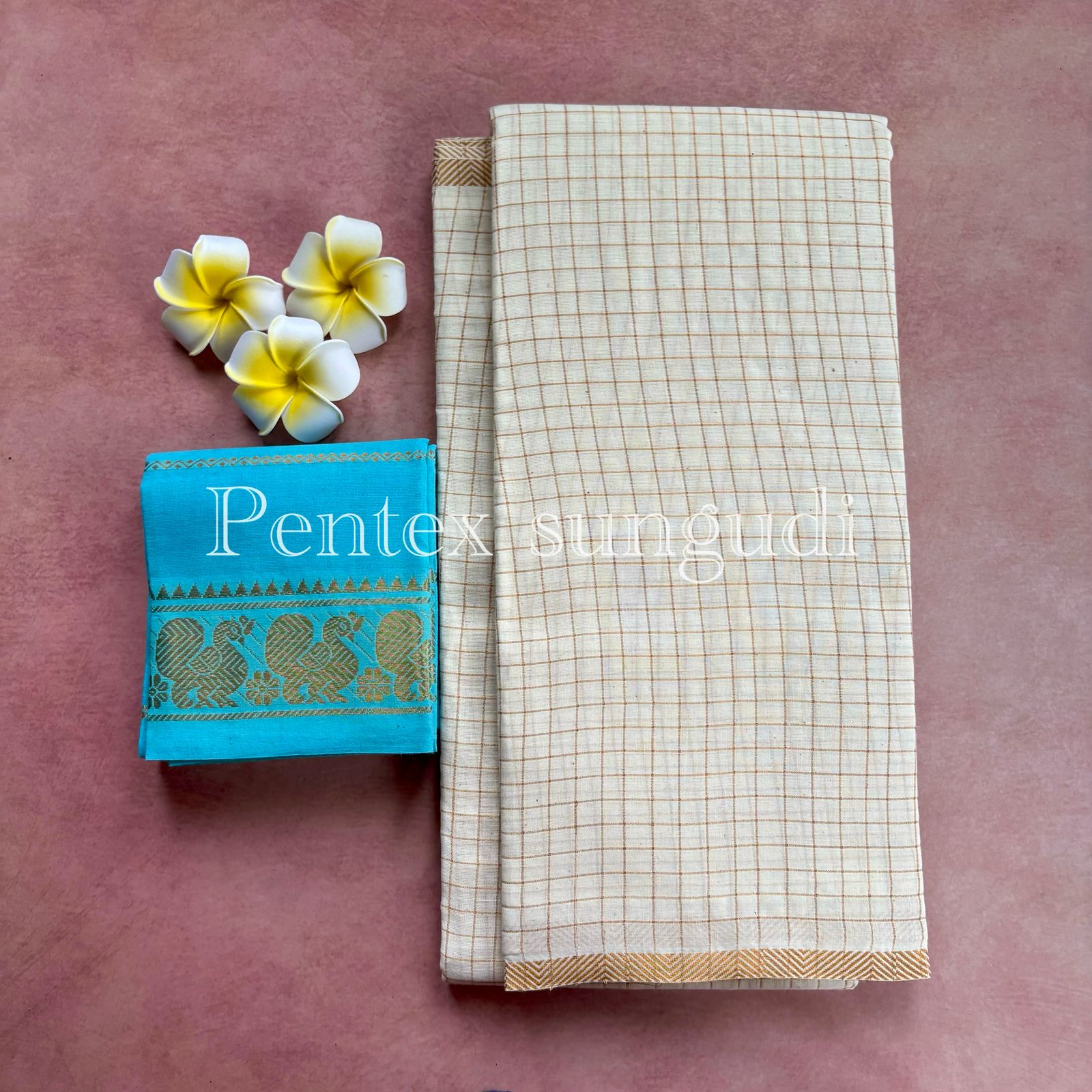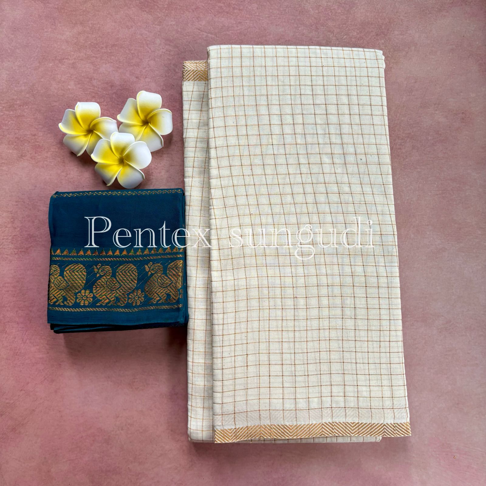 Be the first to review “🌷 Premium Quality Pentex Golden Zari Kattam Sungudi Cotton Saree 🌷”