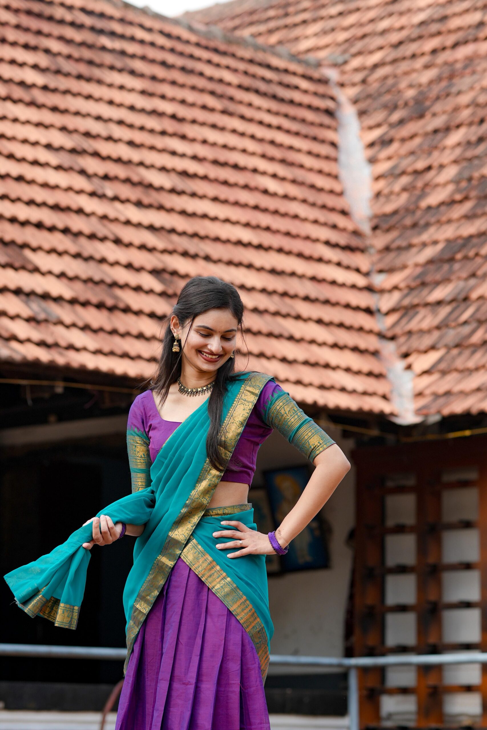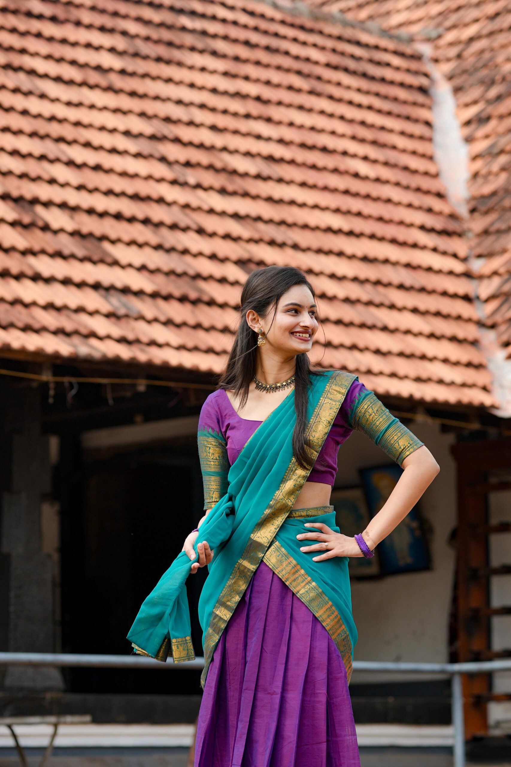 Step into timeless elegance with this beautifully curated Dhavani Set, crafted using premium Kanchi Cotton and soft Georgette for a perfect blend of heritage and comfort. Ideal for traditional functions, poojas, or festive wear, this unstitched set allows you to tailor your own graceful Langa Voni (Half Saree) ensemble.