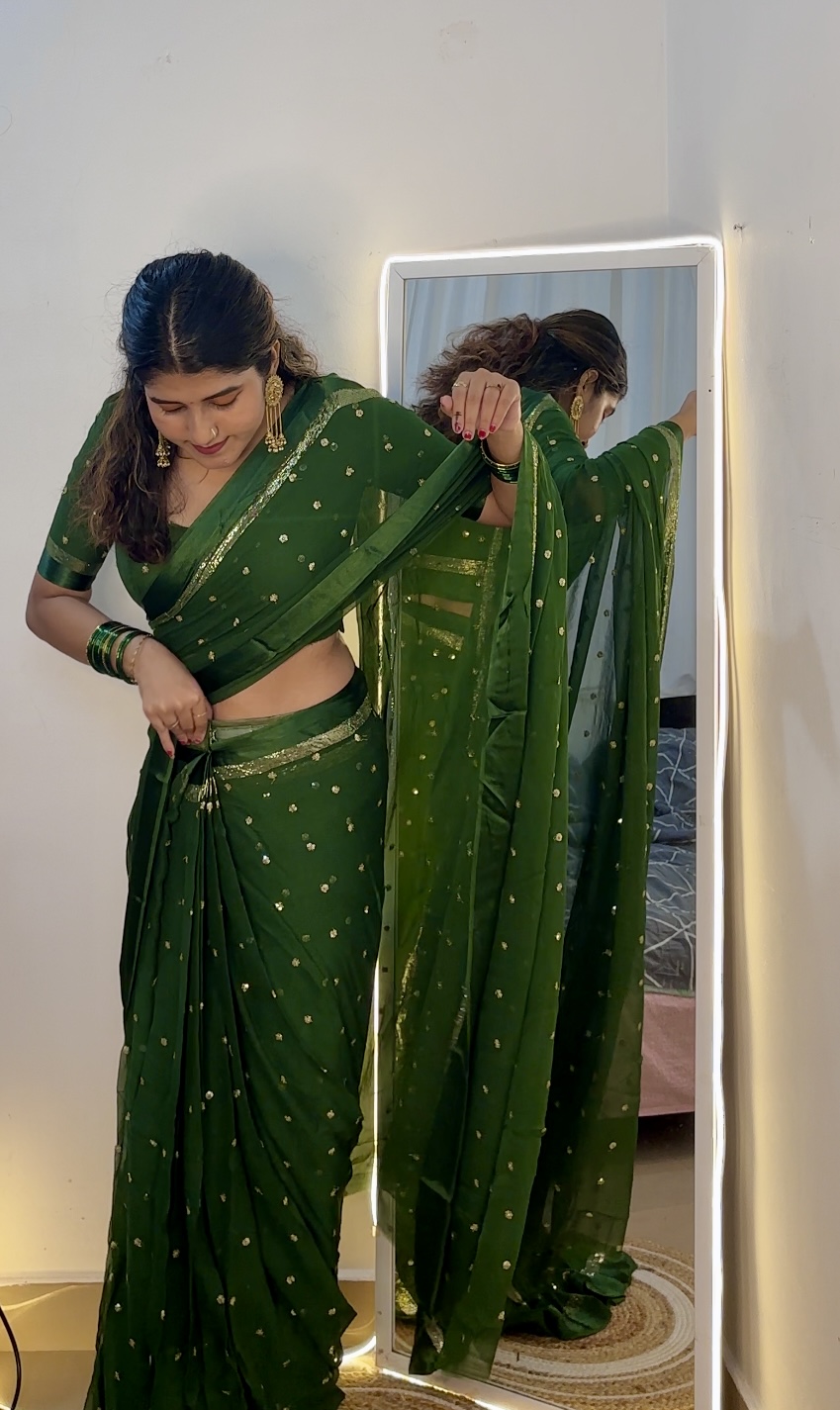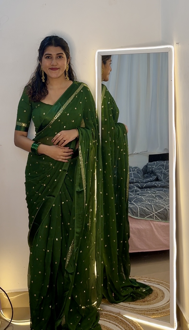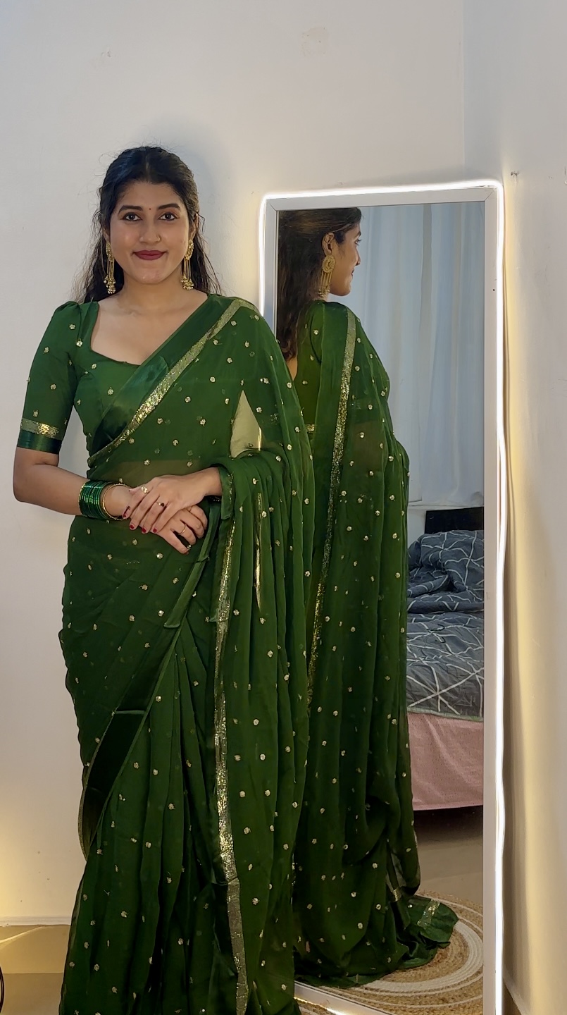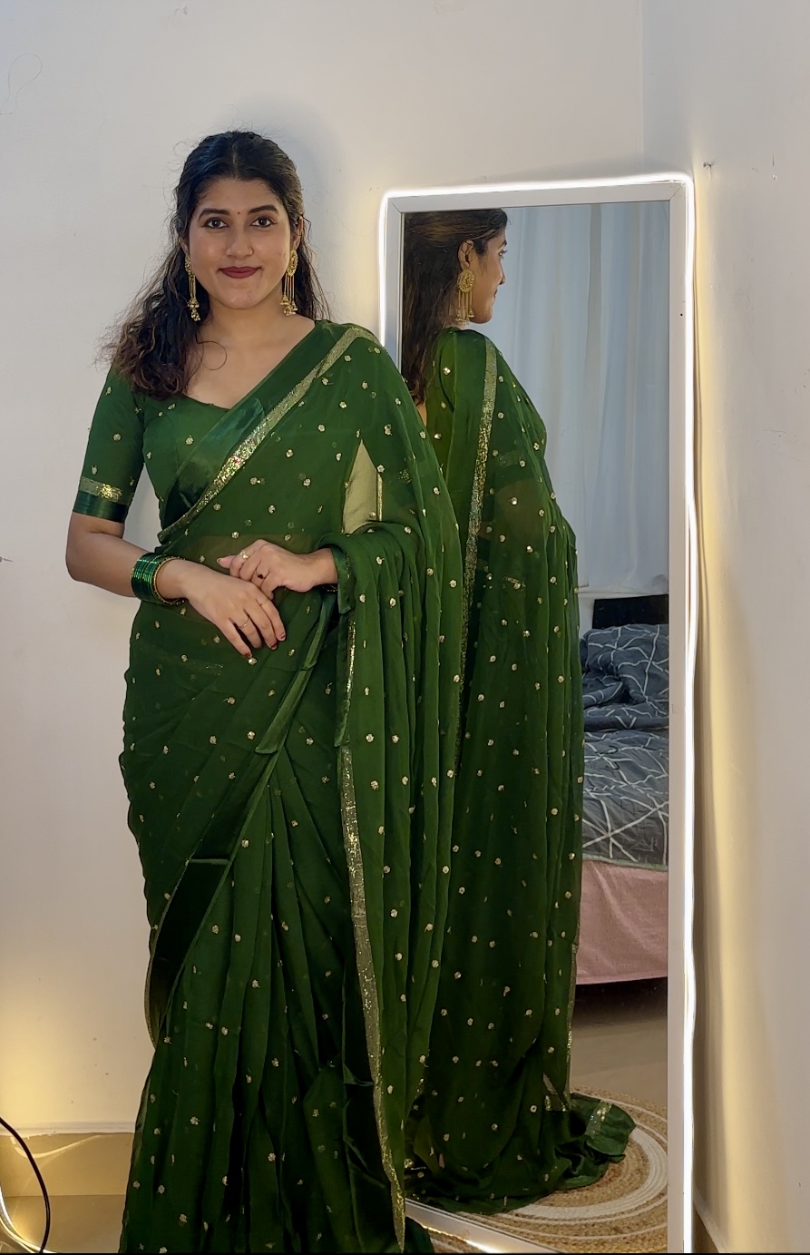 Step into effortless elegance with this stunning viscose georgette saree, beautifully adorned with shimmering sequence work all over. The soft and flowy fabric drapes gracefully, offering a lightweight and comfortable feel, perfect for long hours of wear.