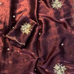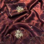 This saree is beautifully adorned with handcrafted detailing and real sequin work, giving it a refined shimmer without overwhelming the look. The same exquisite handwork continues on the matching satin blouse, which comes unstitched to allow for personalized tailoring.