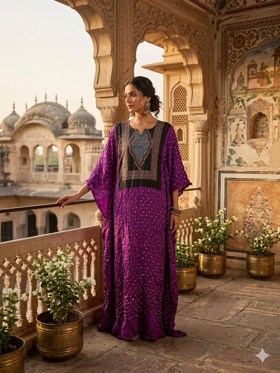 Lightweight and comfortable, this fabric drapes effortlessly, making it an ideal choice for creating trendy kaftans, elegant kurtis, or fusion wear. The rich colors and detailed design add a timeless appeal to your outfit.