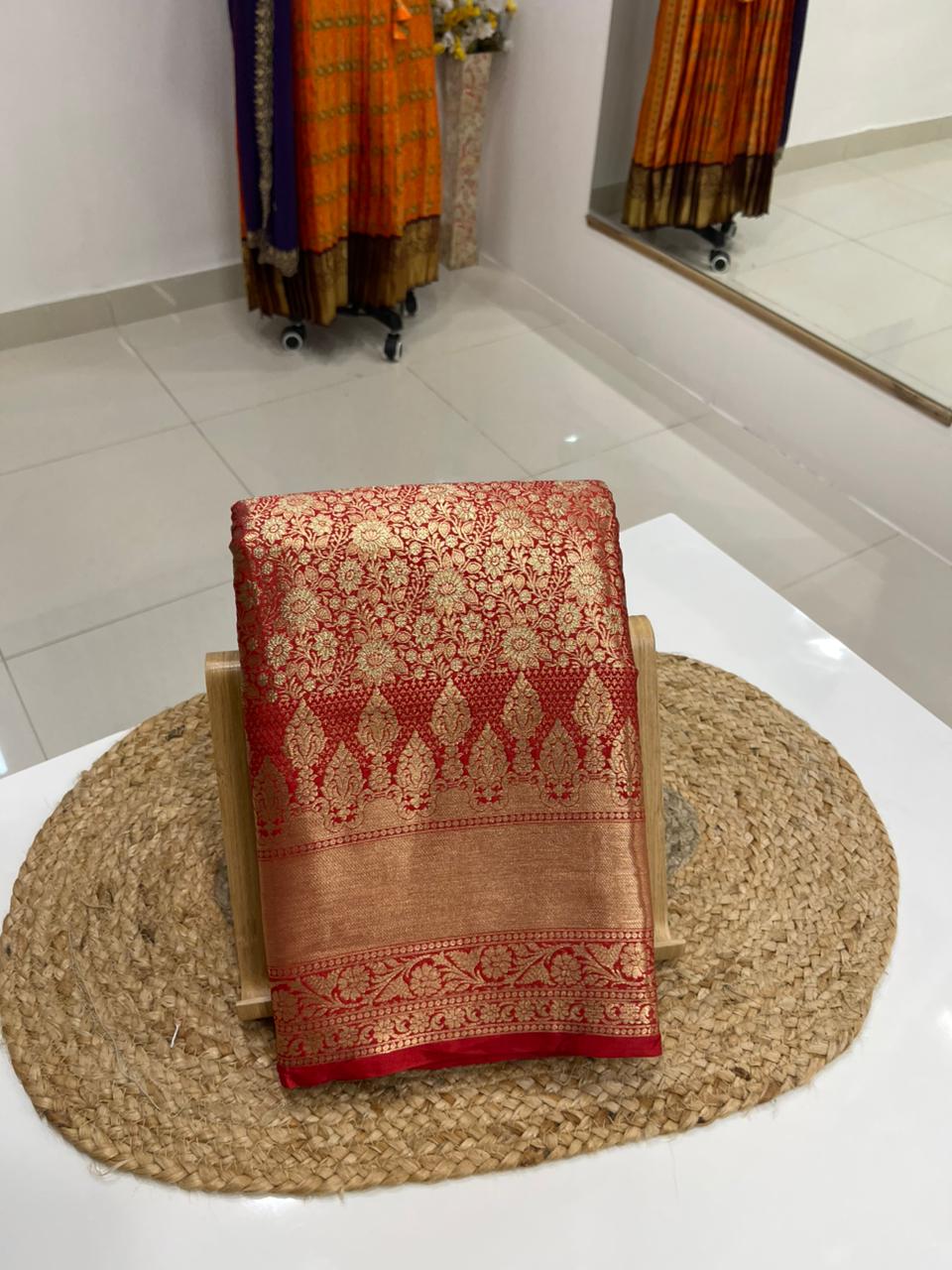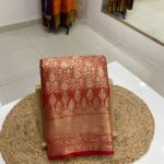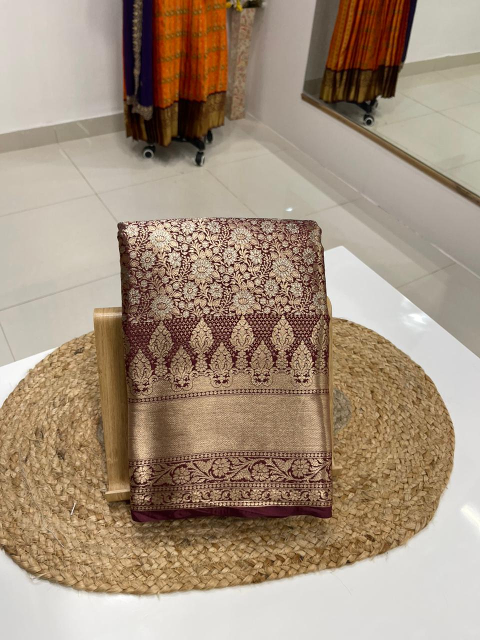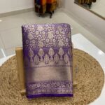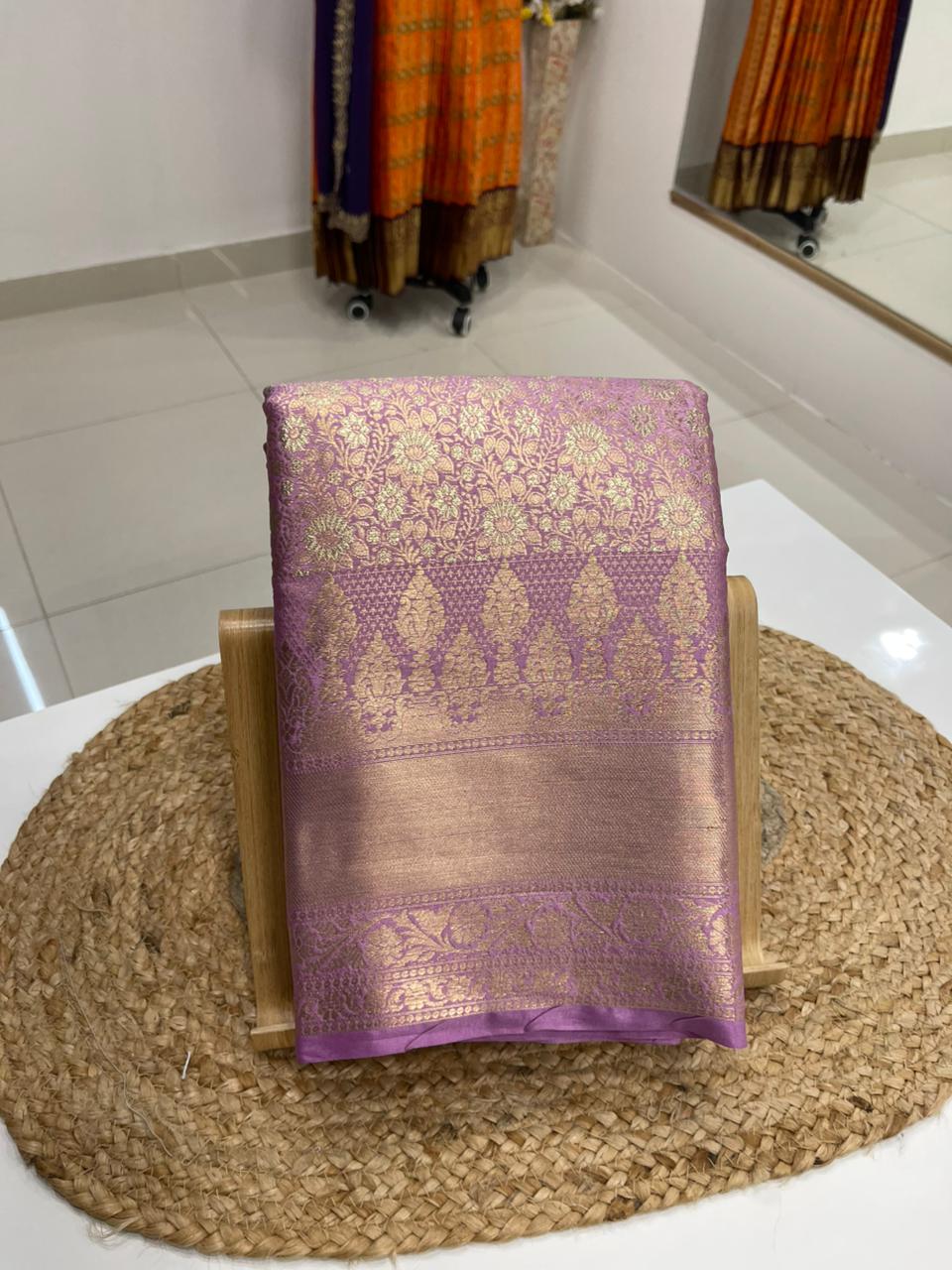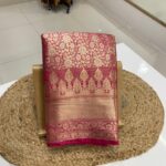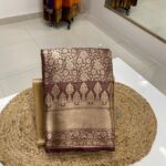 Bringing you the latest launch in a premium soft semi-Kanchi meenakari brocade saree, exquisitely crafted with an allover floral zari resham jaal. The saree is beautifully finished with a contrast woven Kanchi border, adding richness and traditional elegance to the drape—perfect for festive and special occasions.
