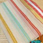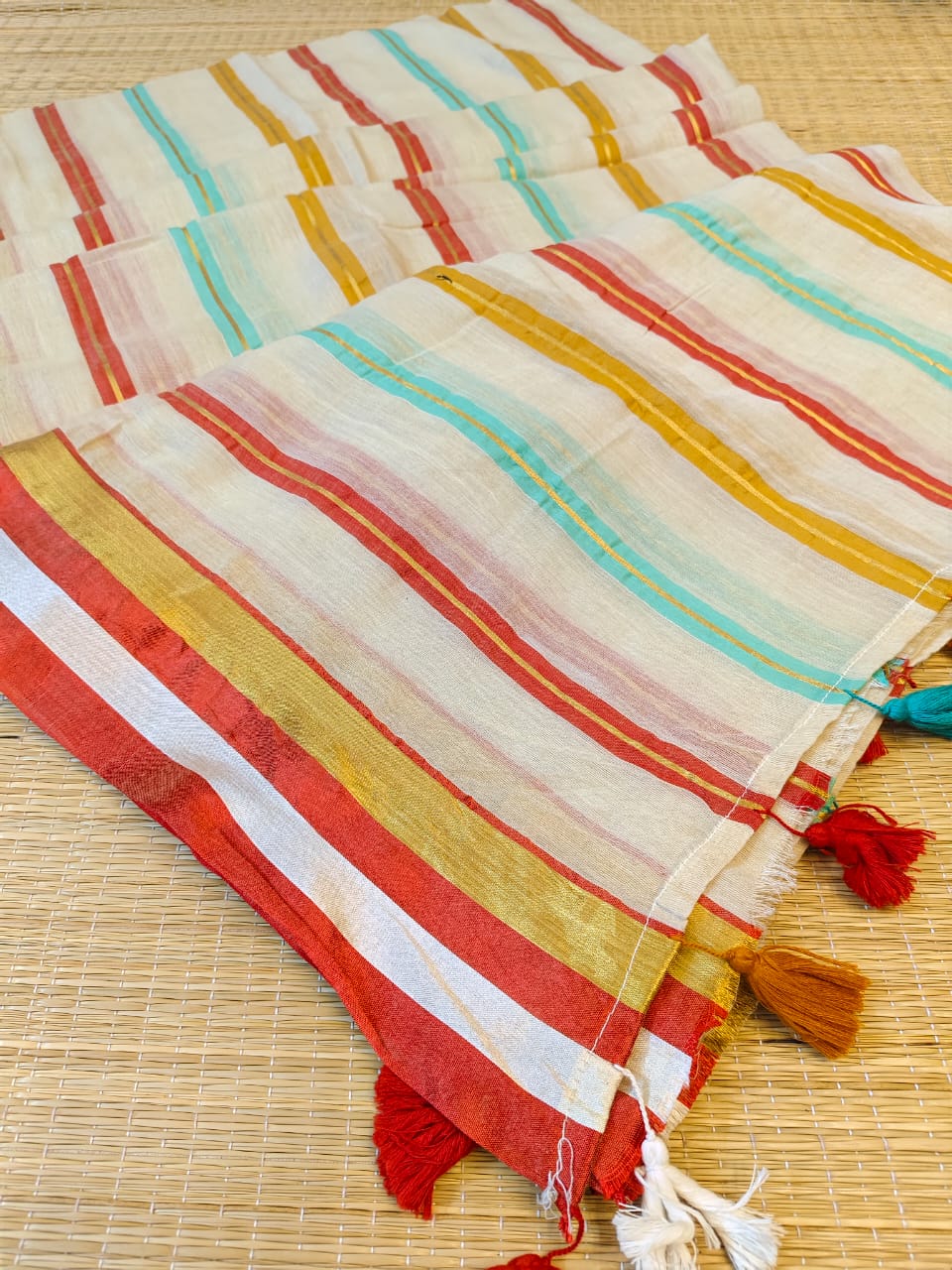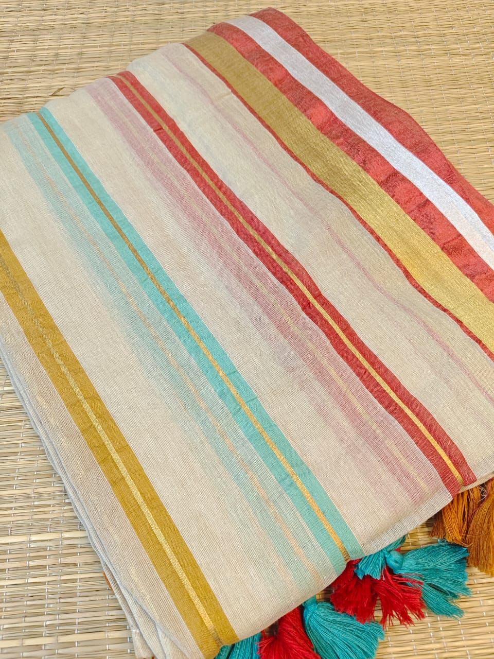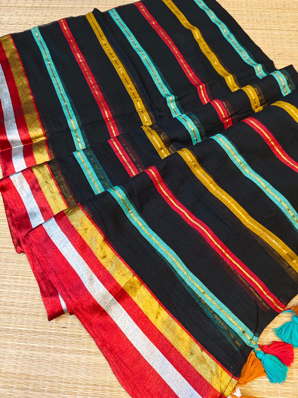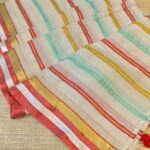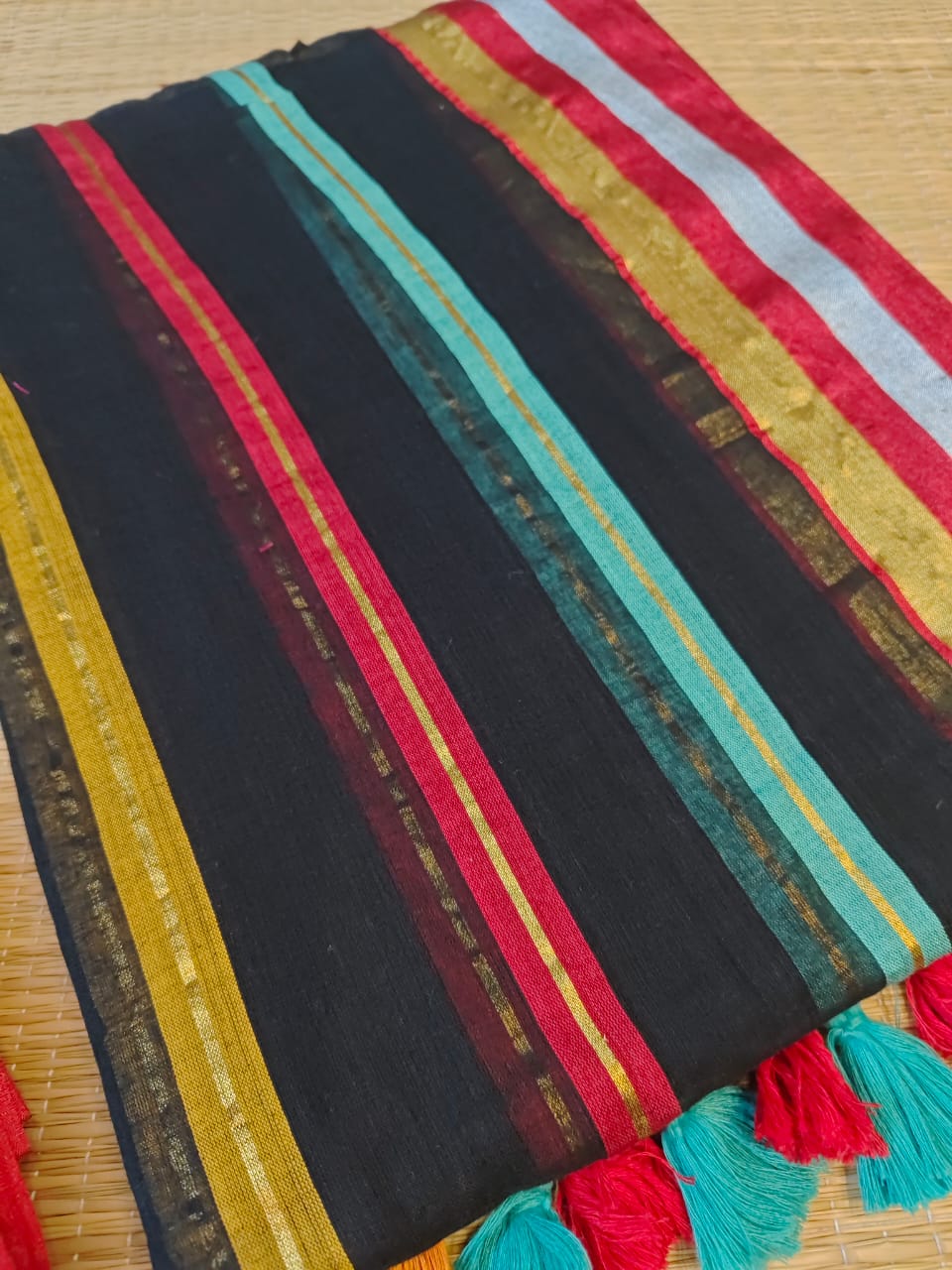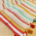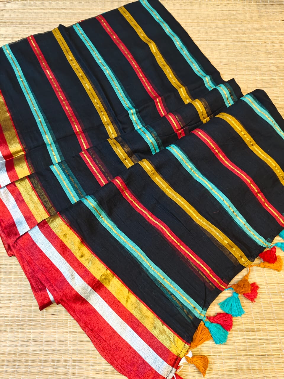 Pure Authentic Mul Cotton Saree – Rangoli Multicolour Stripes with Zari Border & Tassels