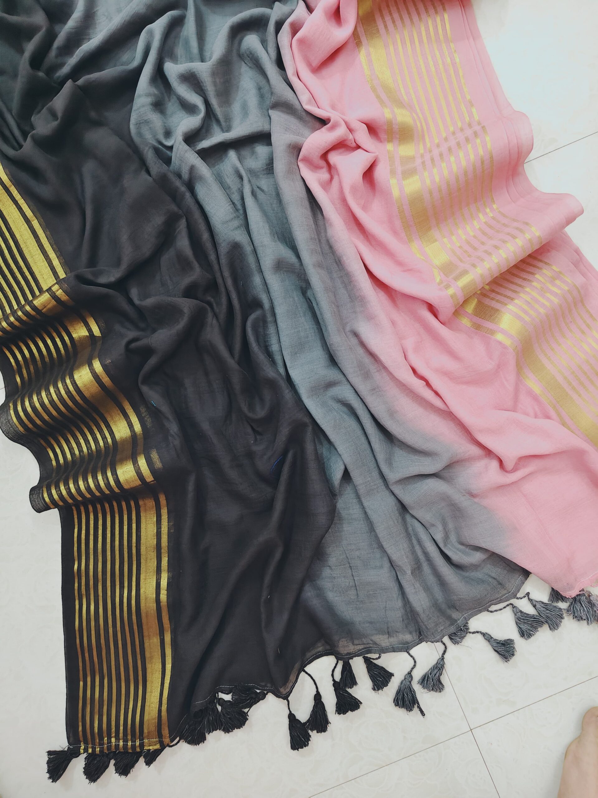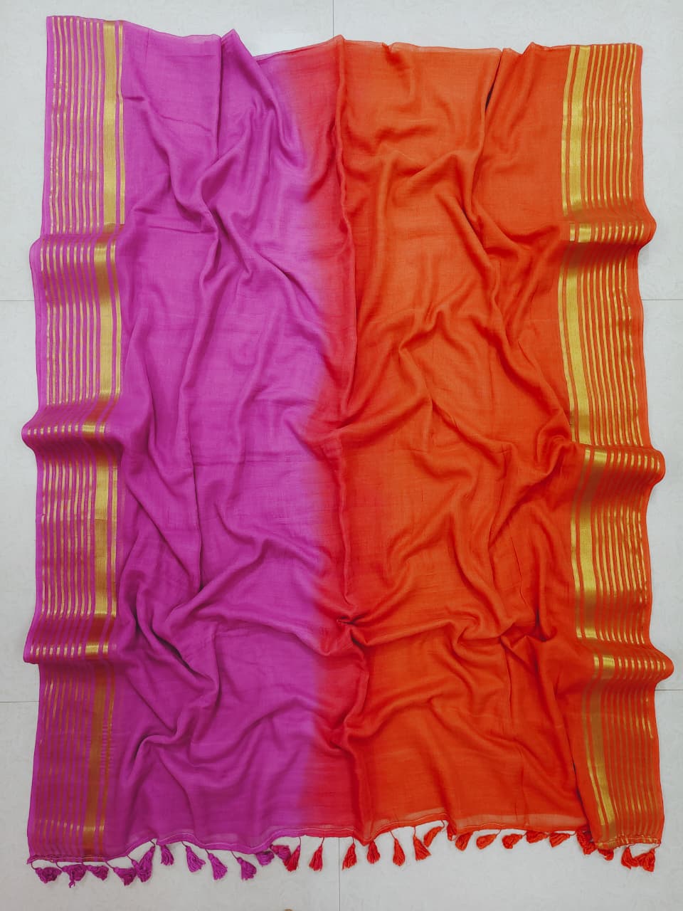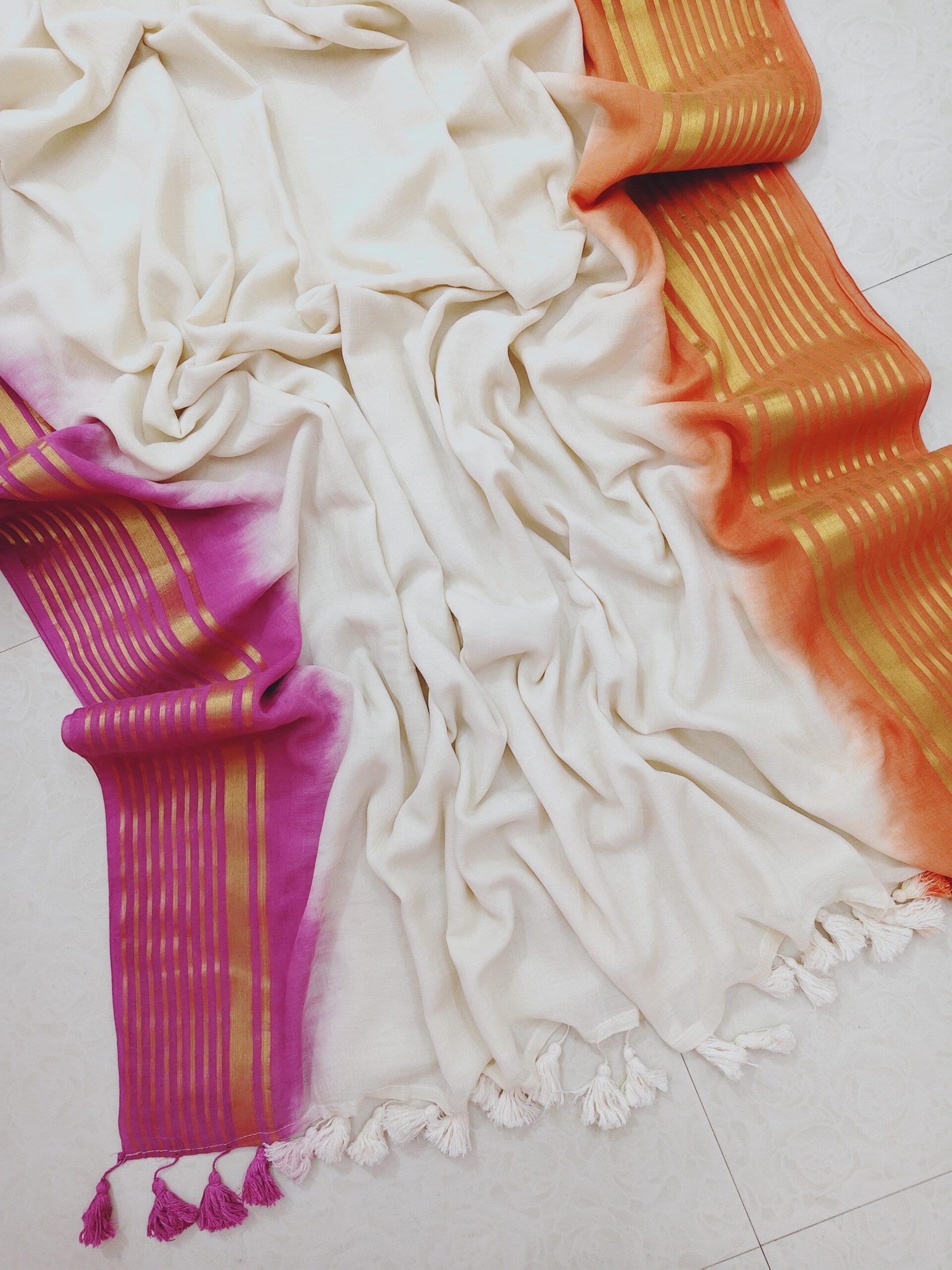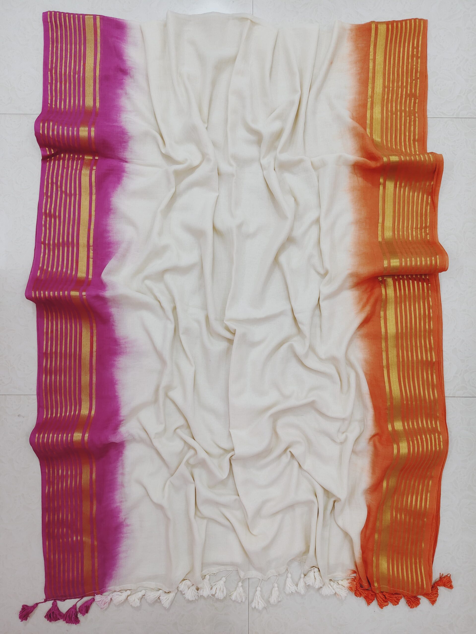 Beautiful zari border mul cotton tie-and-dye saree crafted with soft and breathable mul cotton fabric.