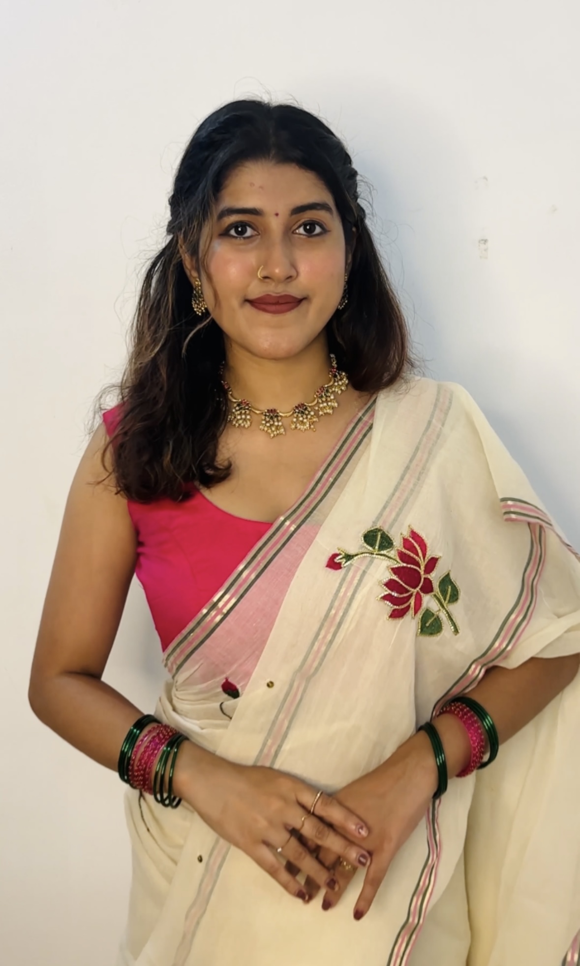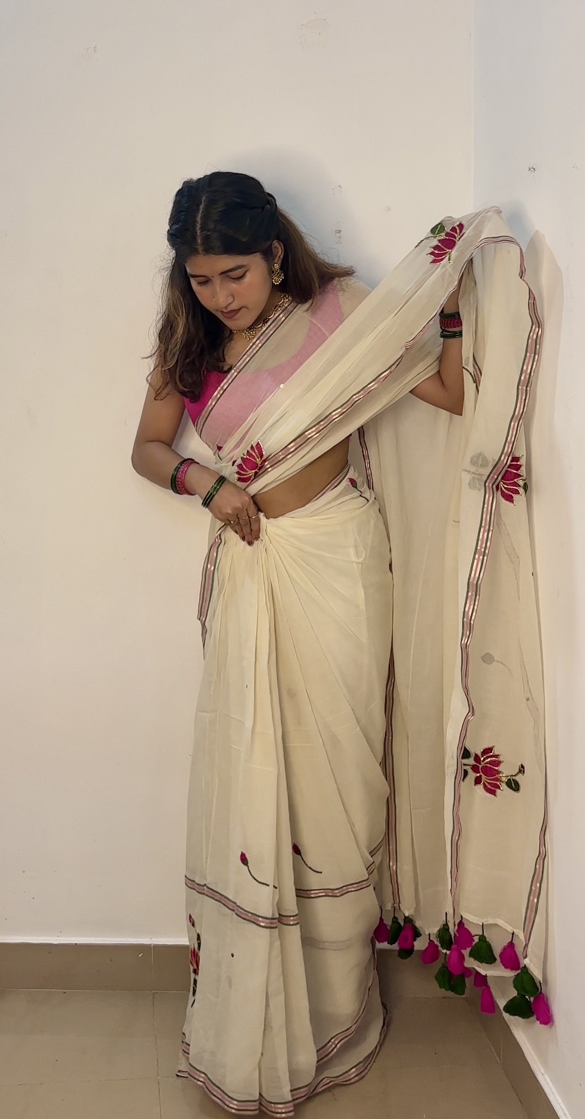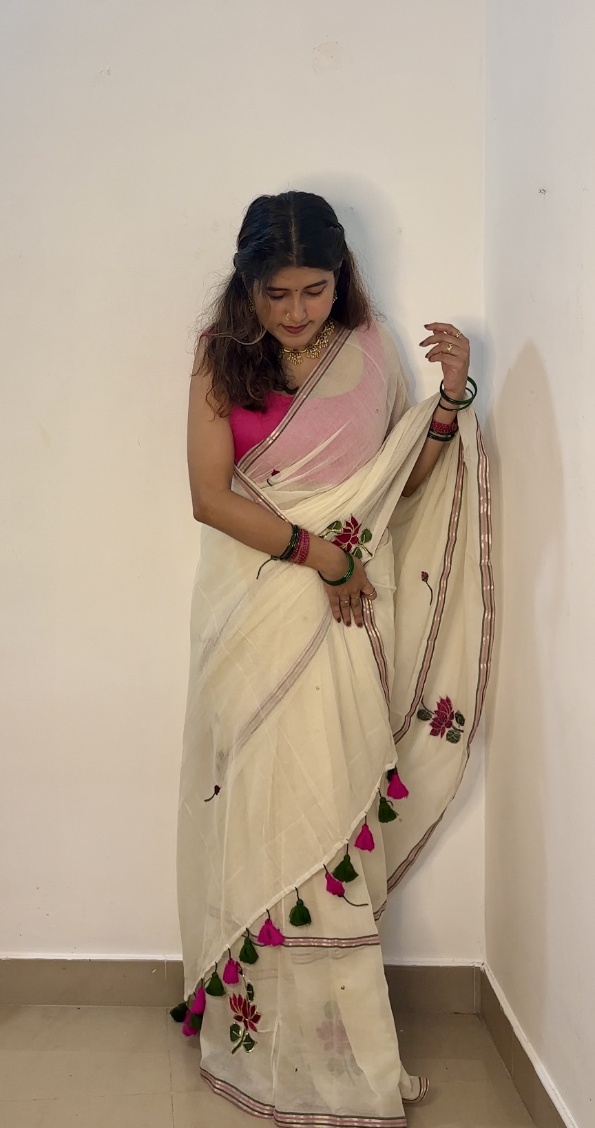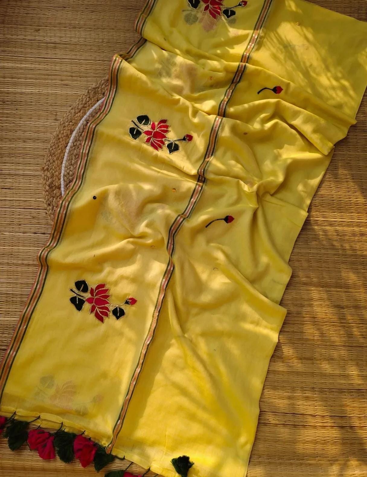 ✨ A graceful blend of traditional craftsmanship and modern elegance. The beautiful lotus embroidery with intricate pitta work and subtle sequins adds a rich, festive look while the soft mulmul fabric keeps it comfortable for all-day wear.