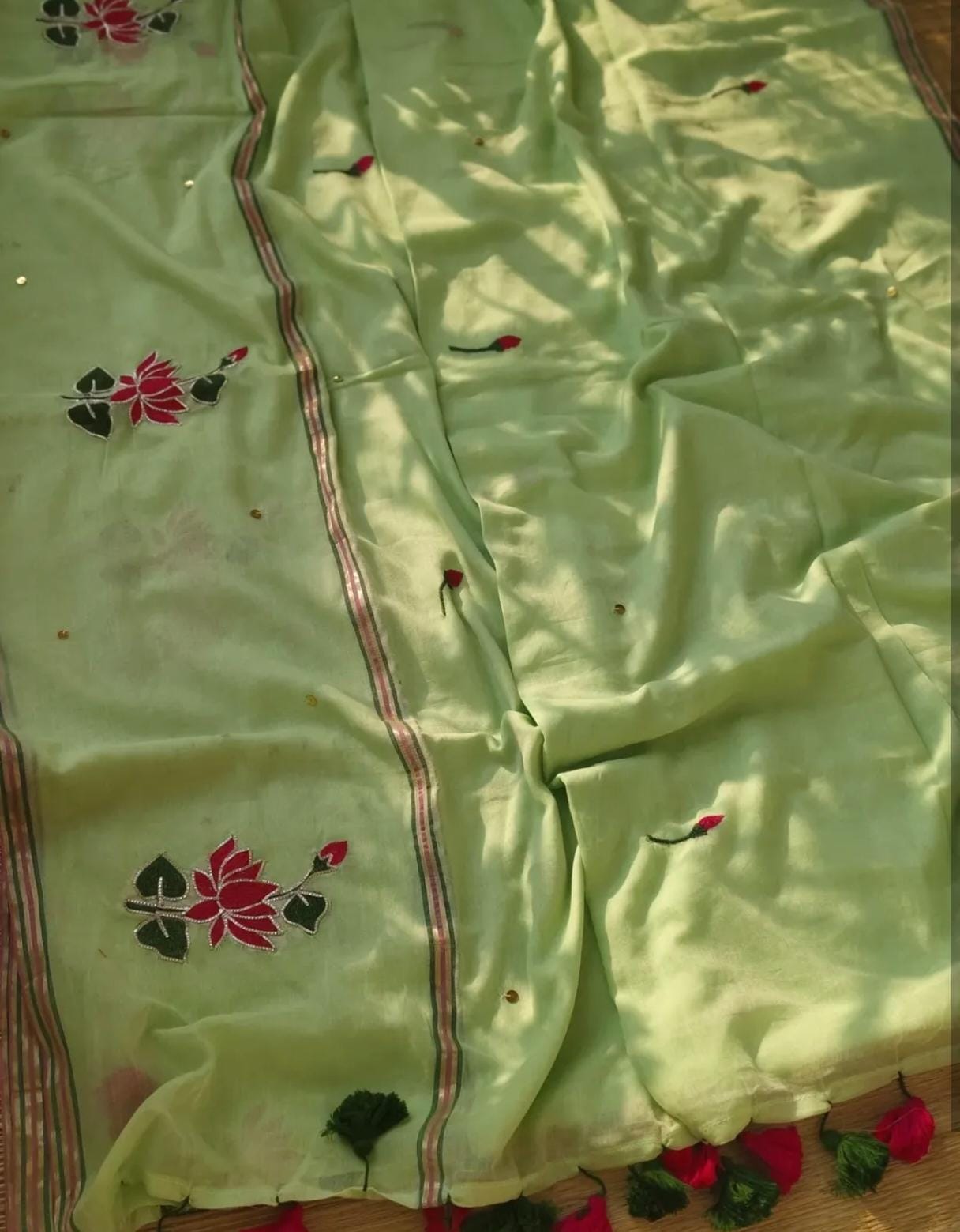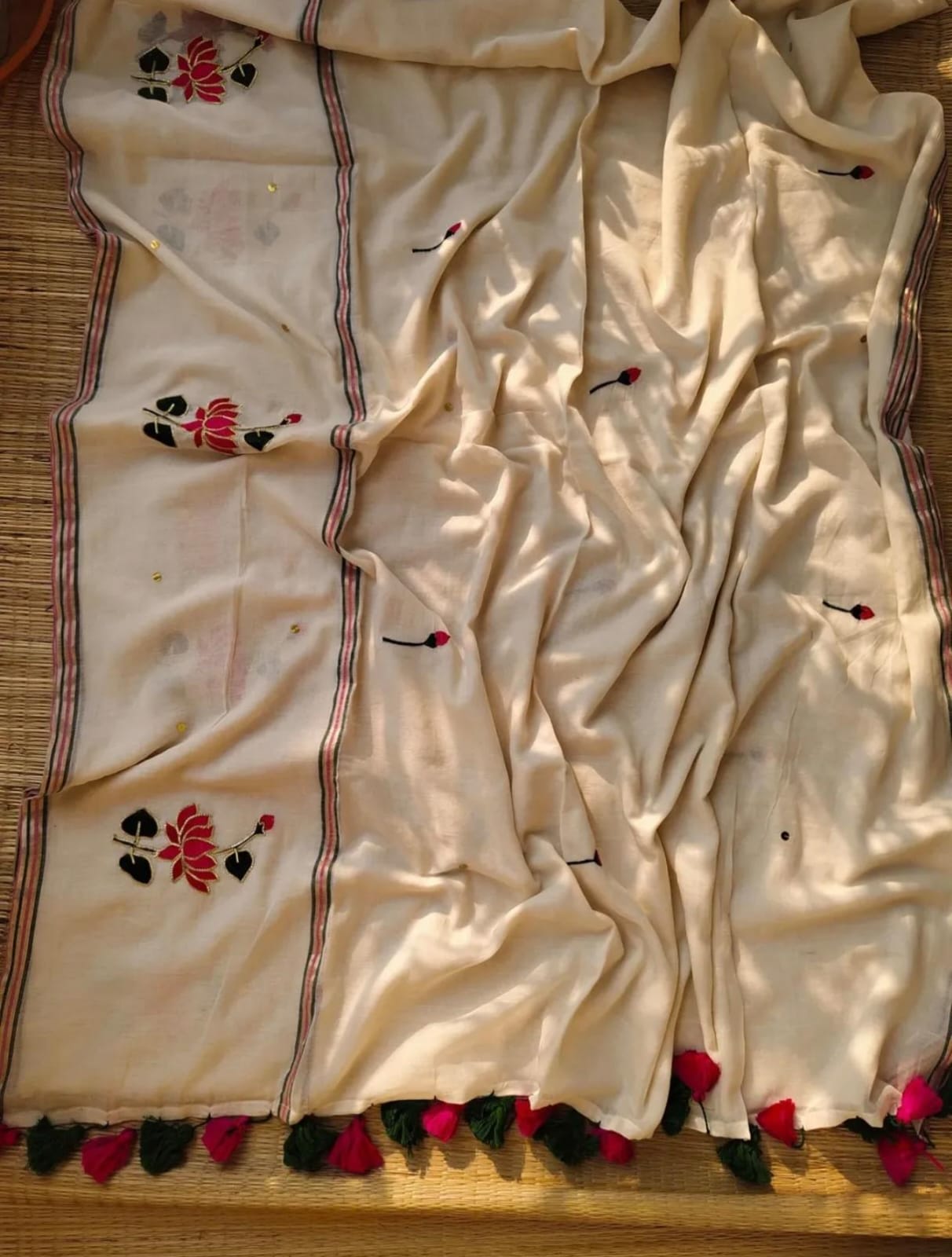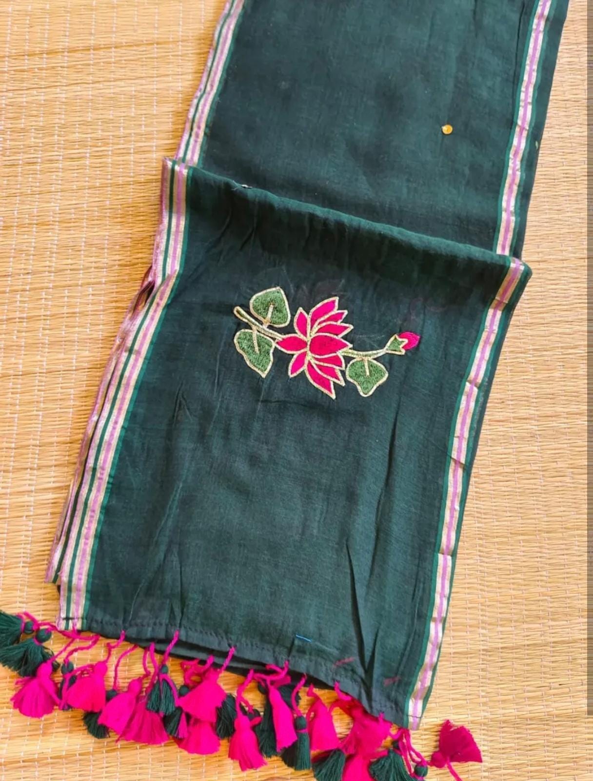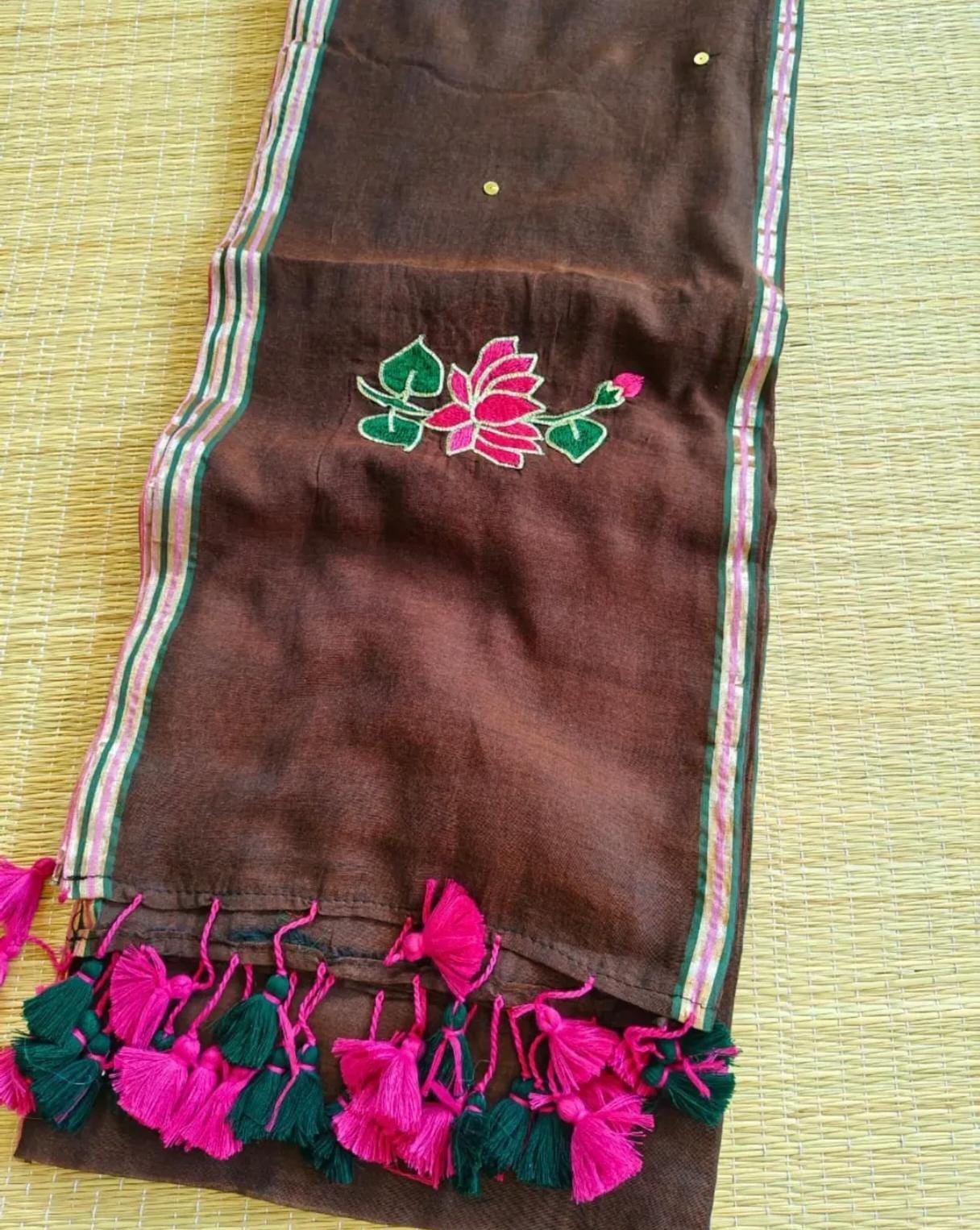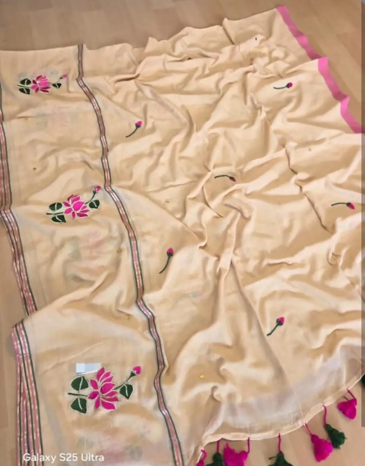 Pure Mulmul Saree with Lotus Motif Embroidery, Pitta Work & Sequins