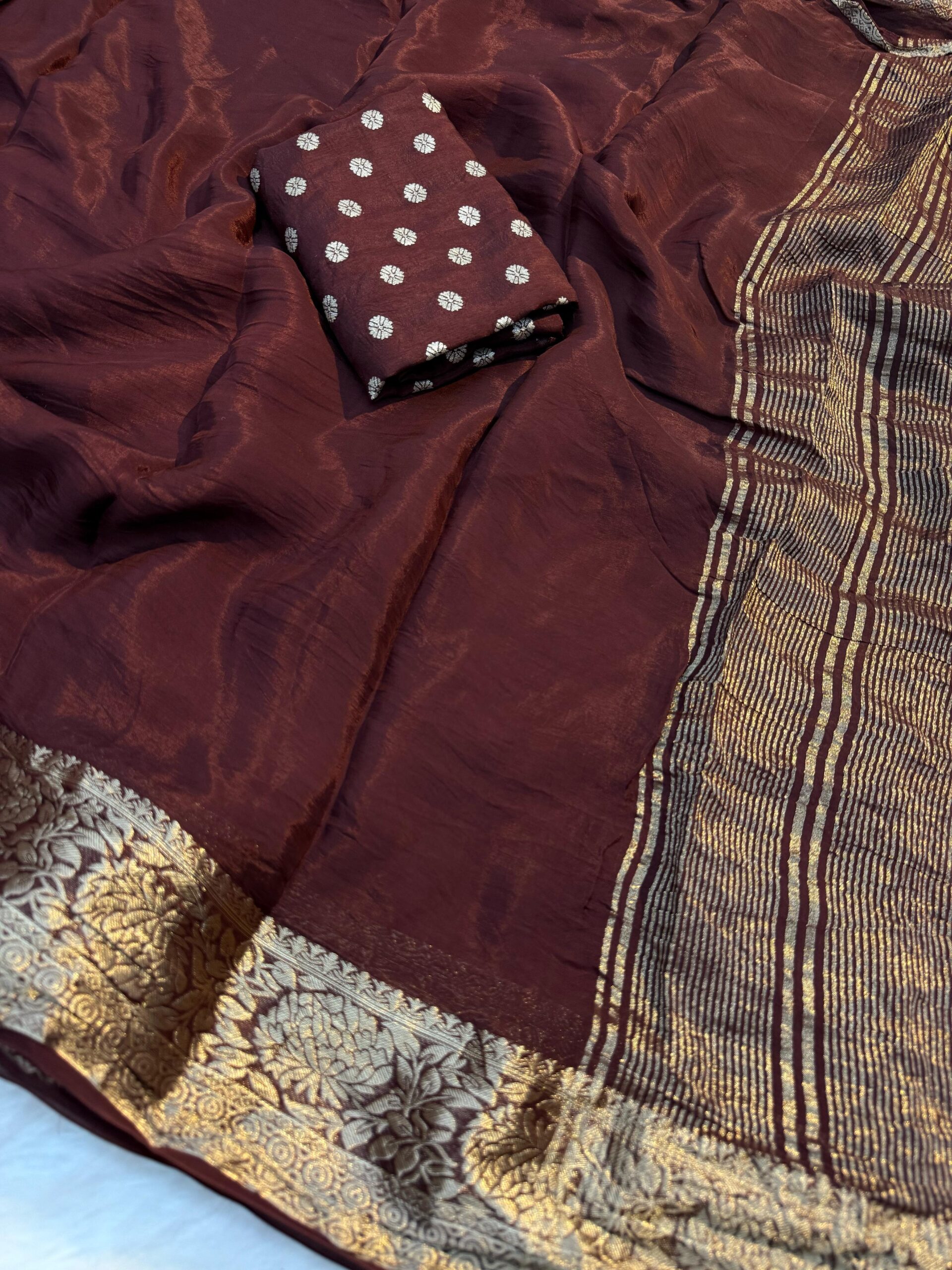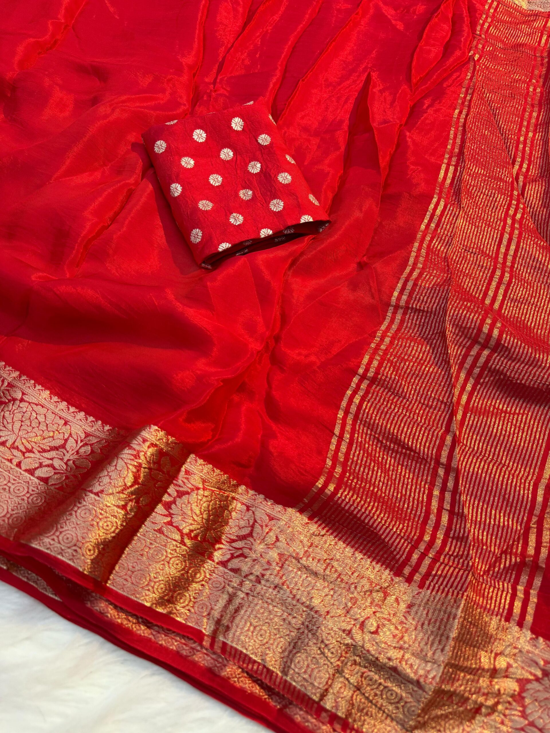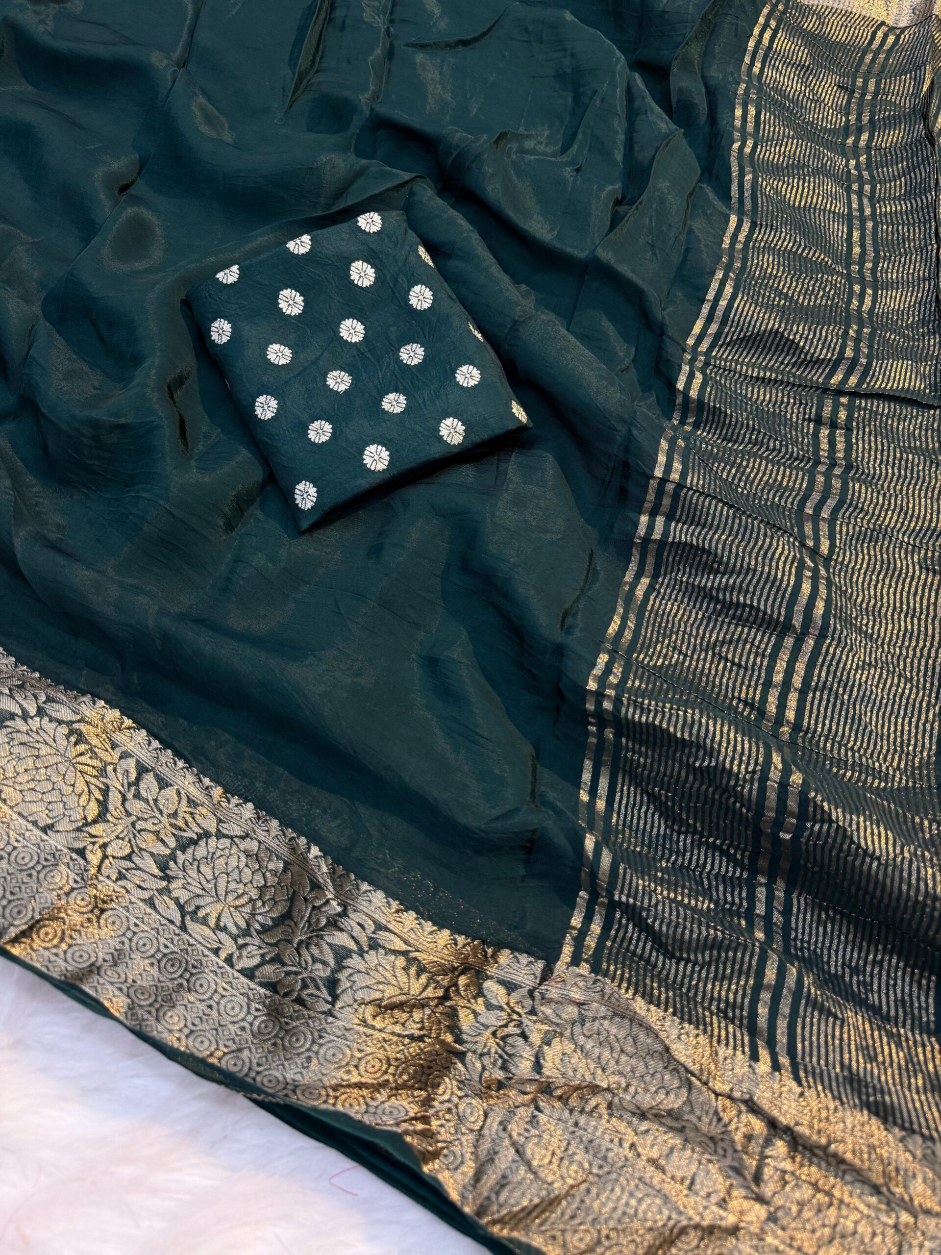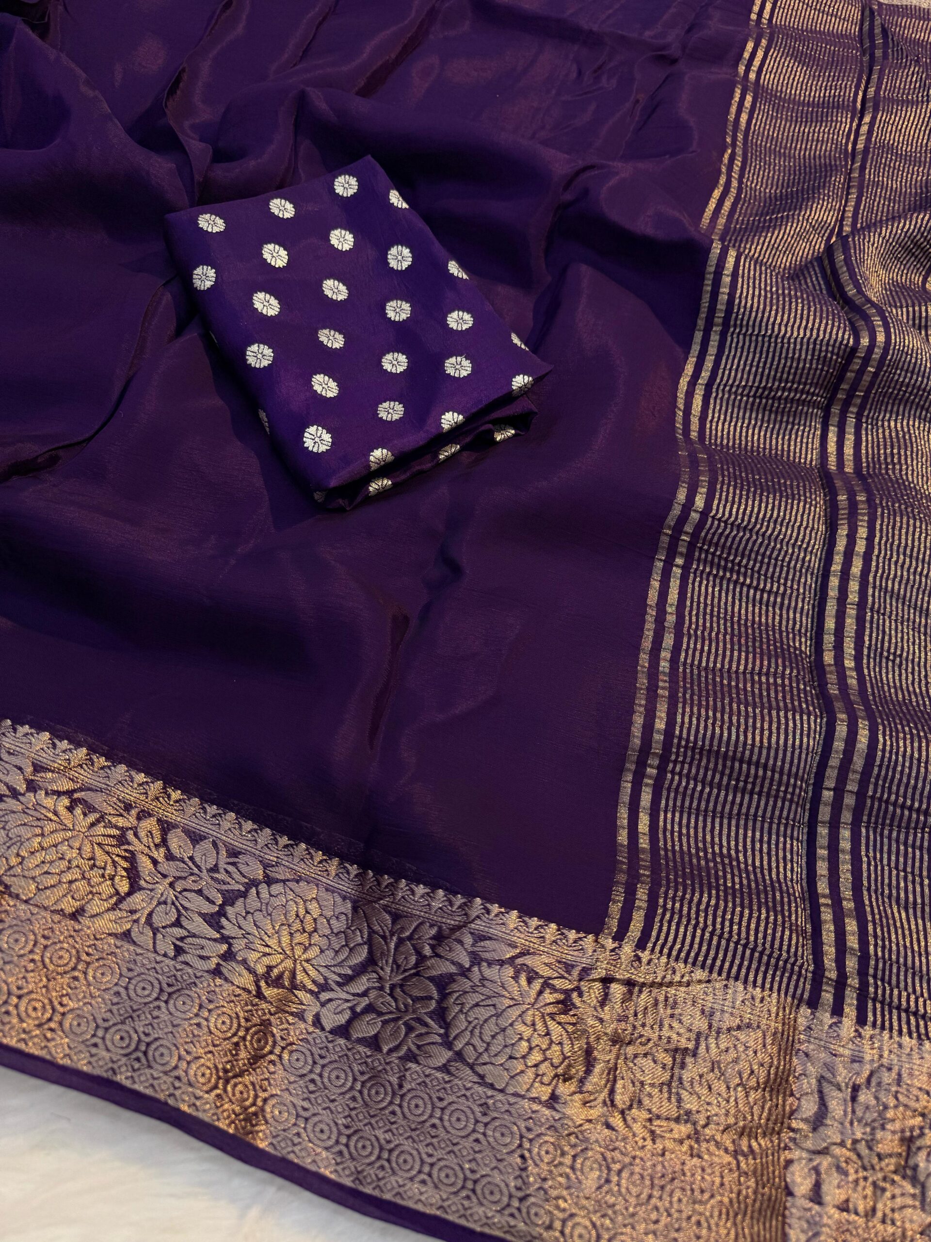 Introducing the epitome of softness and sophistication – the Pure Soft Viscose Crepe Silk Saree by Chinkaari Collections. This masterpiece is made from premium viscose crepe silk, giving it an incredibly smooth and luxurious feel. The zari border pattern adds a touch of traditional charm, while the zari butta blouse complements the saree perfectly, offering a balanced look of grace and richness.