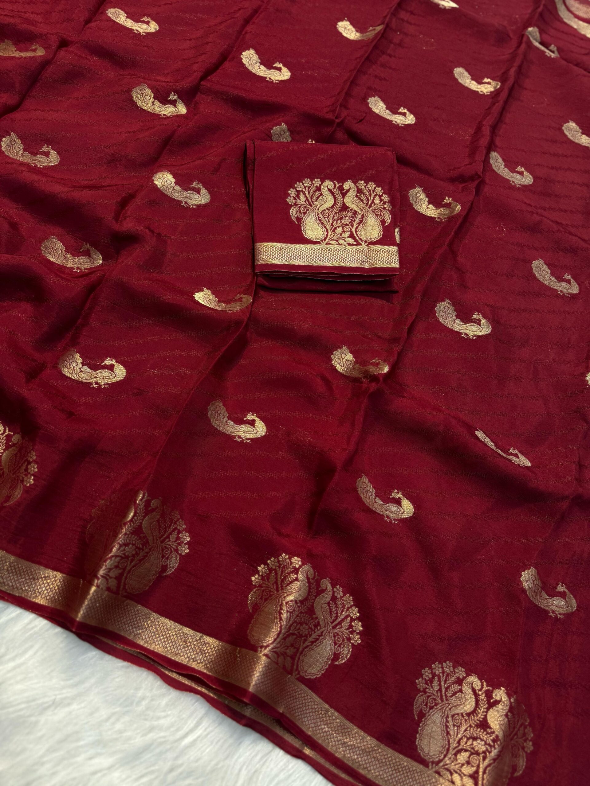 Designed with elegant leheriya-style lining and delicate bird figure motifs all over, this saree beautifully blends traditional patterns with a modern twist. The vibrant design and soft texture make it a perfect choice for parties, festive occasions, or evening gatherings.