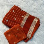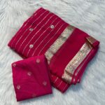 The ensemble comes with a matching Dola silk blouse, complementing the saree perfectly and adding a luxurious finish to the overall look. Whether it’s for a wedding, celebration, or special event, this saree ensures you stand out with effortless grace and charm.