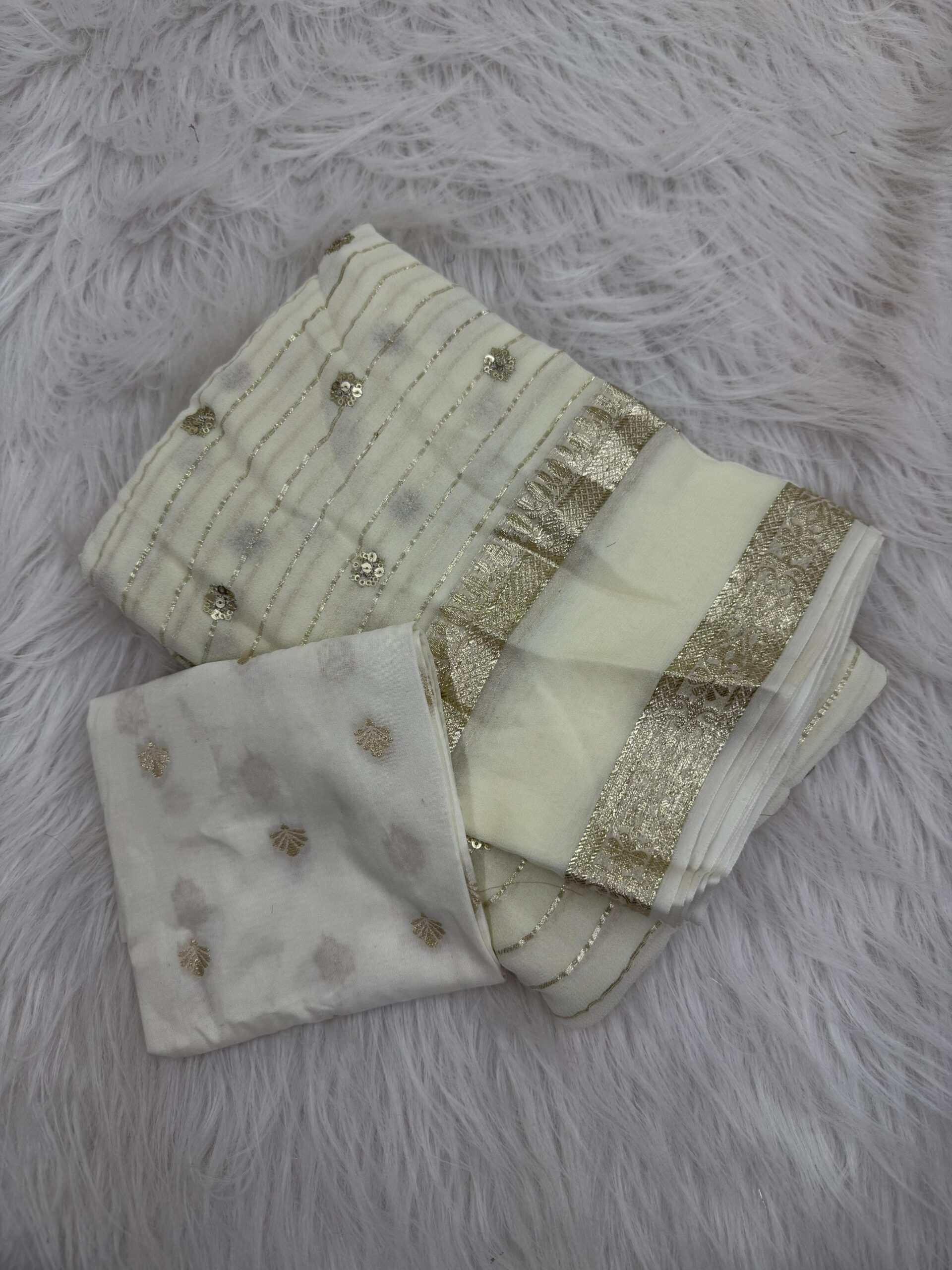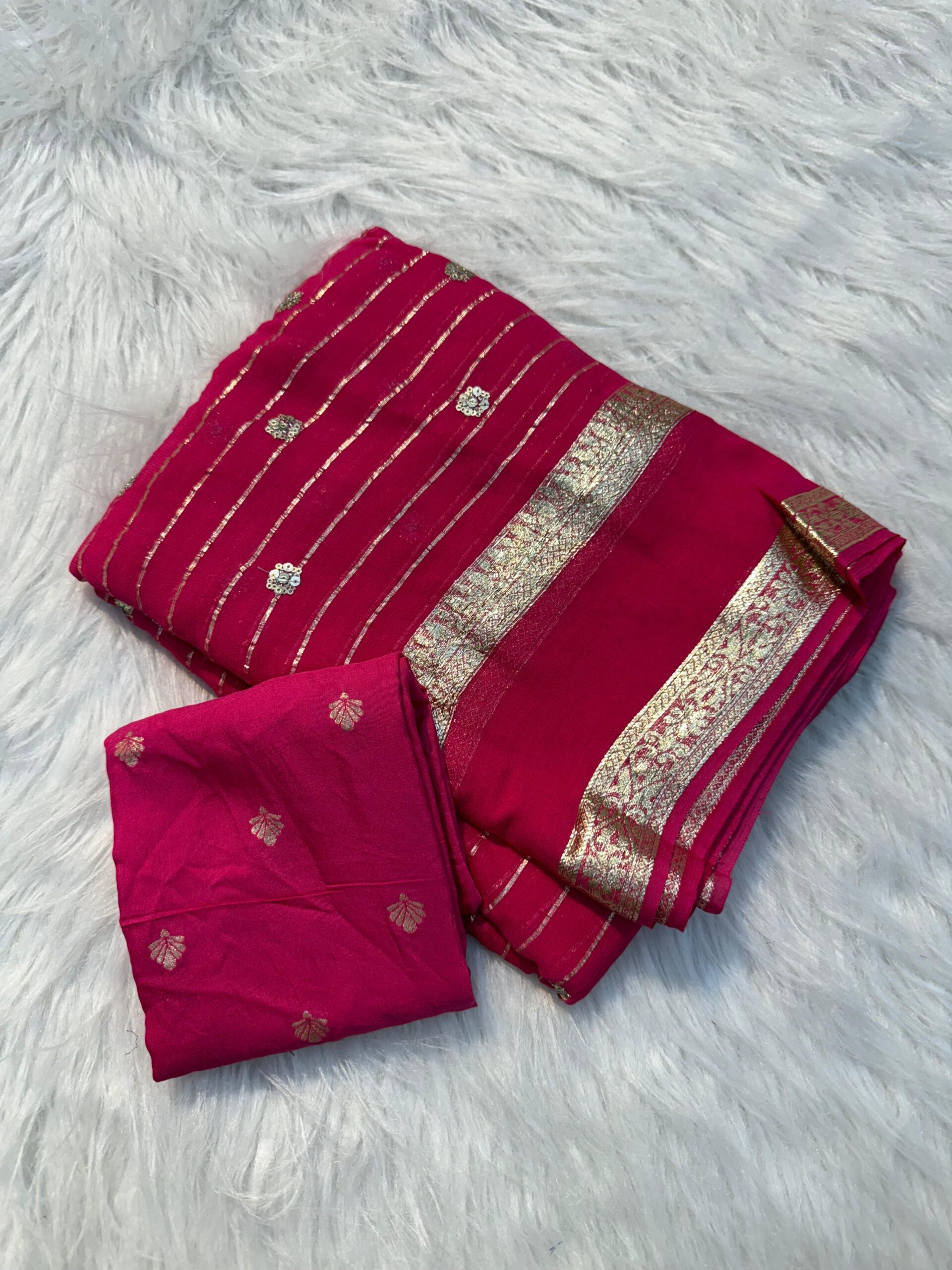 Indulge in timeless elegance with this exquisite Pure Soft Viscose Lining Georgette Saree, a perfect blend of luxury, comfort, and craftsmanship. The saree is beautifully adorned with all-over sequin butti work, creating a subtle shimmer that catches the light with every movement. Its small zari border adds a refined traditional touch, balancing simplicity with sophistication.