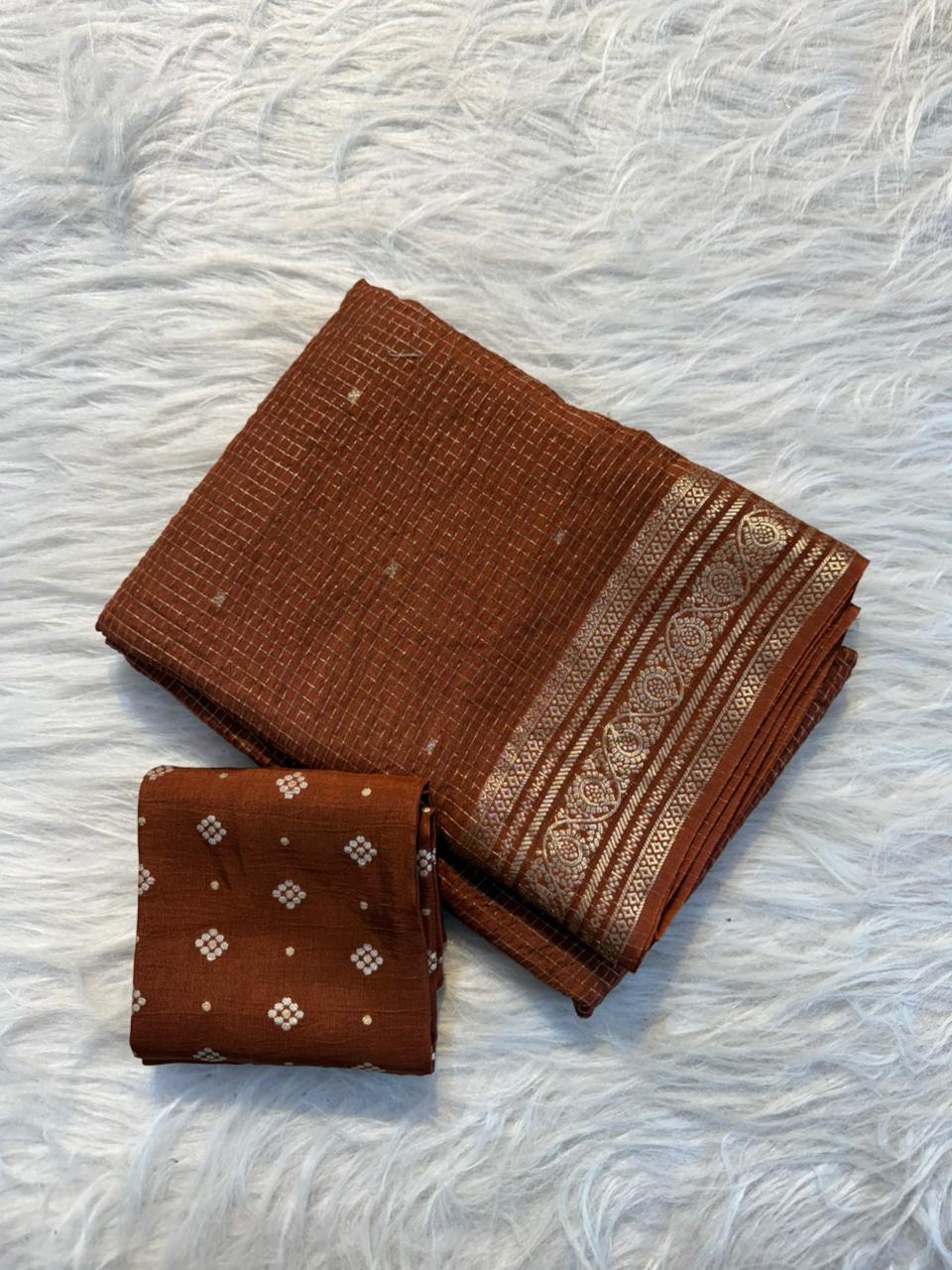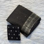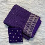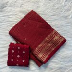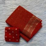 This saree is paired with a Russian dola blouse fabric adorned with small butti, perfectly complementing the saree’s classic design. The lightweight and flowing fabric makes it comfortable while maintaining a grand festive appeal.