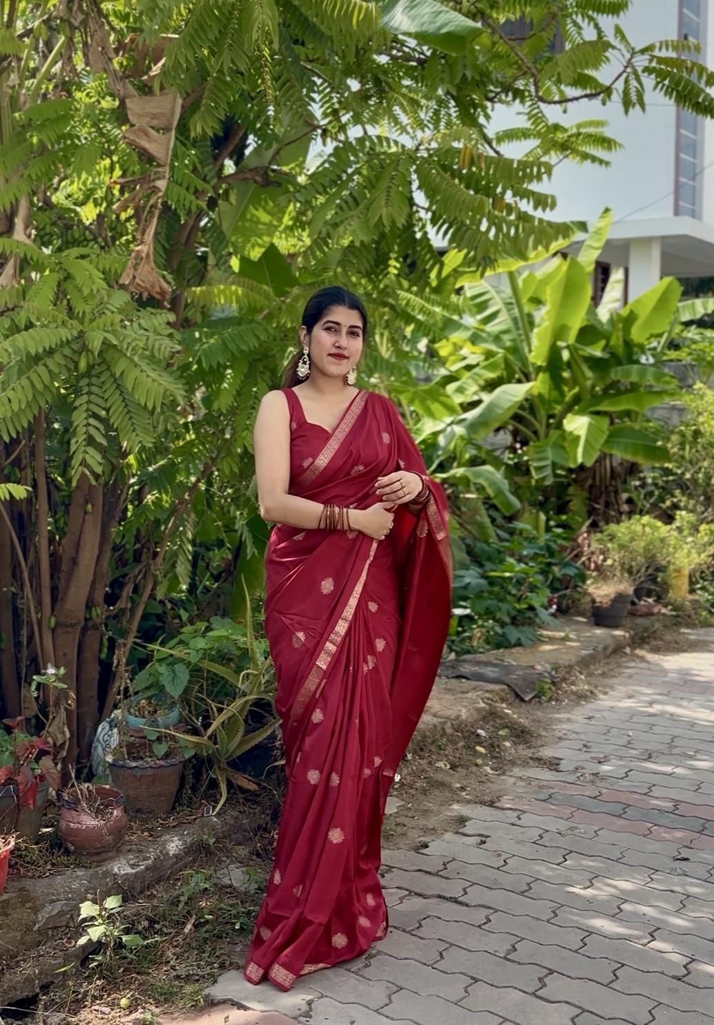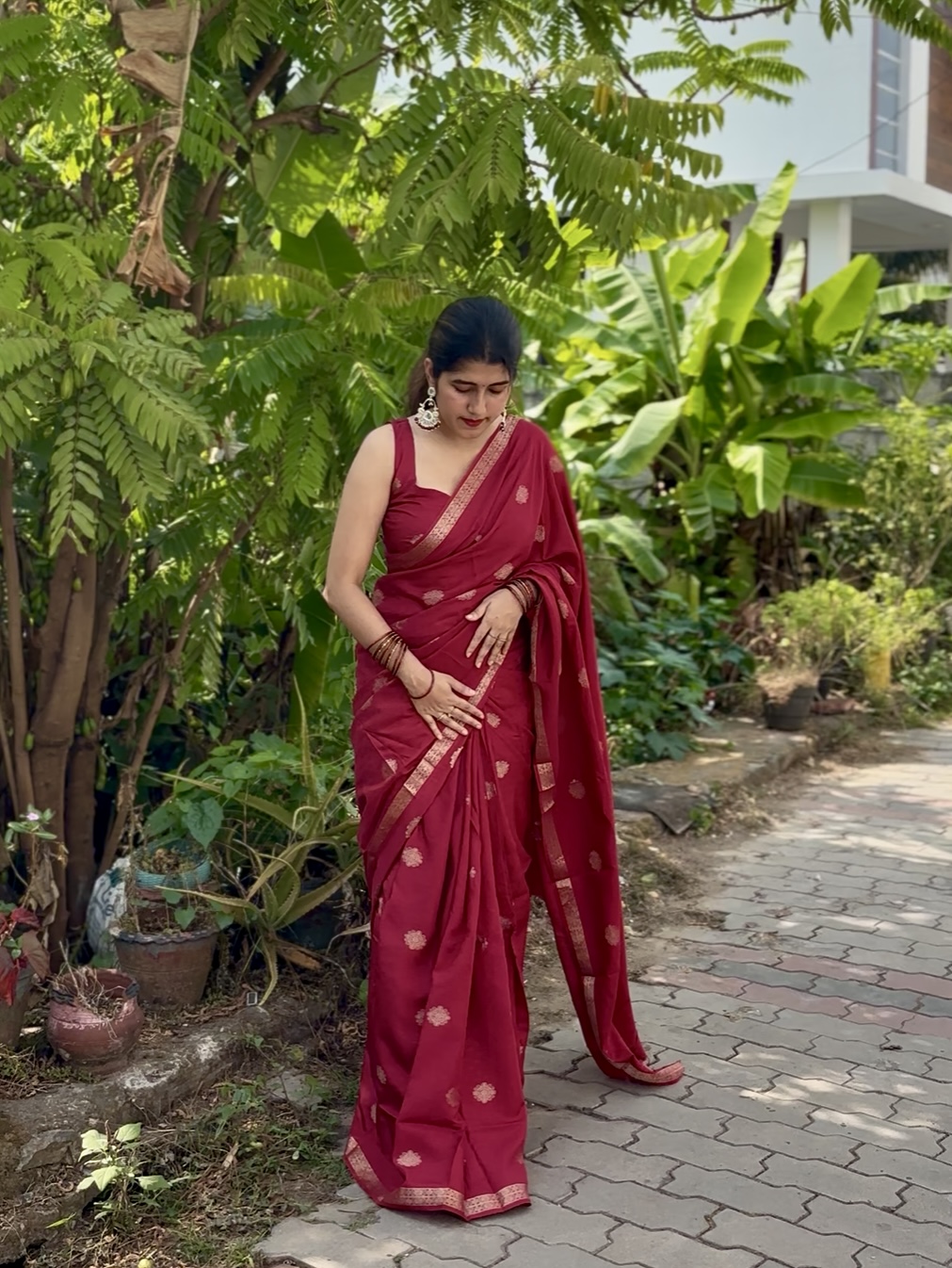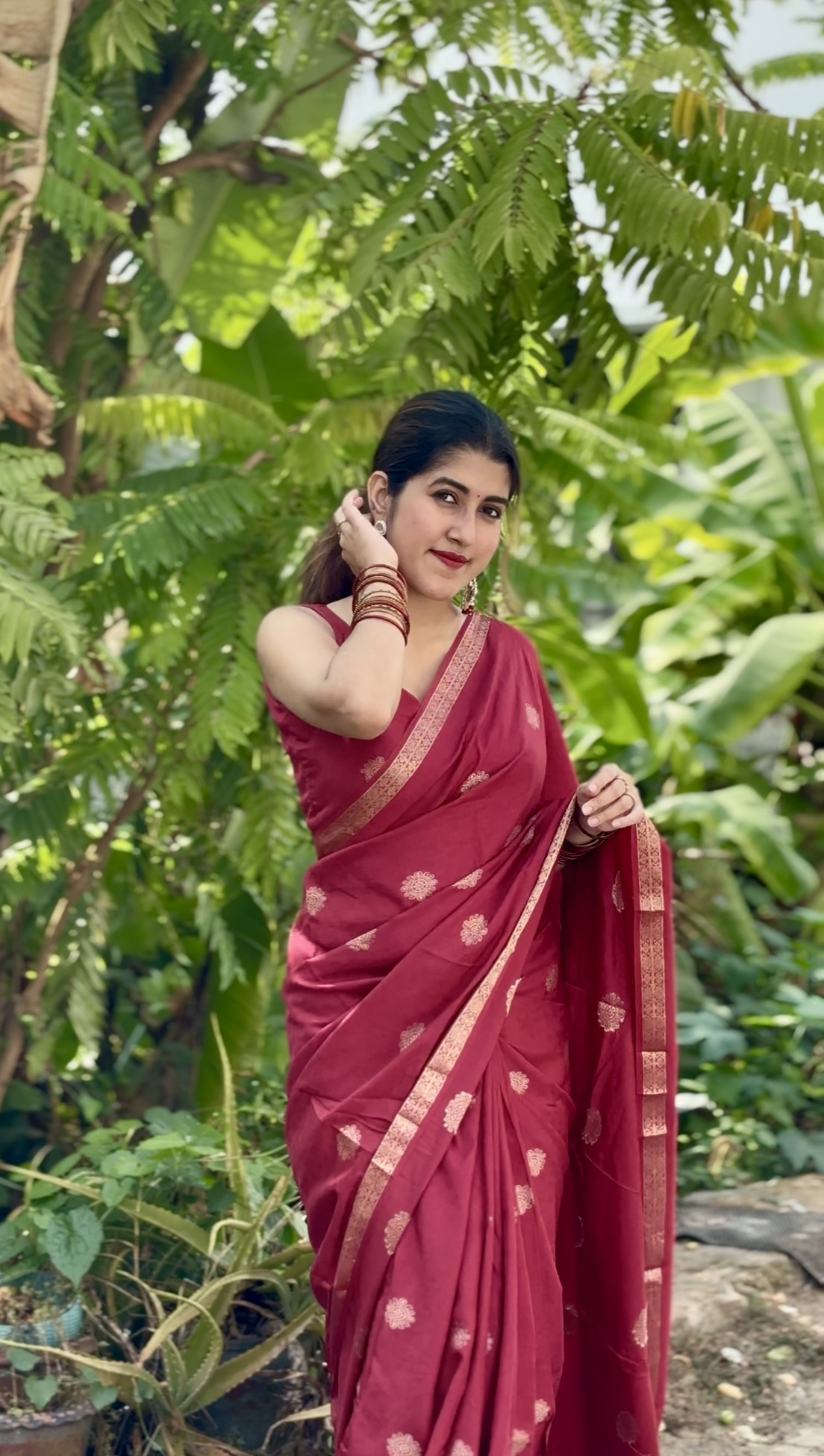 Crafted in rich pure viscose dola fabric, this elegant saree features a delicate small zari border paired with a beautiful self-weave pattern. The highlight is the graceful big butta figure woven all over the saree, giving it a timeless and classy appeal. Comes with a matching running blouse to complete the look.