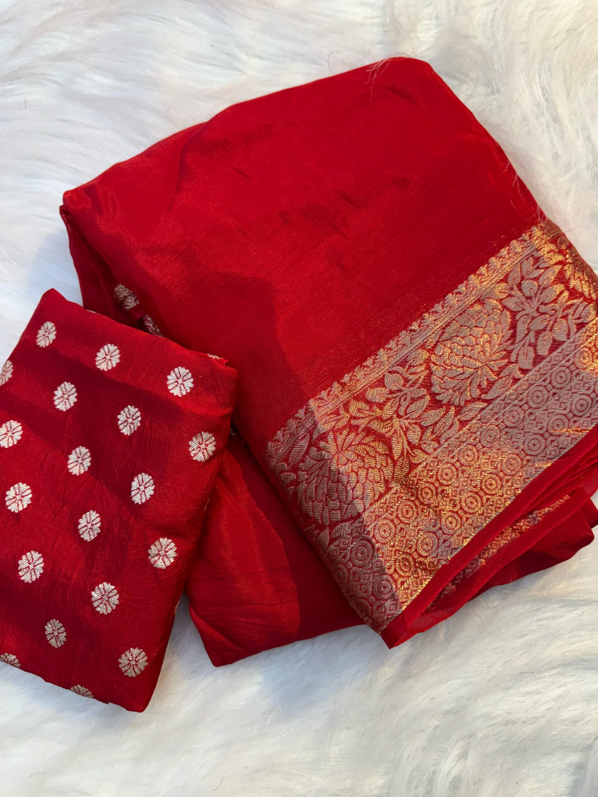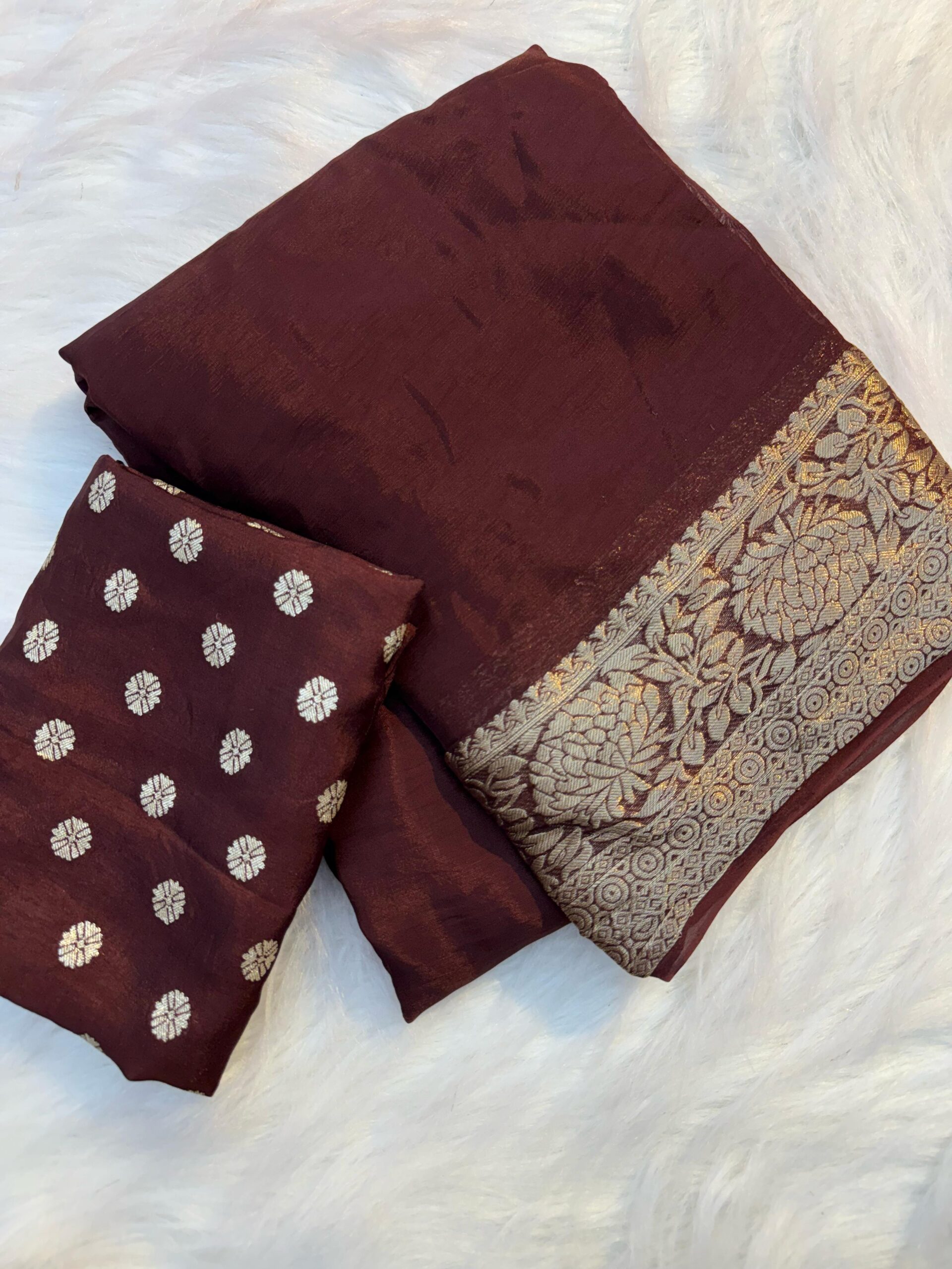 This saree comes adorned with a beautifully woven jacquard border that adds a touch of regal sophistication, while the elegant pallu design completes the drape with finesse. What makes this ensemble truly party-ready is the addition of a designer viscose blouse — curated to complement the saree with style and flair, perfect for festive gatherings, receptions, or evening soirees.