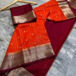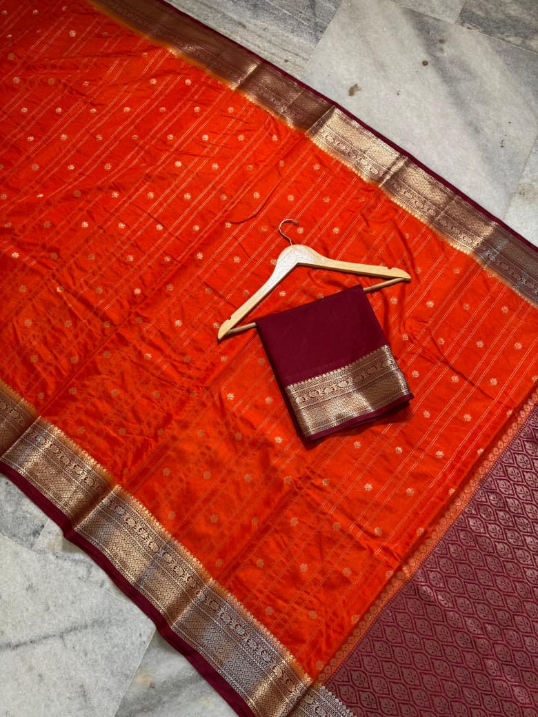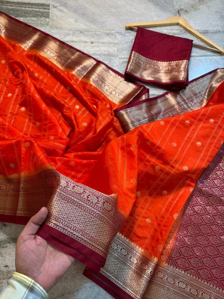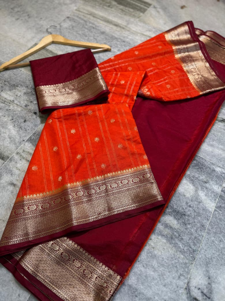 Elegant semi Banarasi handloom saree made from premium semi chinya silk fabric, featuring fancy gold zari weaving lining buti design all over the saree for a rich traditional finish. Comes with a fancy zari weaving contrast pallu and a plain contrast blouse with border, giving a classy festive-ready look.