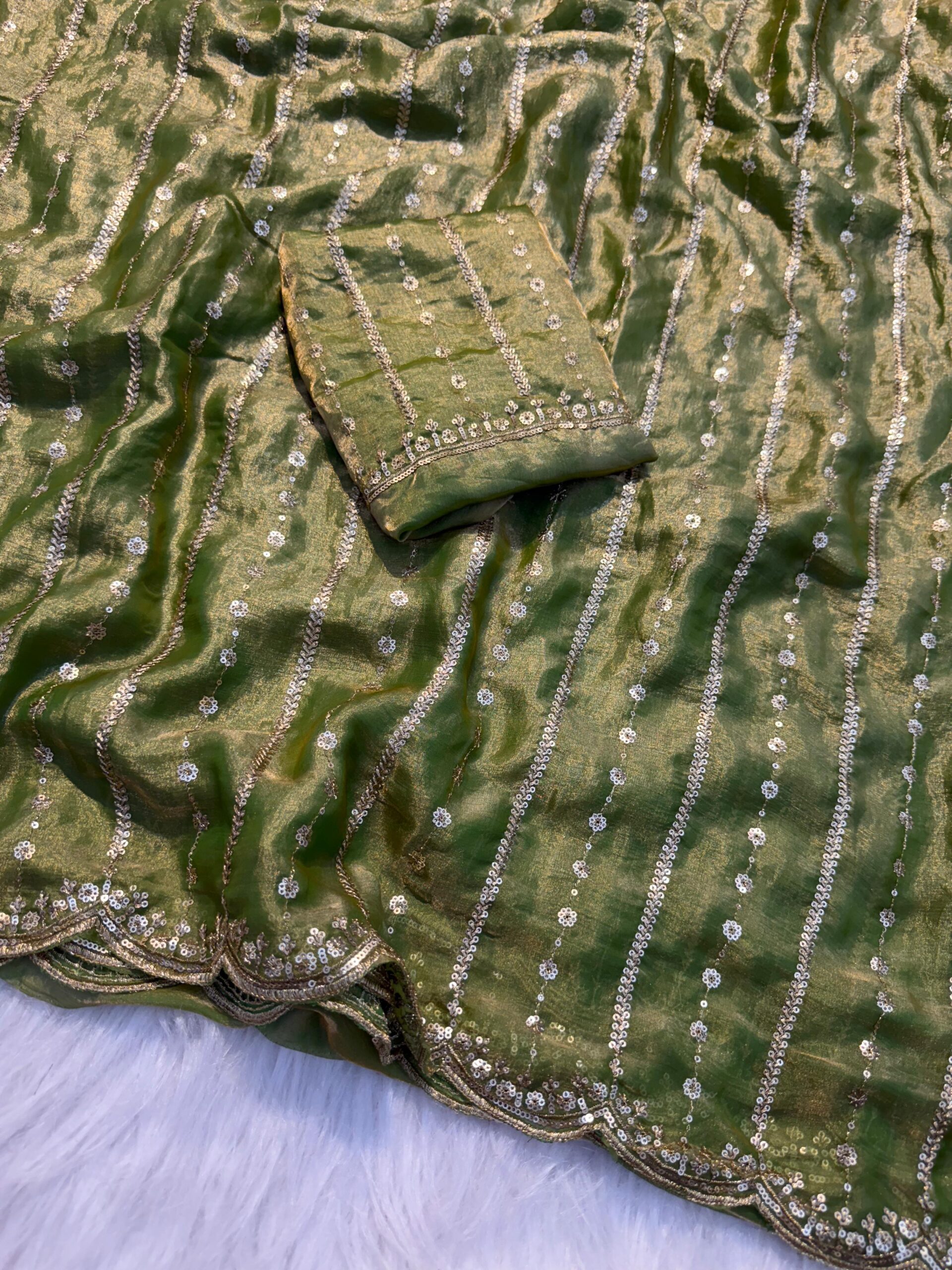 The highlight of this masterpiece is its designer sequin and C-pallu embroidery work, intricately done to create a mesmerizing shimmer across the saree. Each detail showcases fine craftsmanship, making it a perfect choice for festive celebrations, weddings, and grand occasions.
