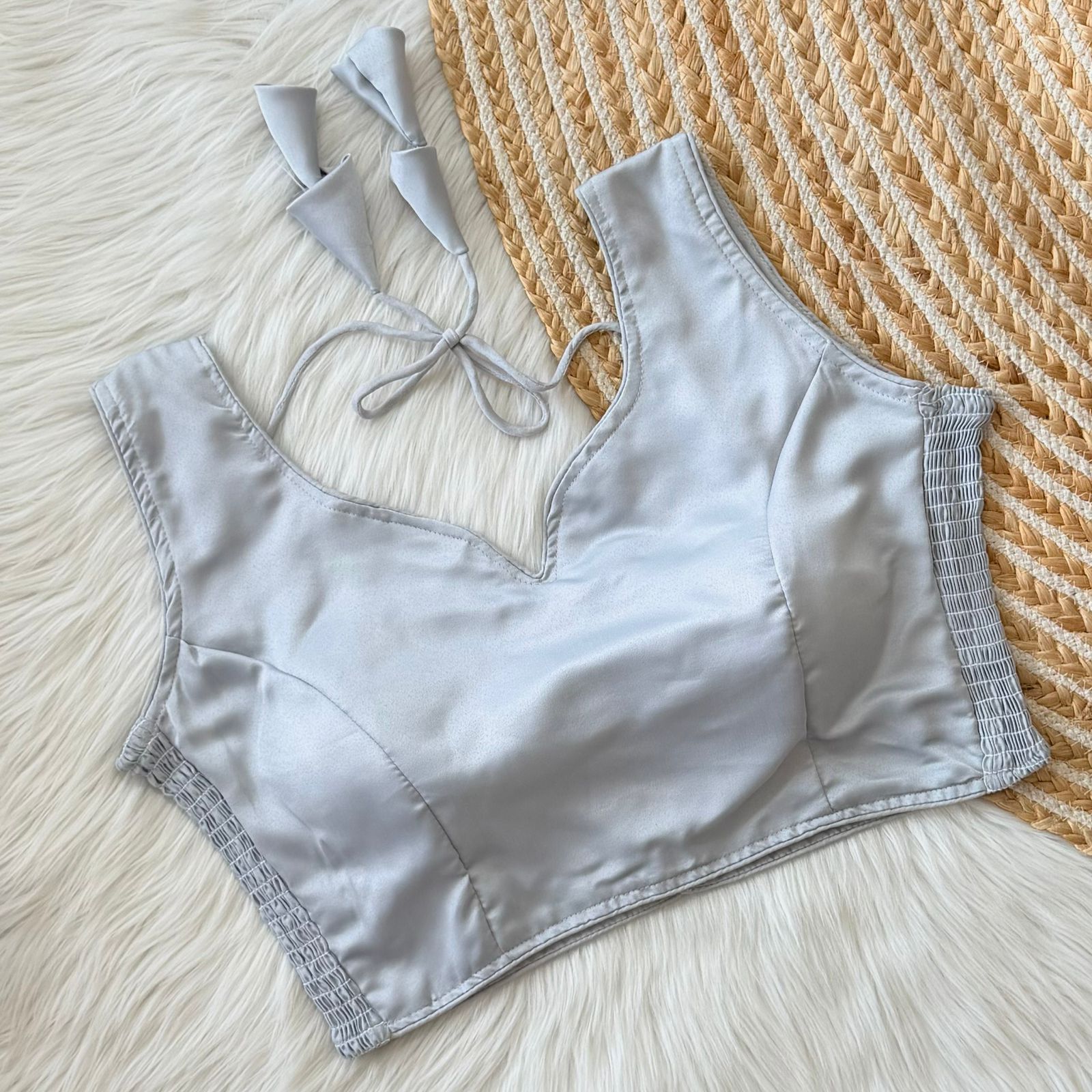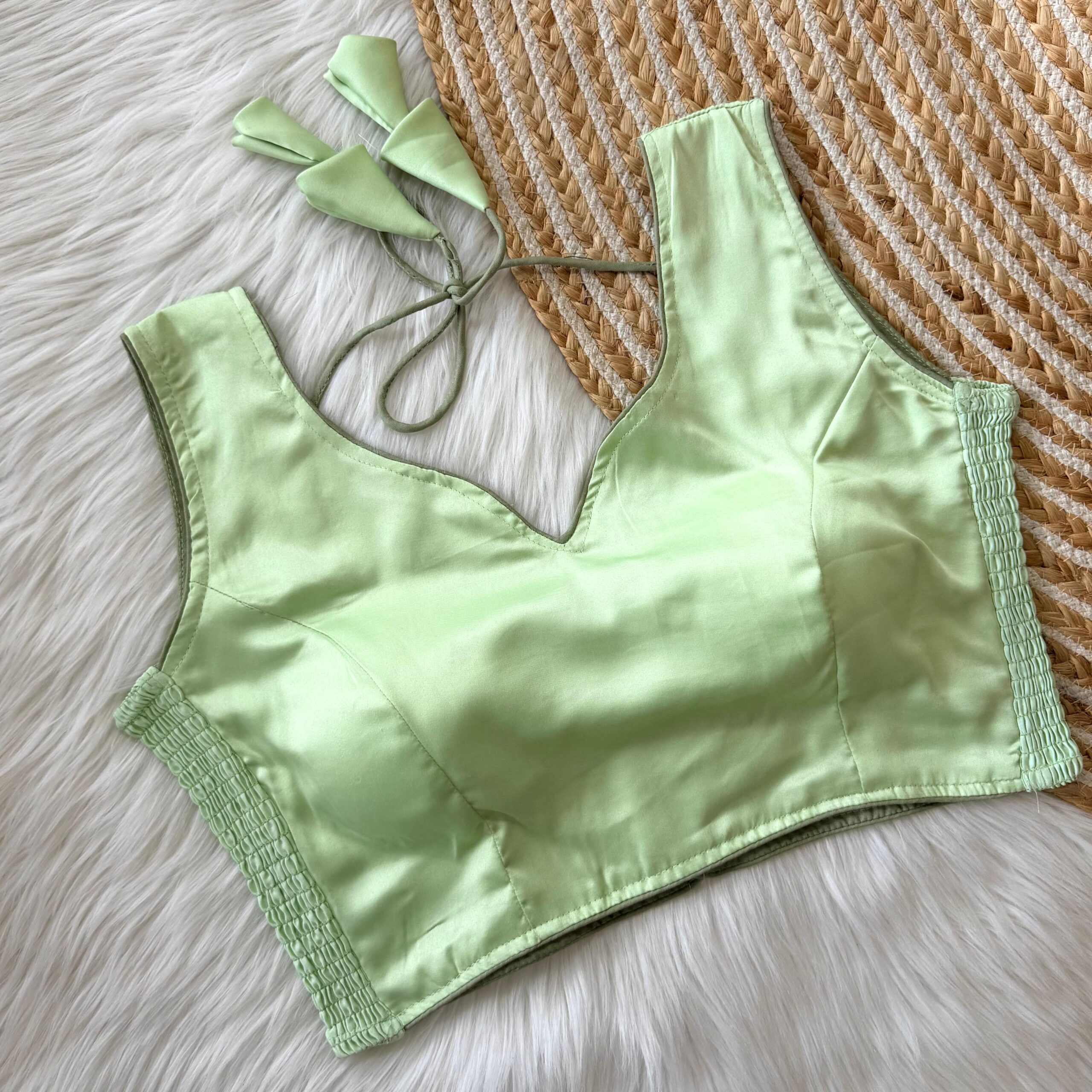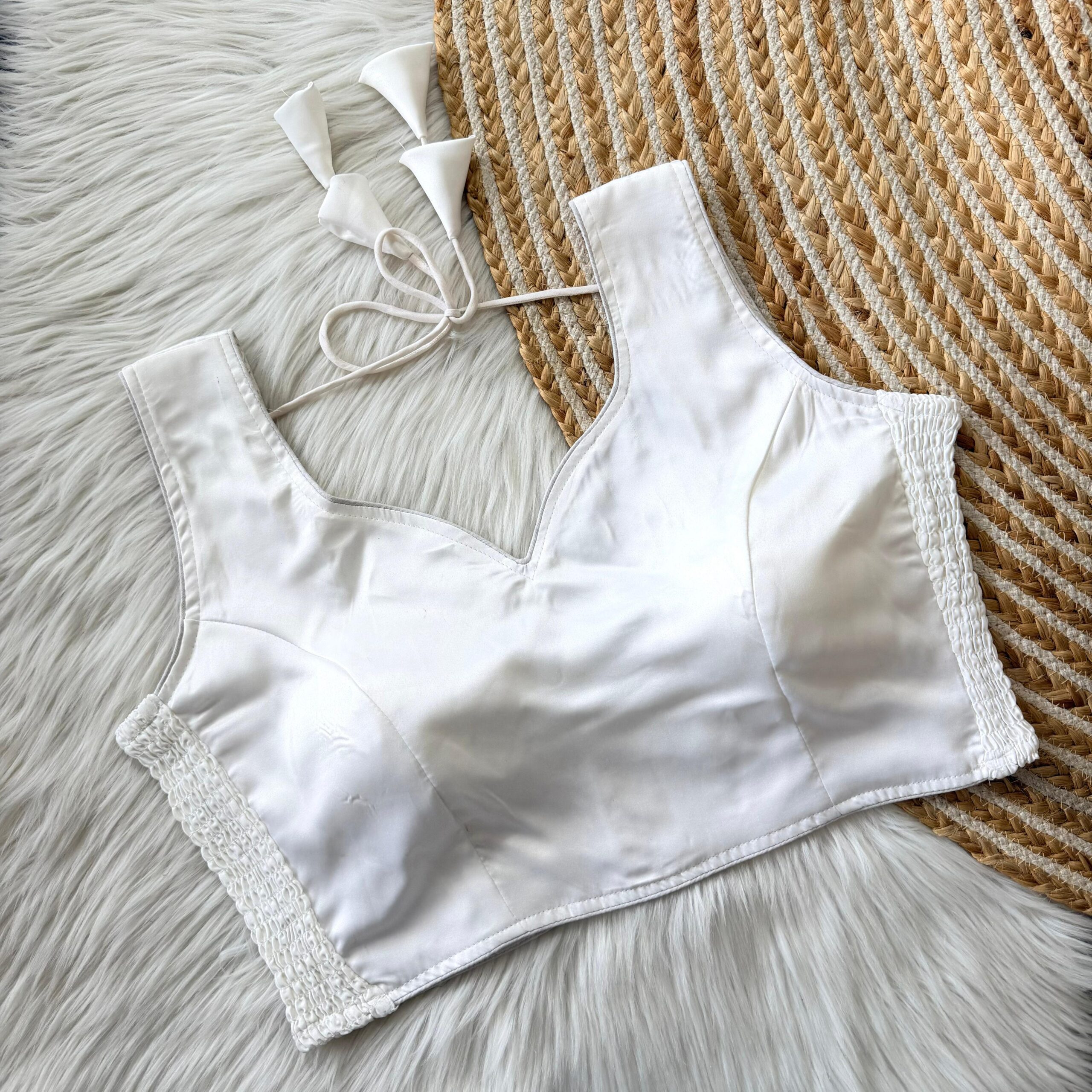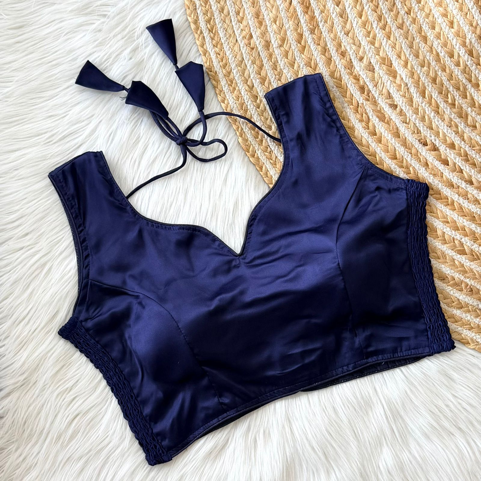 This sleeveless blouse comes with built-in padding for added convenience and a structured look, making it perfect for effortless styling. Its versatile design pairs well with both traditional and contemporary sarees.